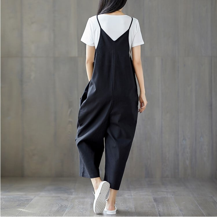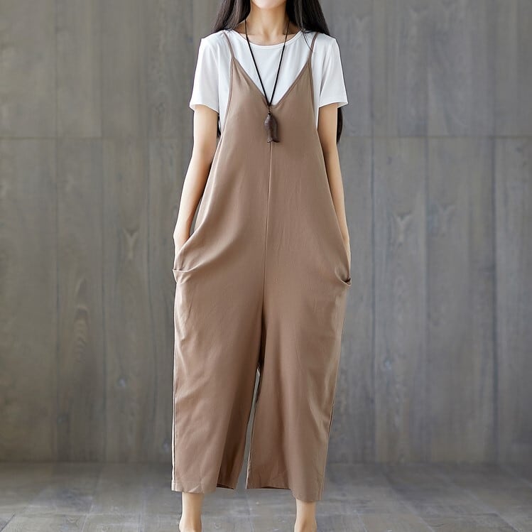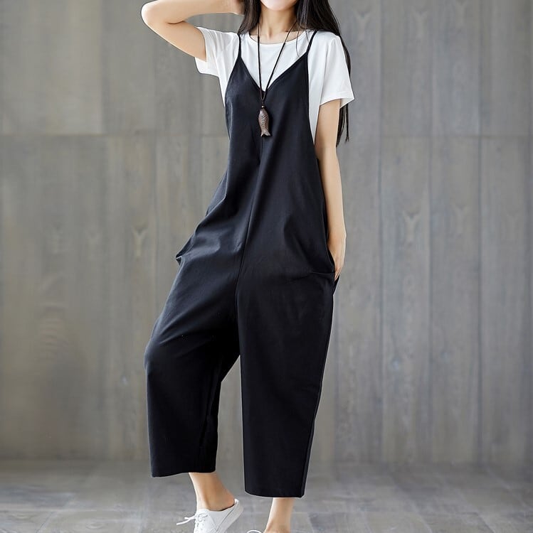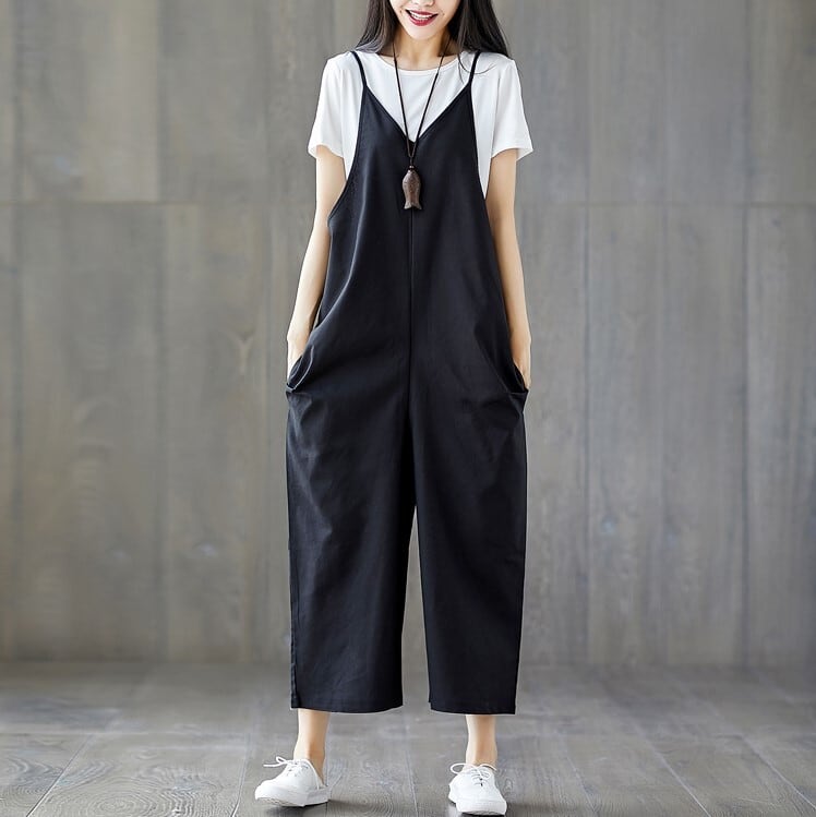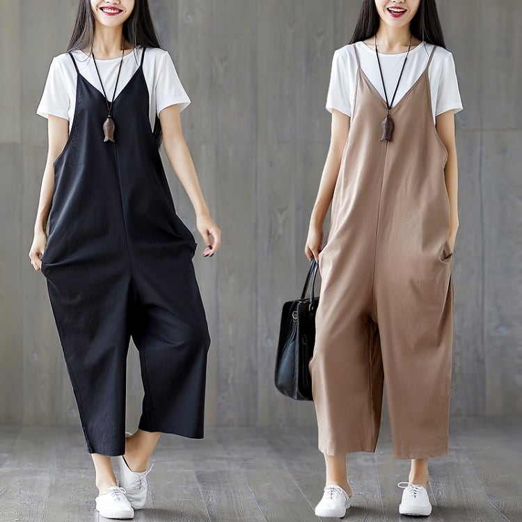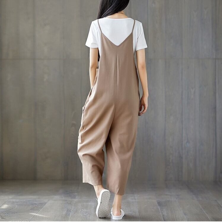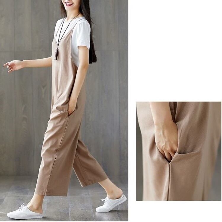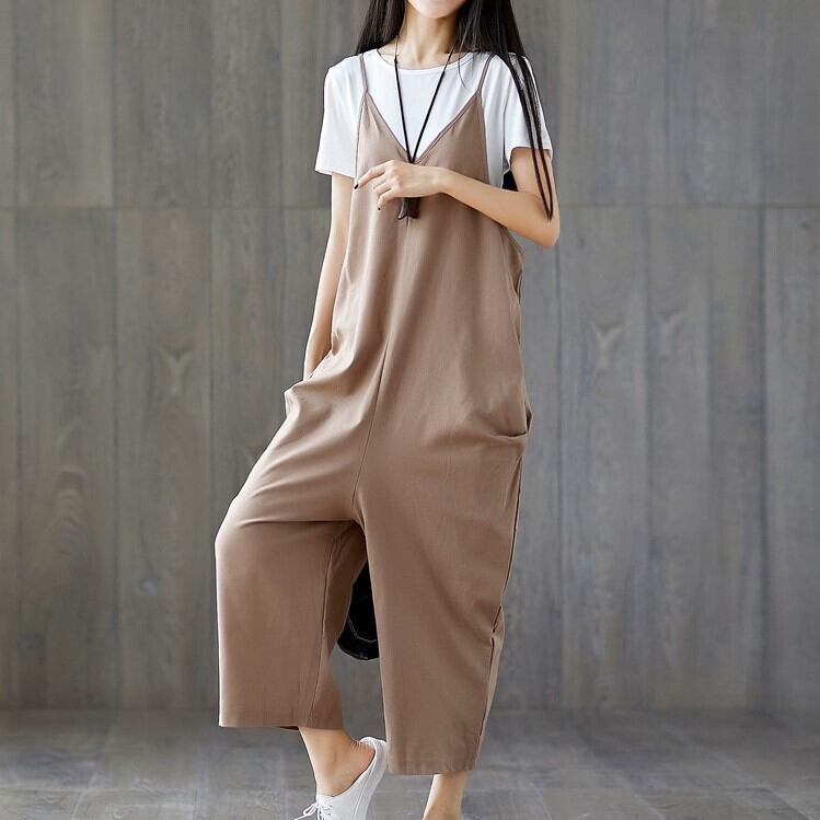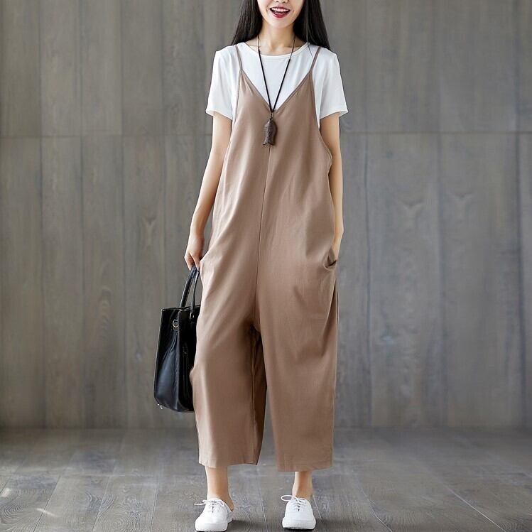 全2色 大きいサイズ オールインワン サロペット ワイドパンツ ストラップ 九分丈 ゆったり 体型カバー カジュアル デイリー 普段着 カーキ ブラック
