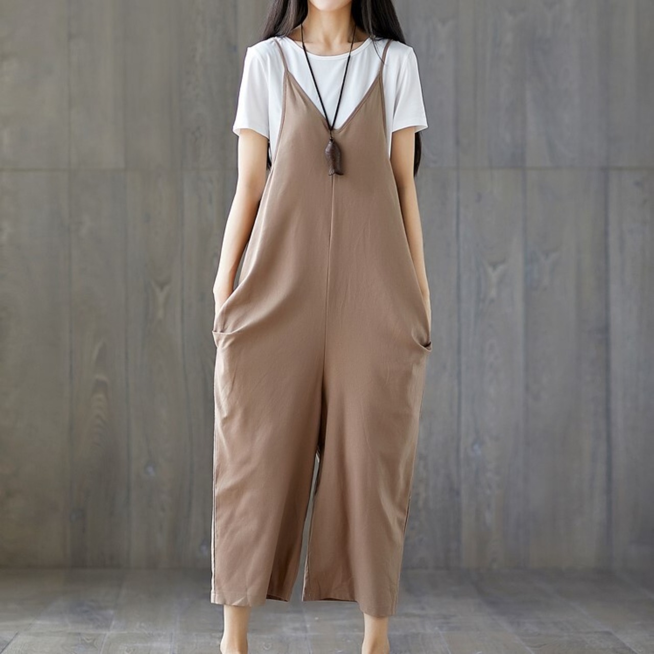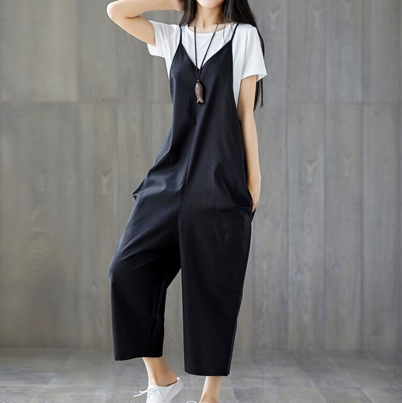 シンプルでゆったりシルエットのサロペット。