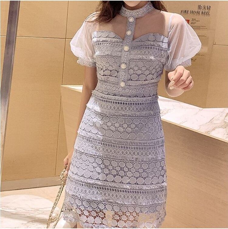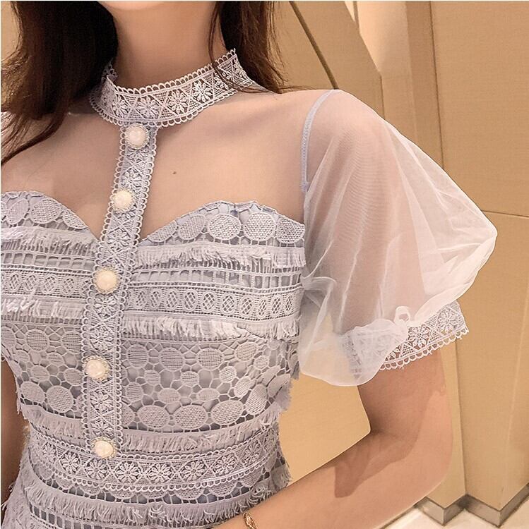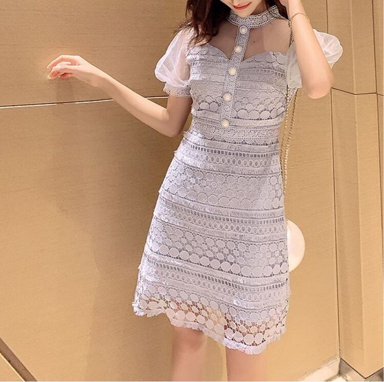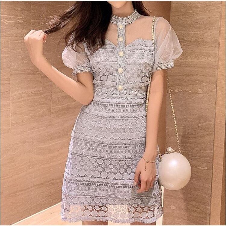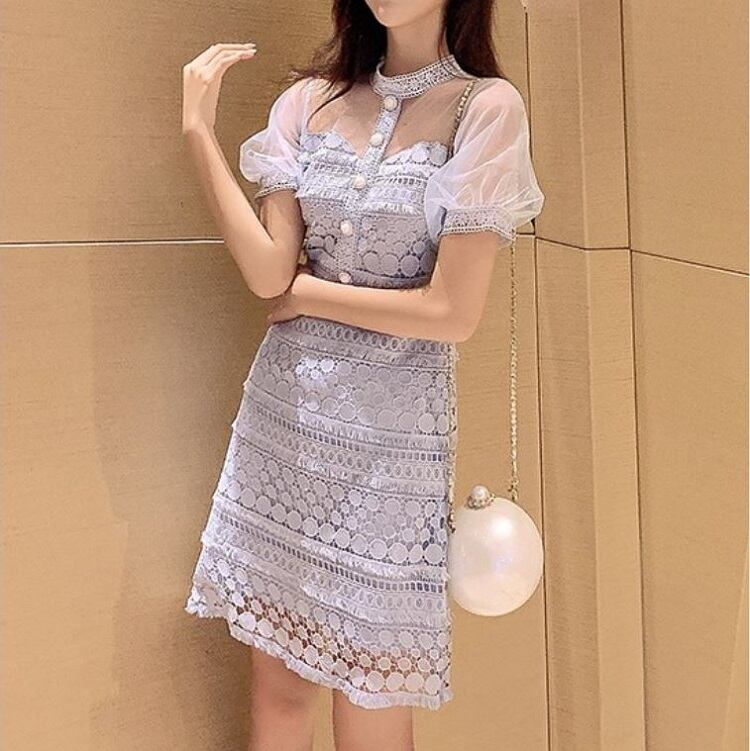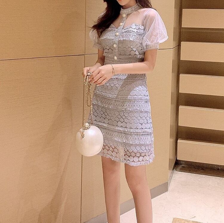 ミニワンピース ドレス シースルー レース 半袖 スリム フェミニン 清楚 パーティ フォーマル 夏