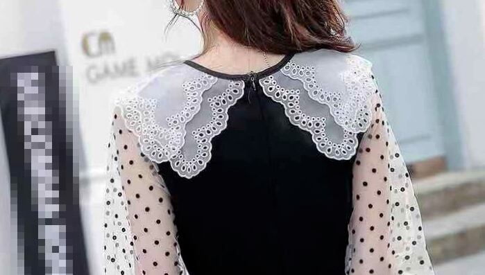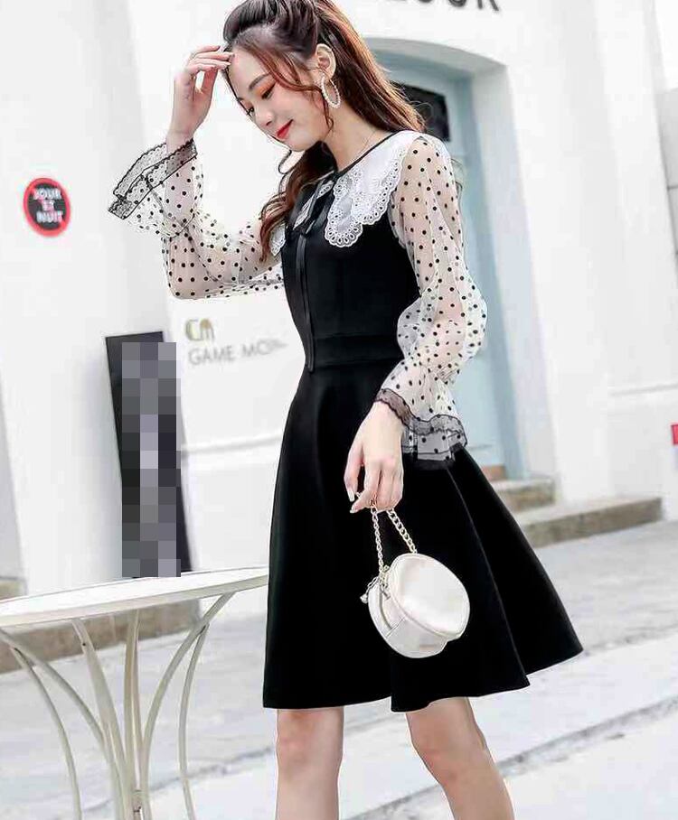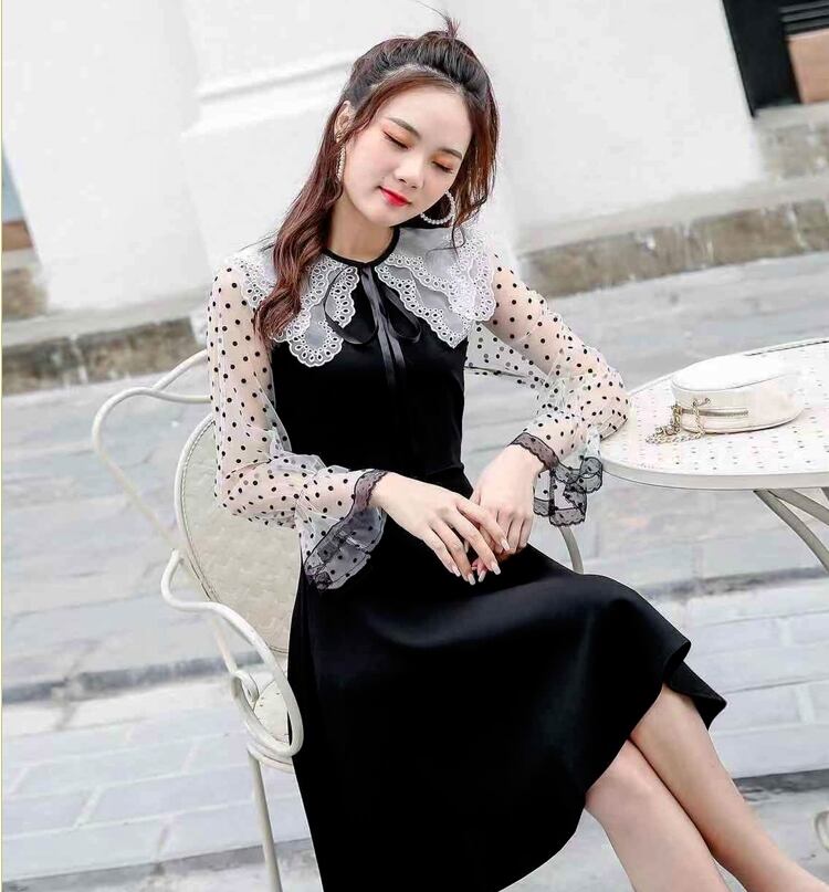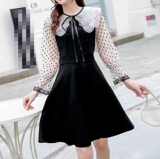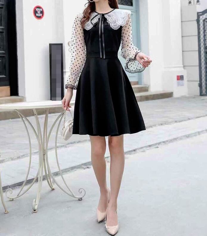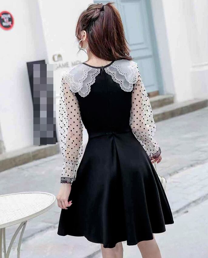 ワンピース ドレス ドット柄 ベルベット シースルー ショート丈 レース リボン クルーネック Aライン フレア スリム トランペットスリーブ きれいめ パーティー お呼ばれ ガーリー 可愛い カジュアル 春 夏