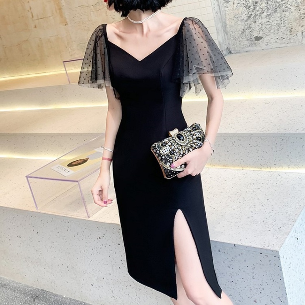 パーティドレス ワンピース イブニングドレス フレアスリーブ スリム タイト ひざ丈 ミディ丈 スリット 半袖 無地 エレガント セクシー パーティ フォーマル 結婚式 二次会 ブラック
