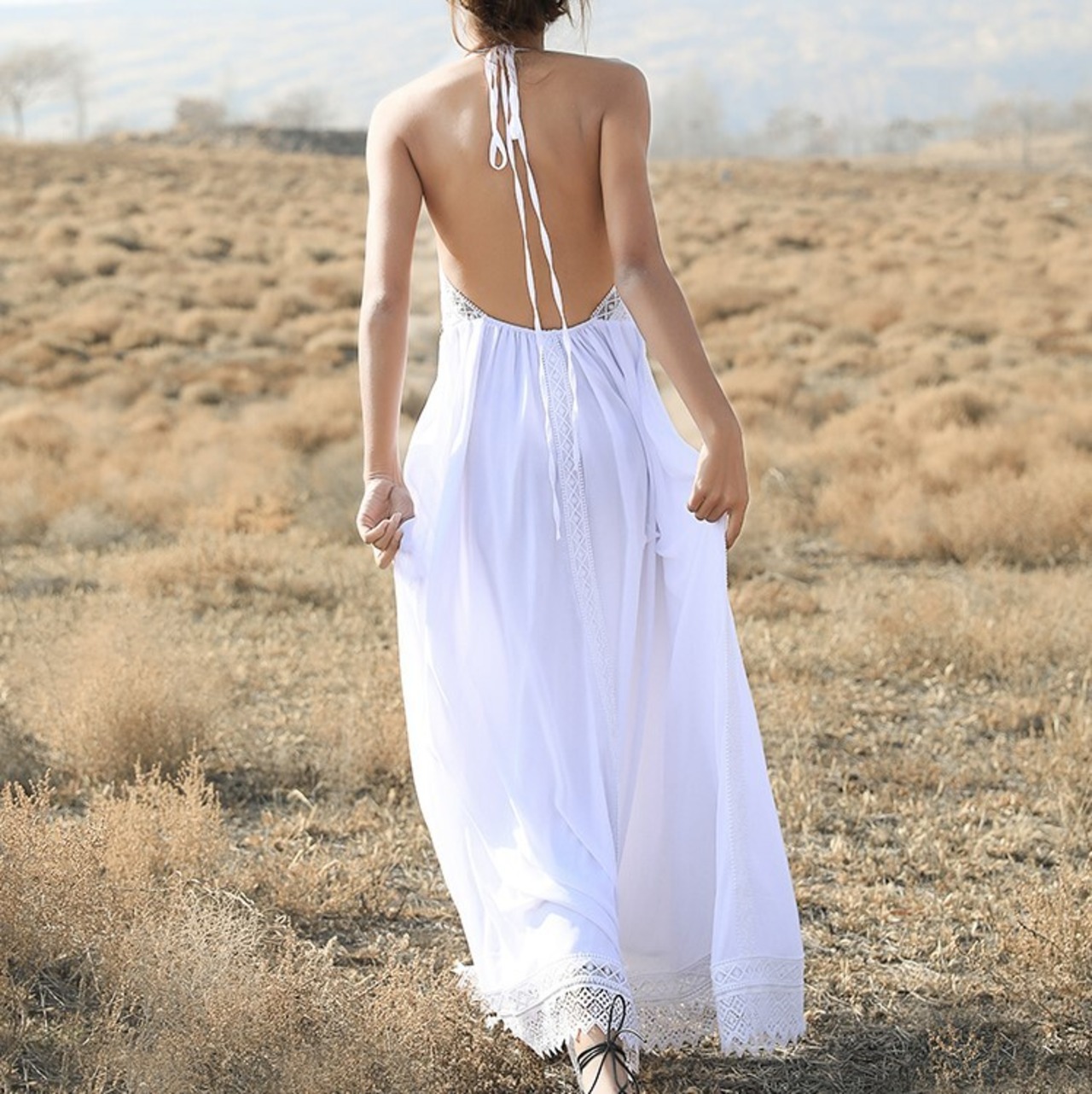 ストラップドレス キャミソールワンピース ドレス バックコンシャス ロング丈 マキシ丈 レース フレアスカート 無地 きれいめ エレガント クラシカル セクシー リゾート 夏 ホワイト