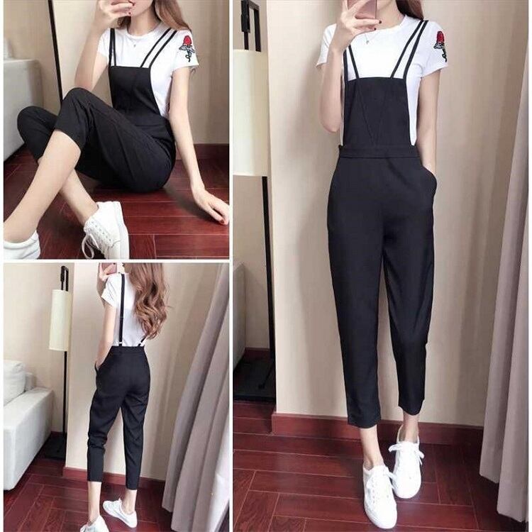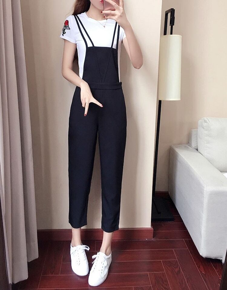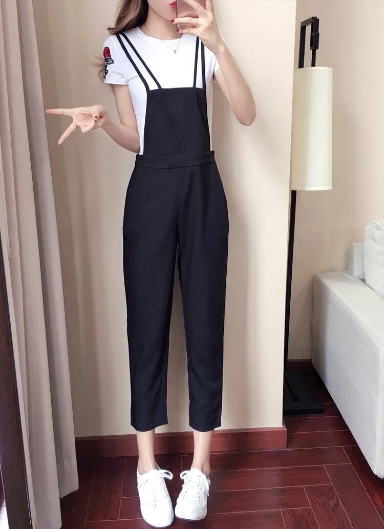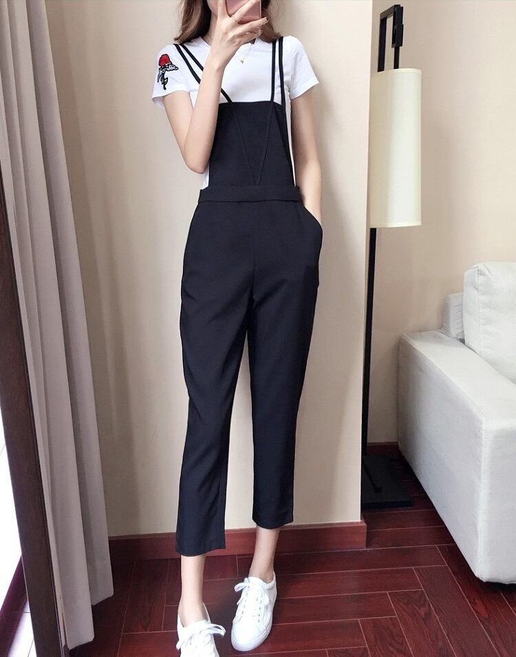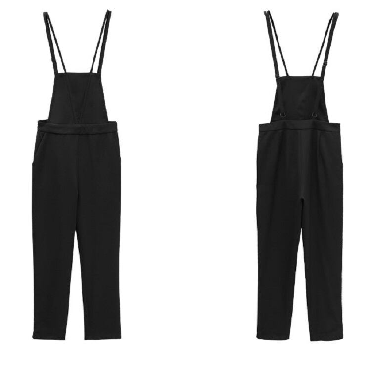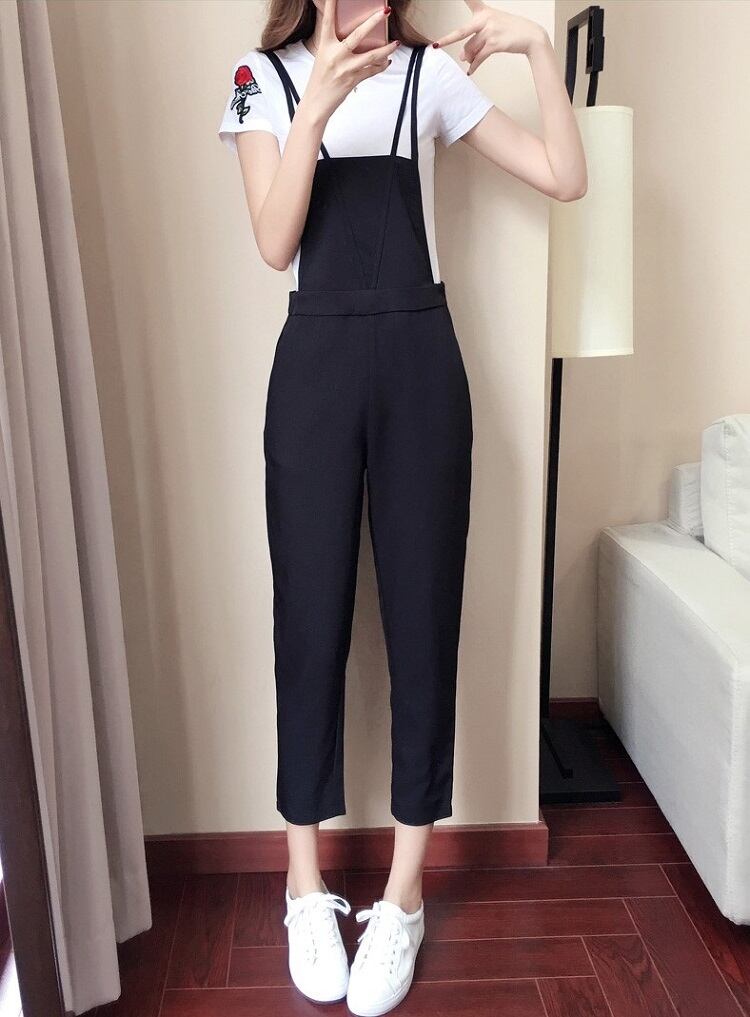 サロペット オールインワン 9分丈 ストラップ 無地 カジュアル デイリー レジャー リゾート 夏 ブラック
