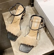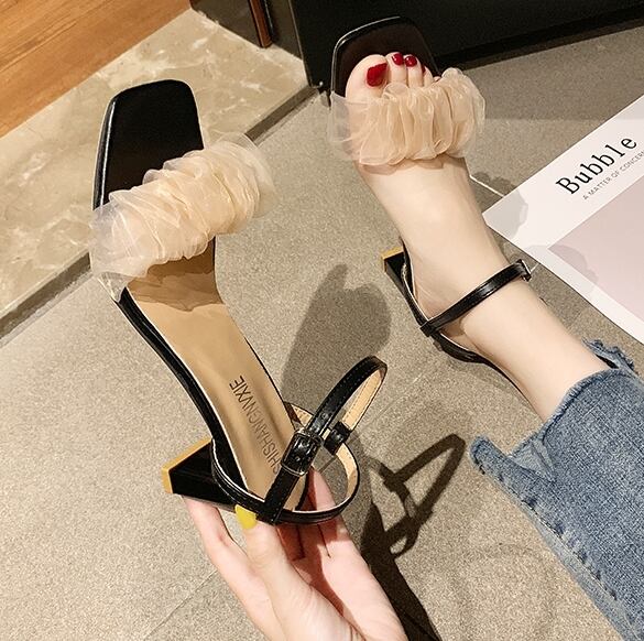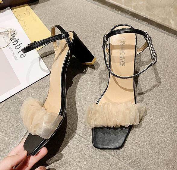 サンダル アンクルストラップ ハイヒール スクエアヒール 可愛い オープントゥ 上品 きれいめ カジュアル バイカラー 女子会 デート フリル 春 夏