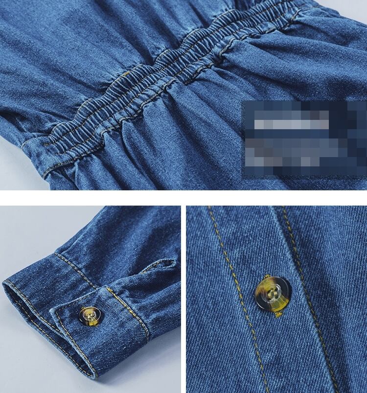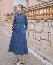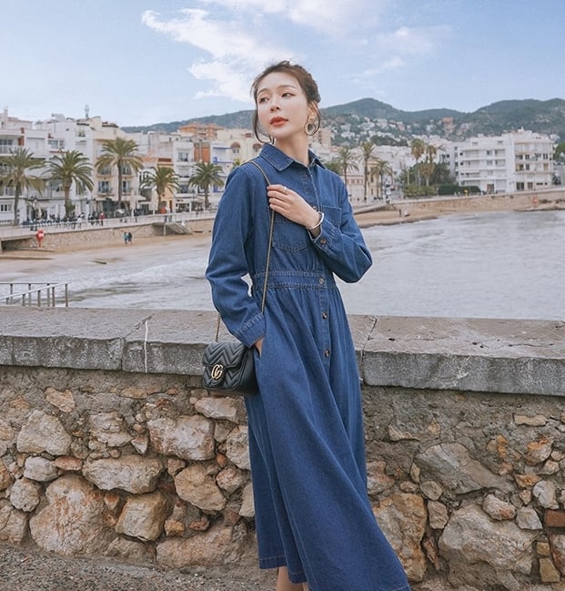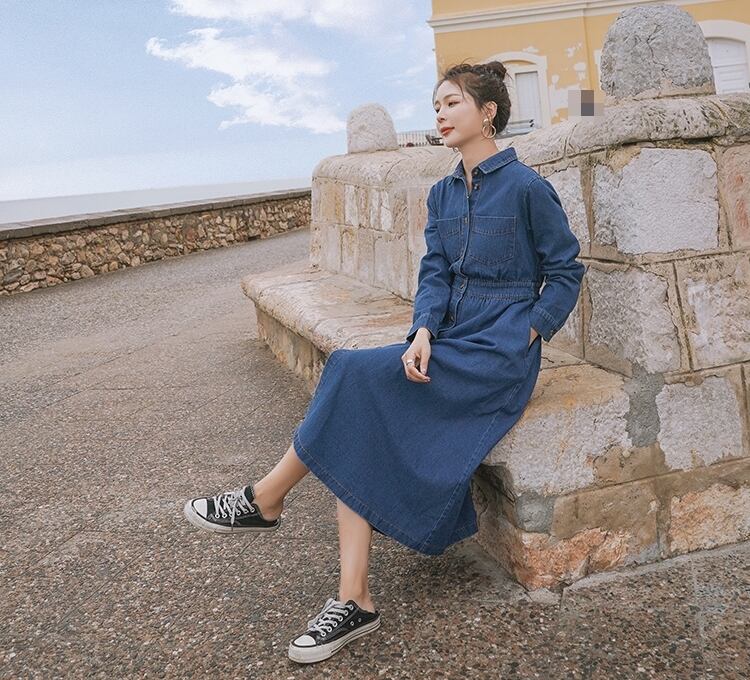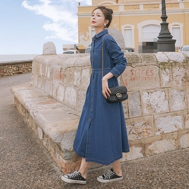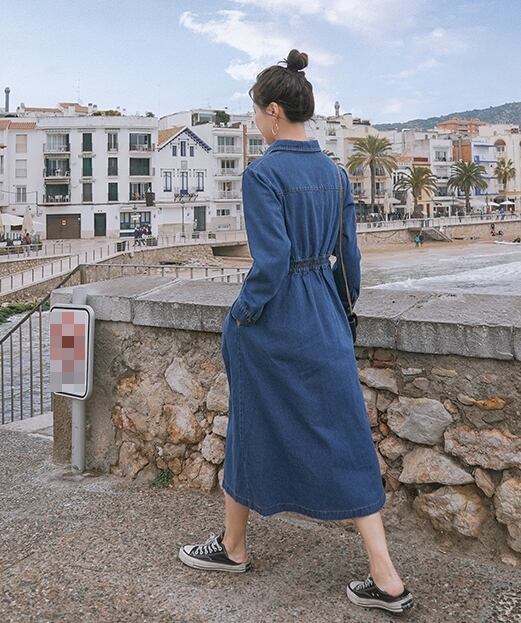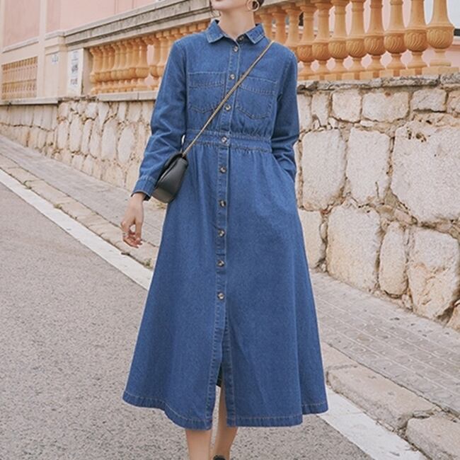 ワンピース デニムワンピース シャツワンピース フロントボタン ミモレ丈 長袖 シンプル カジュアル 大人 お出かけ フレア ハイウエスト 韓国ファッション 春 夏