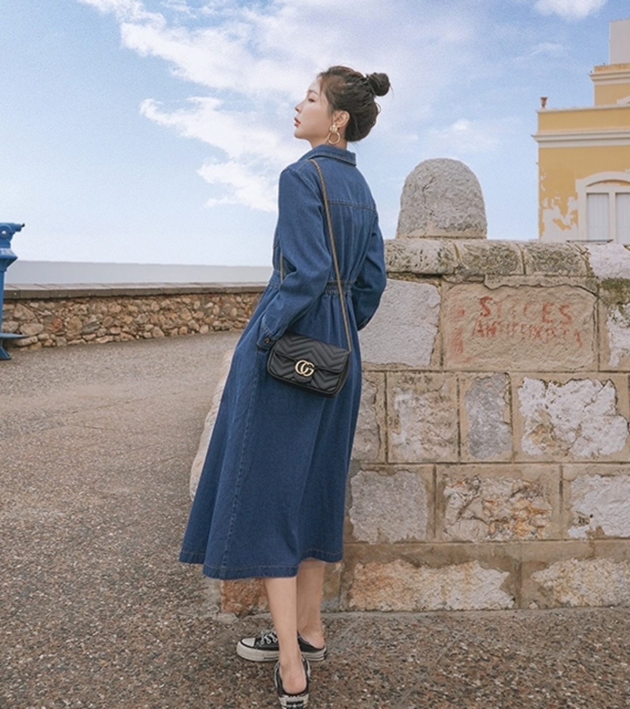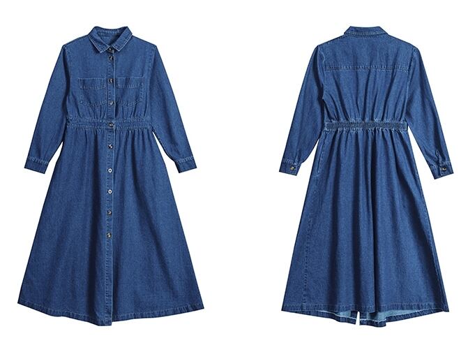 デニム素材で大人の抜け感を演出するミモレ丈ワンピース。