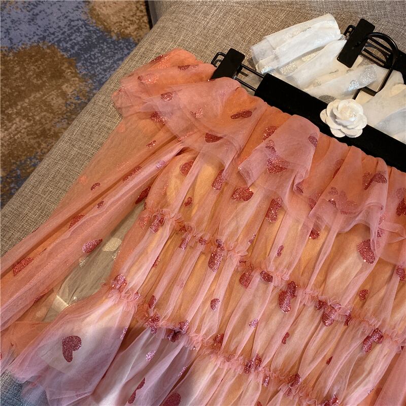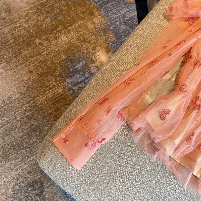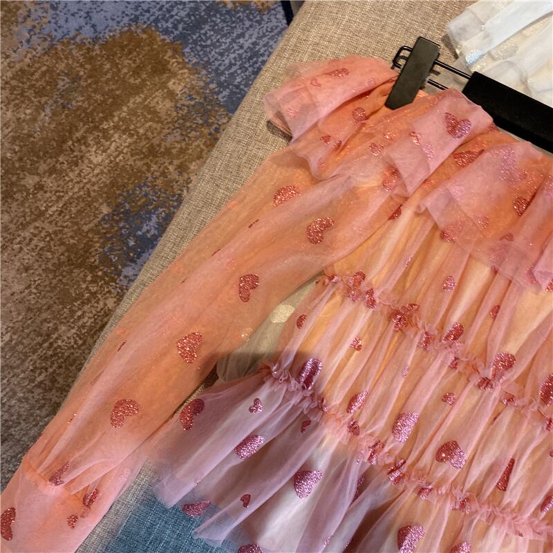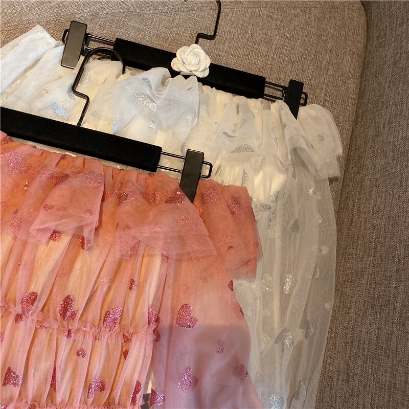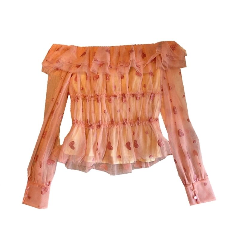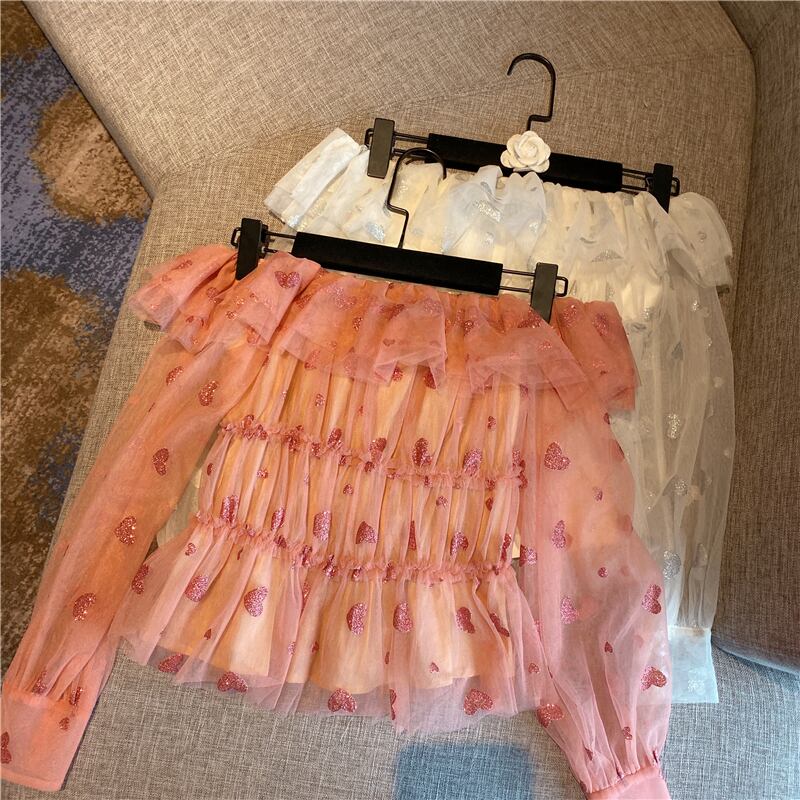 全2色 ハート柄 トップス ブラウス シースルー シフォン 長袖 パフスリーブ オフショルダー 可愛い ガーリー 上品 カジュアル きれいめ デート リゾート 春 夏