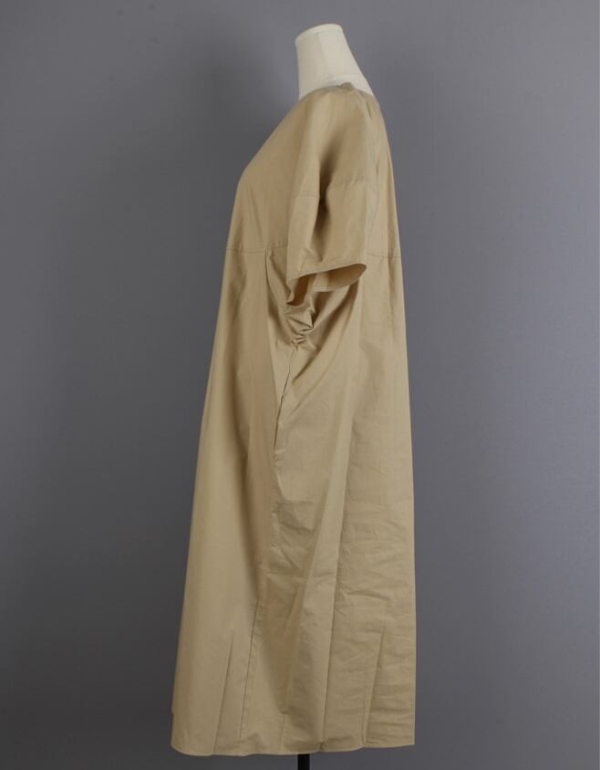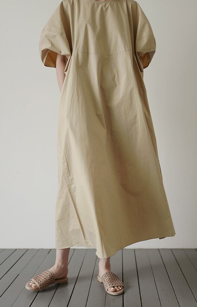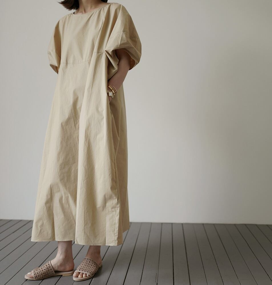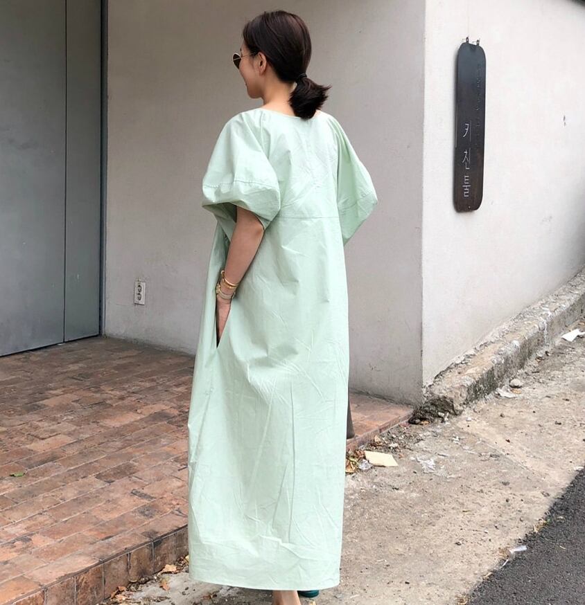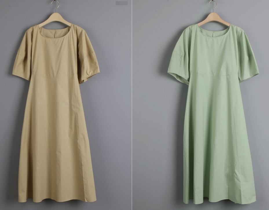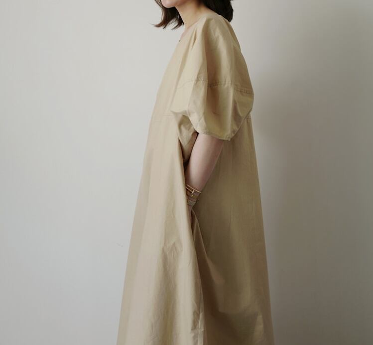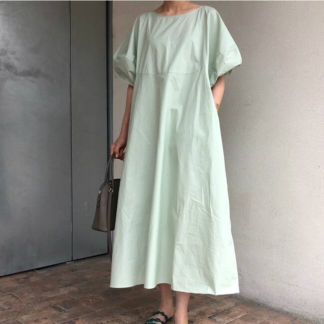全2色 ワンピース リネン コットン ロング丈 ラウンドネック ゆったり ビッグシルエット 5分袖 体型カバー 無地 バルーンスリーブ ボリューム袖 デイリー オーバーサイズ 大人 カジュアル リゾート シンプル フレア 春 夏