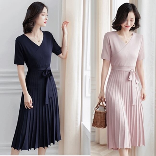 全2色 ワンピース ドレス プリーツ Vネック 半袖 ウエストリボン ミモレ丈 エレガント 上品 大人可愛い 女子会 デート カジュアル きれいめ 春 夏