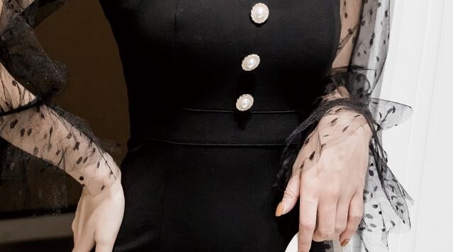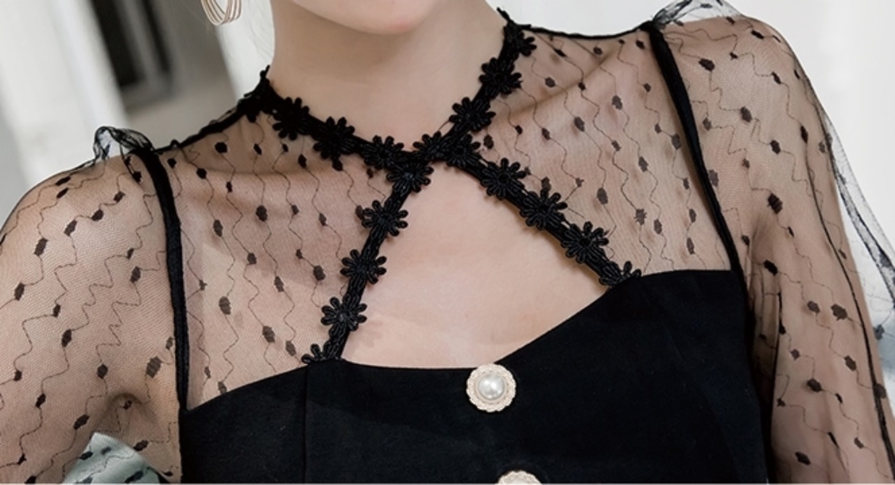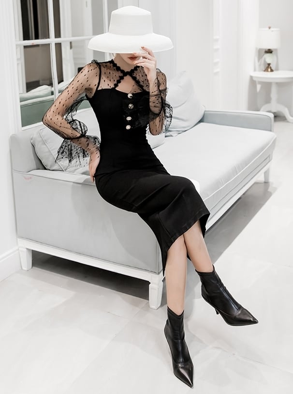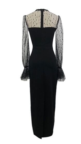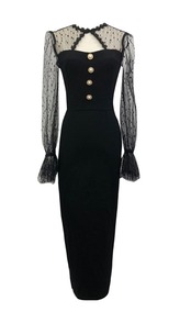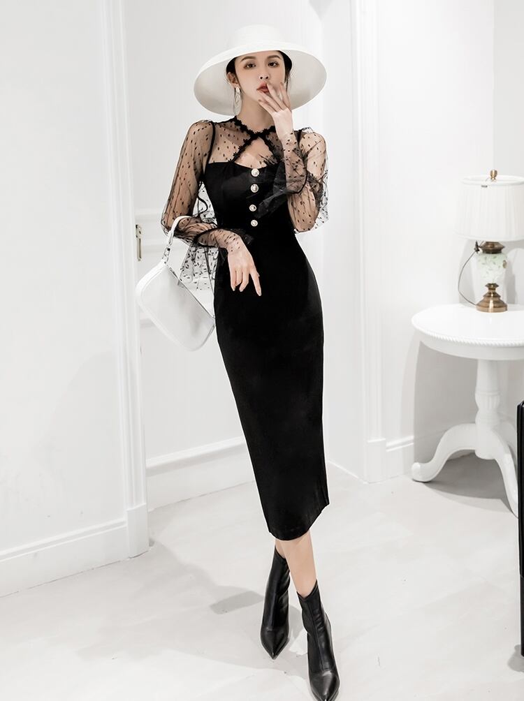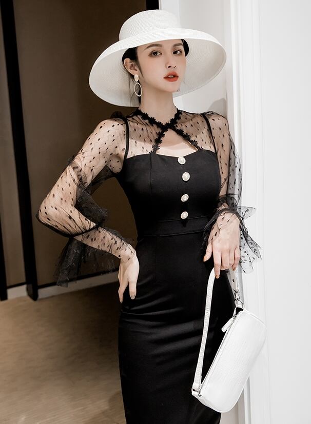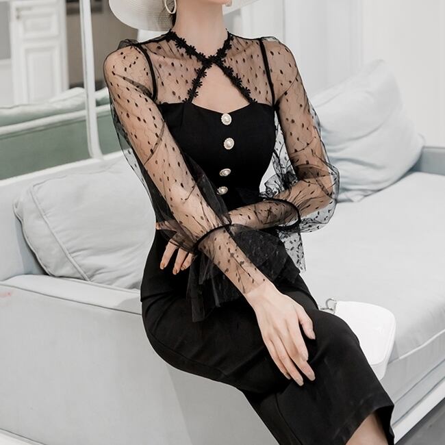 ワンピース ドレス タイト ミモレ丈 スリム 長袖 トランペットスリーブ レース シースルー ドット柄 クルーネック フロントボタン バックスリット セクシー 上品 大人 ナイト お呼ばれ エレガント パーティー 春 夏