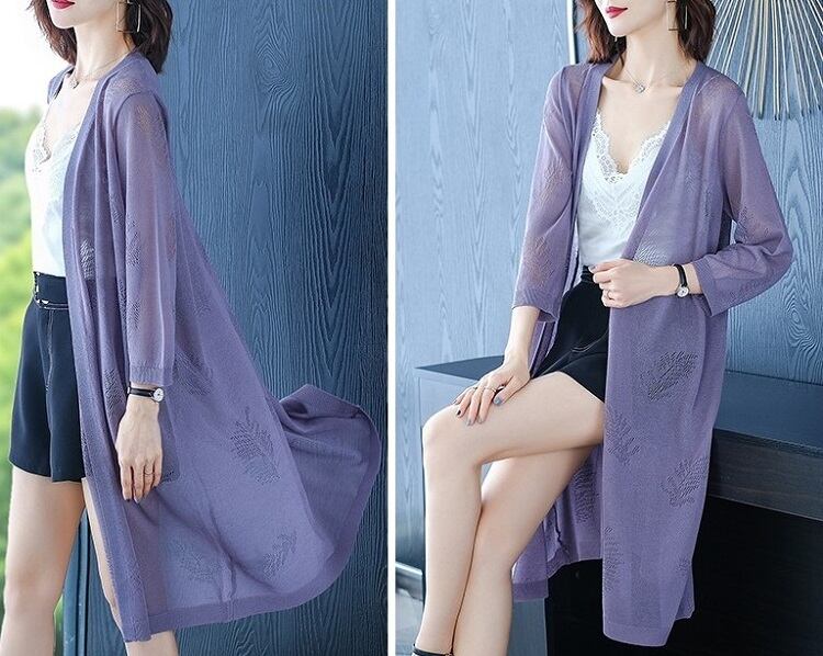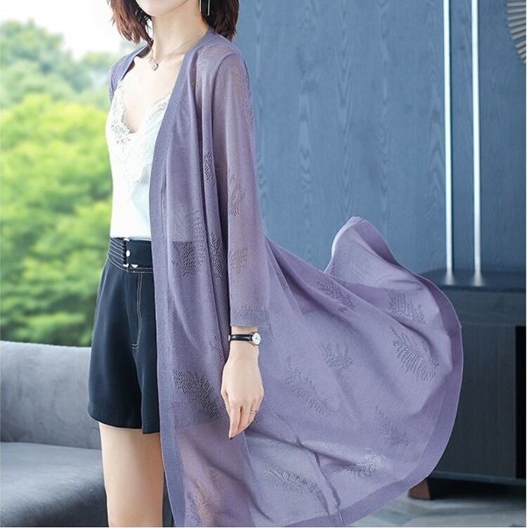 全4色 ロングカーディガン 羽織 長袖 薄手 透け感 ゆったり 日焼け対策 冷房除け きれいめ カジュアル リゾート 夏 パープル アプリコット ブラック グリーン
