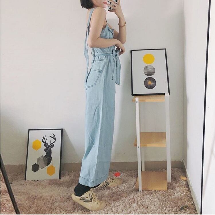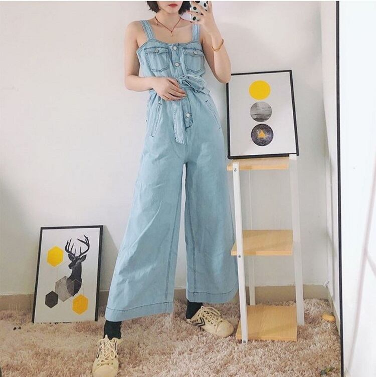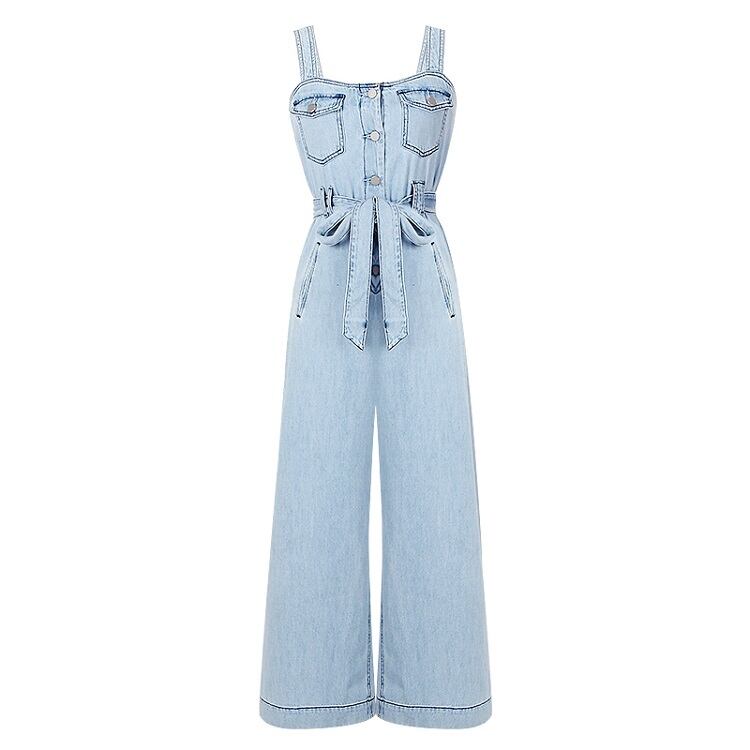オールインワン サロペット オーバーオール ジャンプスーツ デニムパンツ ワイドパンツ シンプル ウエストリボン 美脚 楽ちん かわいい リゾート カジュアル 夏 ブルー