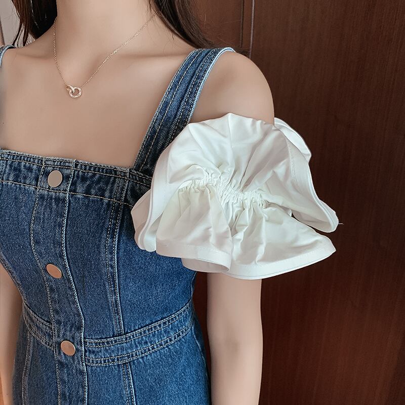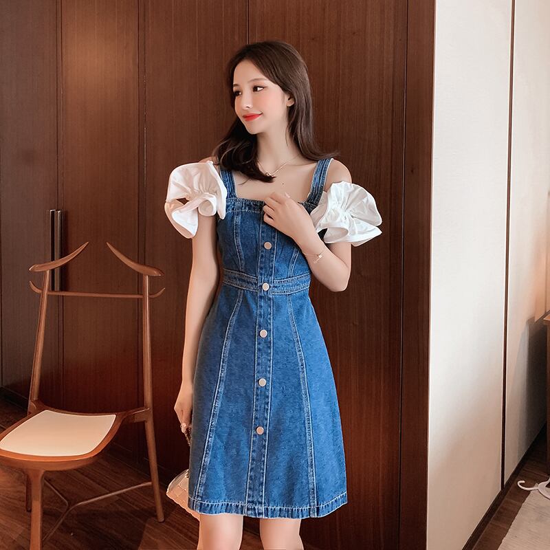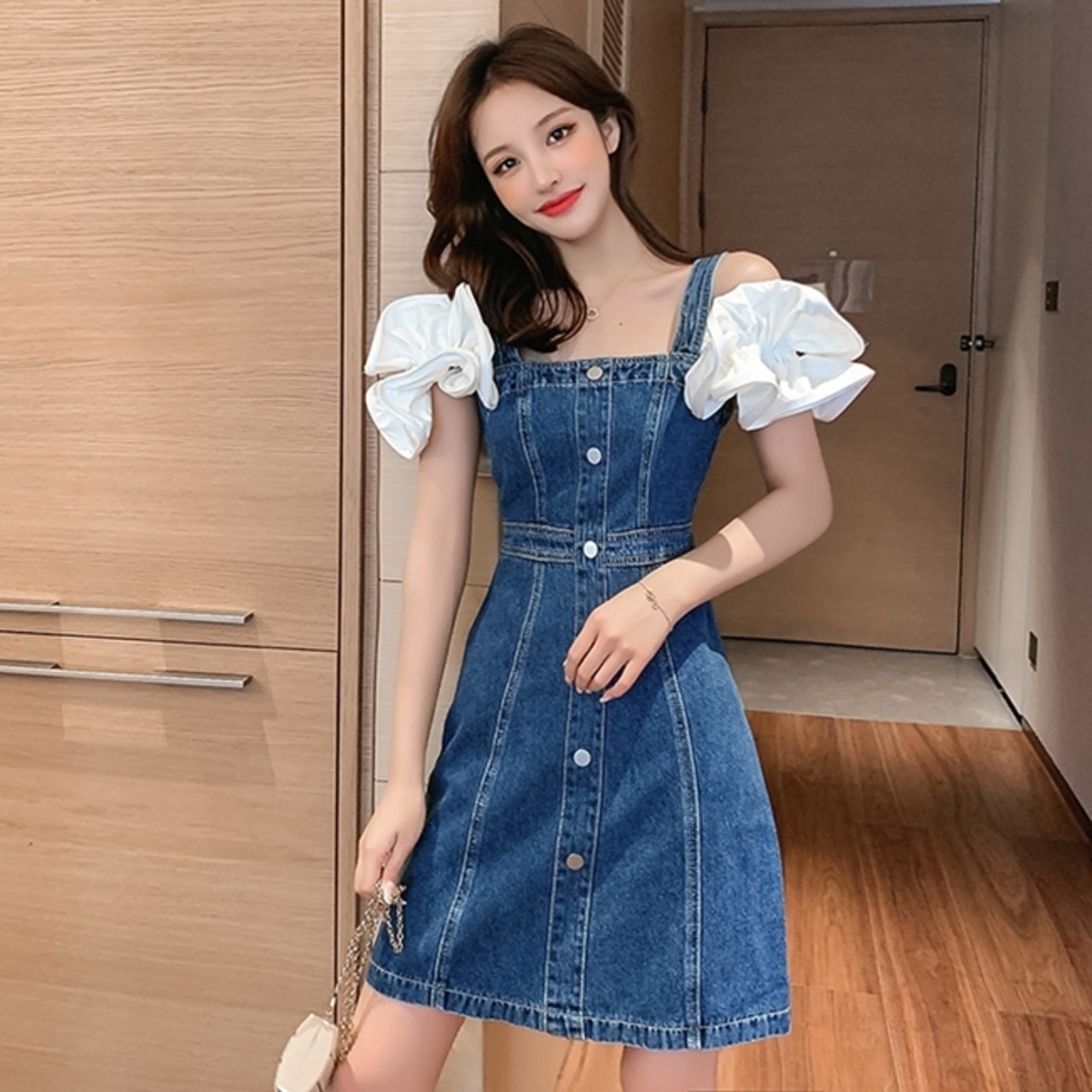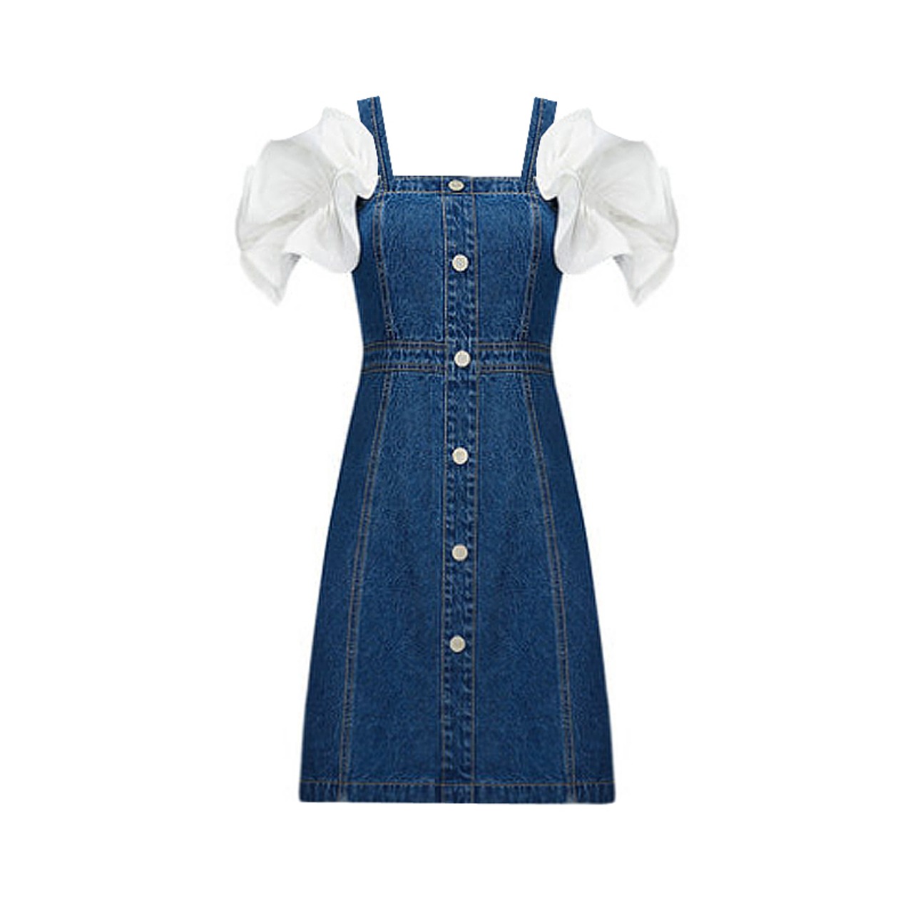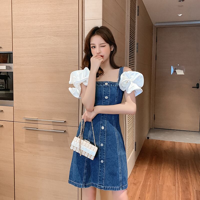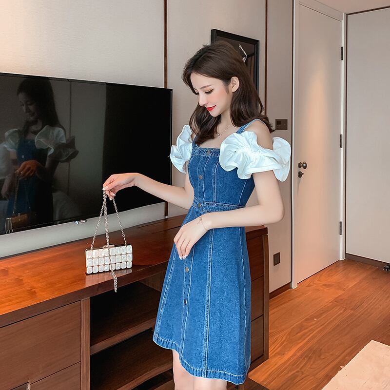 サロペットスカート ワンピース ミニ丈 フレアスリーブ 袖コンシャス デニムワンピース ジーンズ ウエストシャーリング フロントボタン 可愛い ガーリー カジュアル デート 春 夏