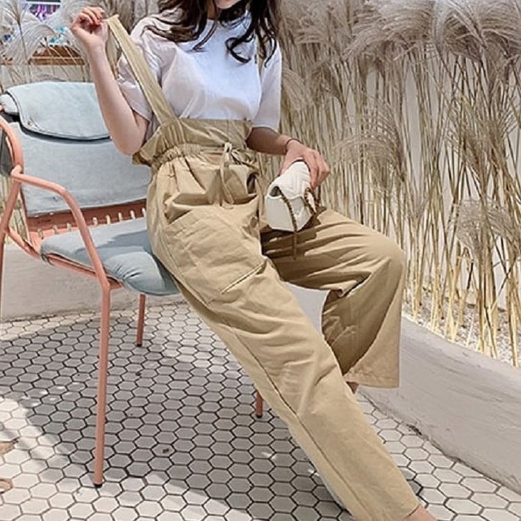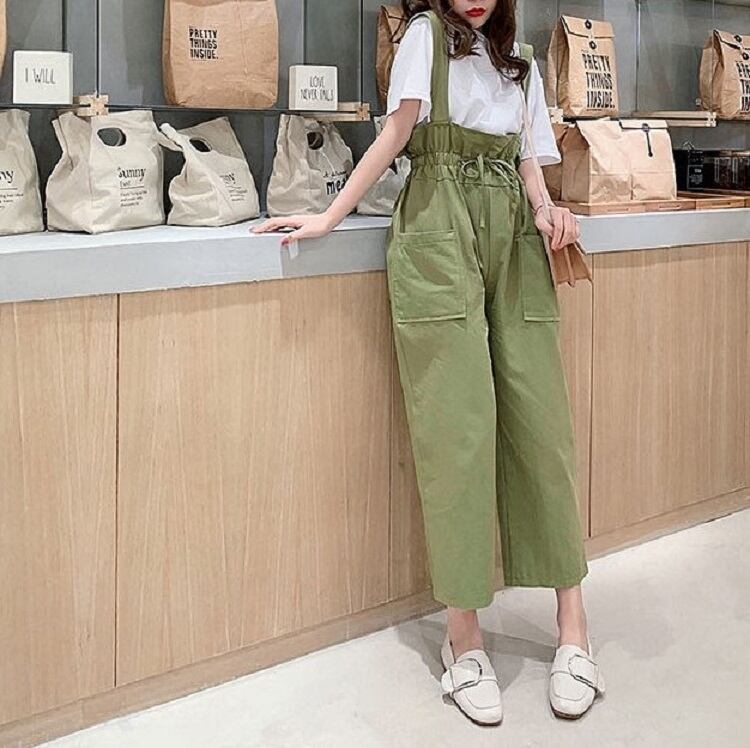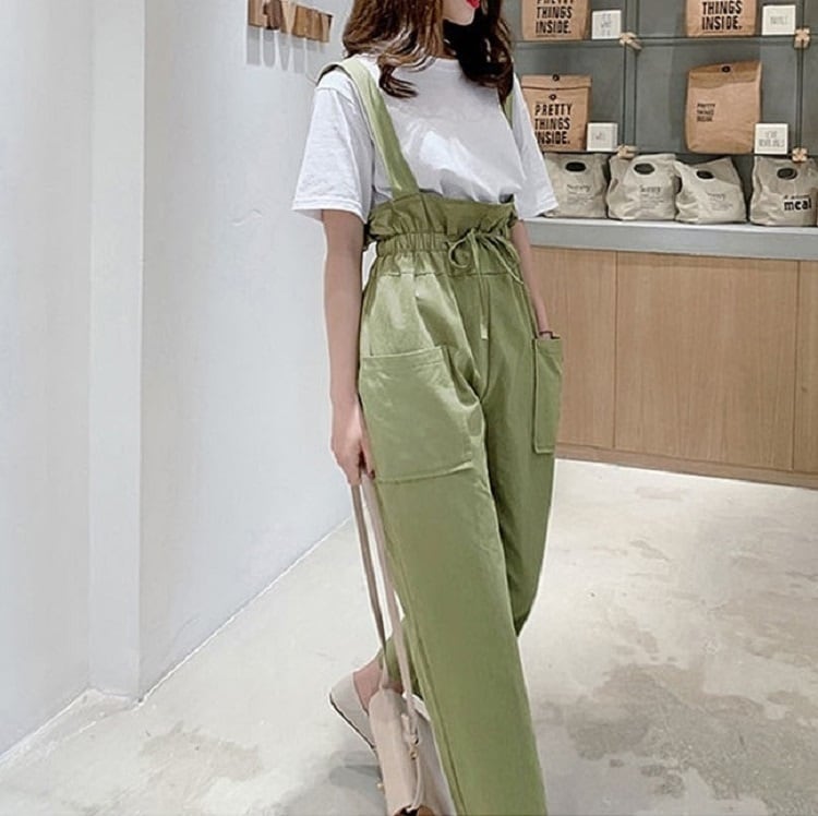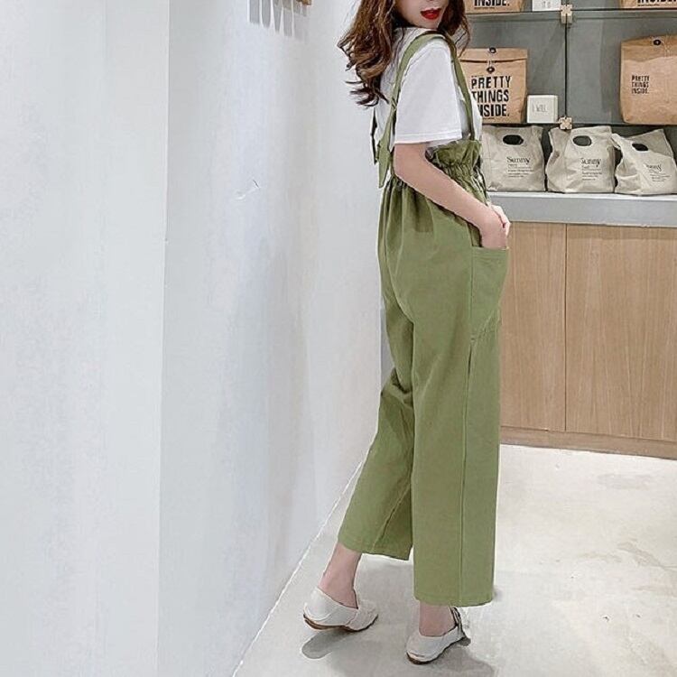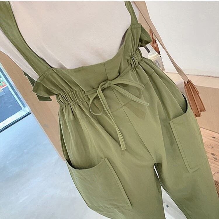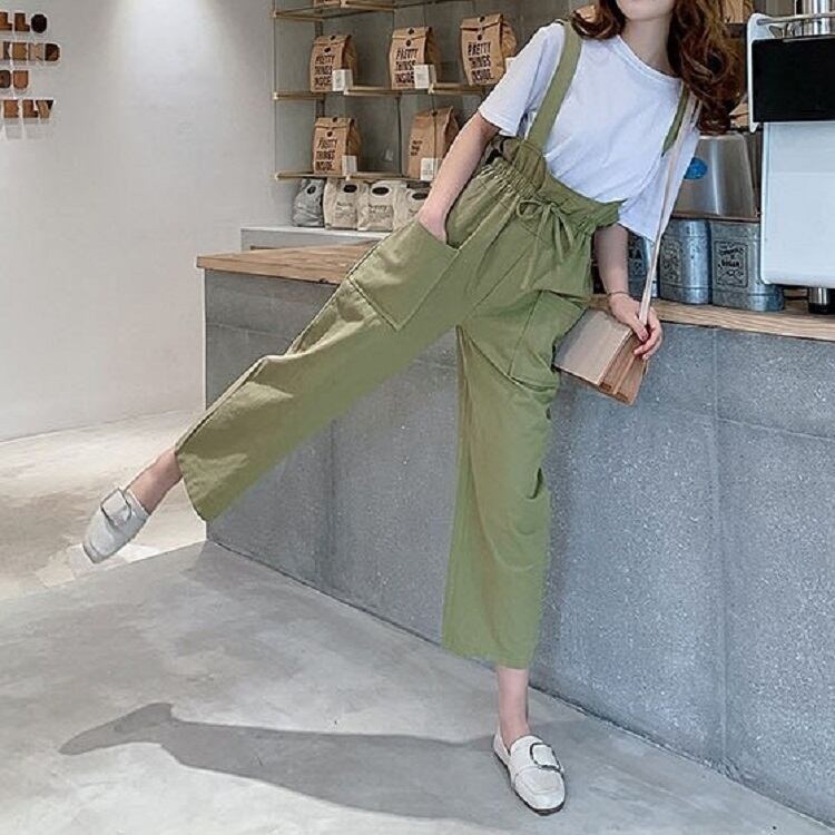 全2色 サスペンダーパンツ ワイドパンツ 九分丈 アンクル丈 ウエストリボン 無地 ゆったり 可愛い ハイウエスト ガーリー カジュアル お出かけ デイリー 普段着 カーキ グリーン