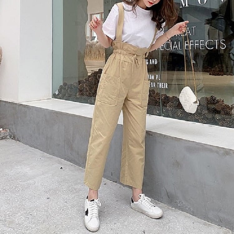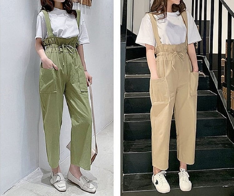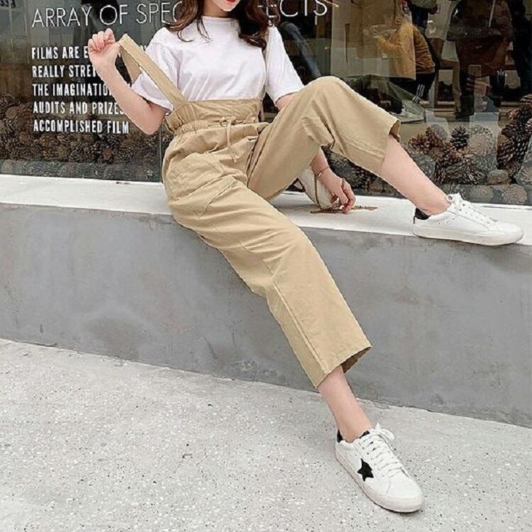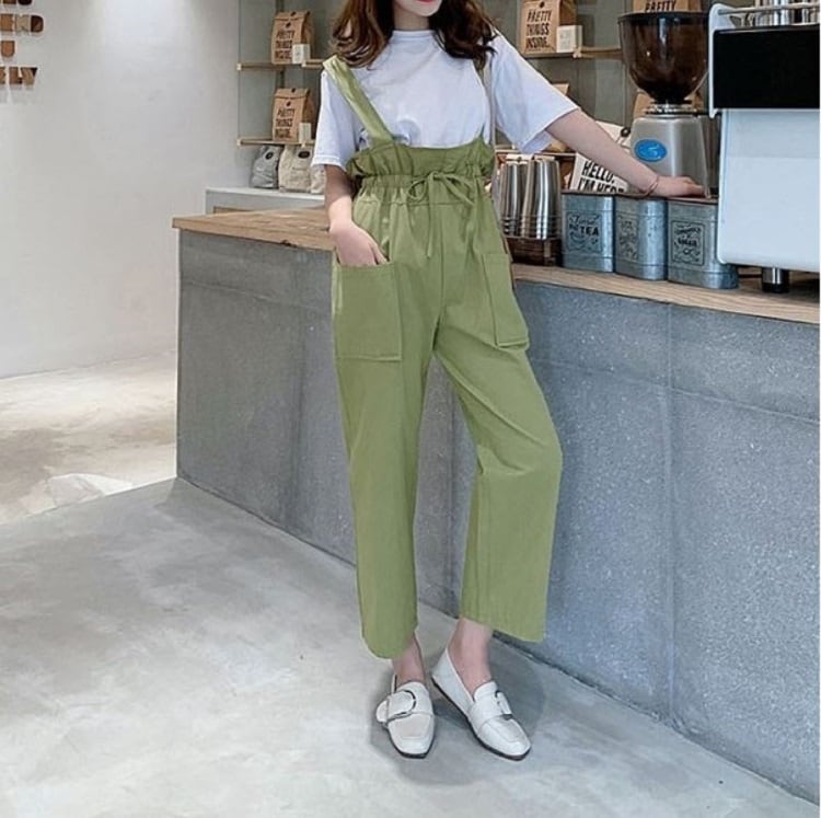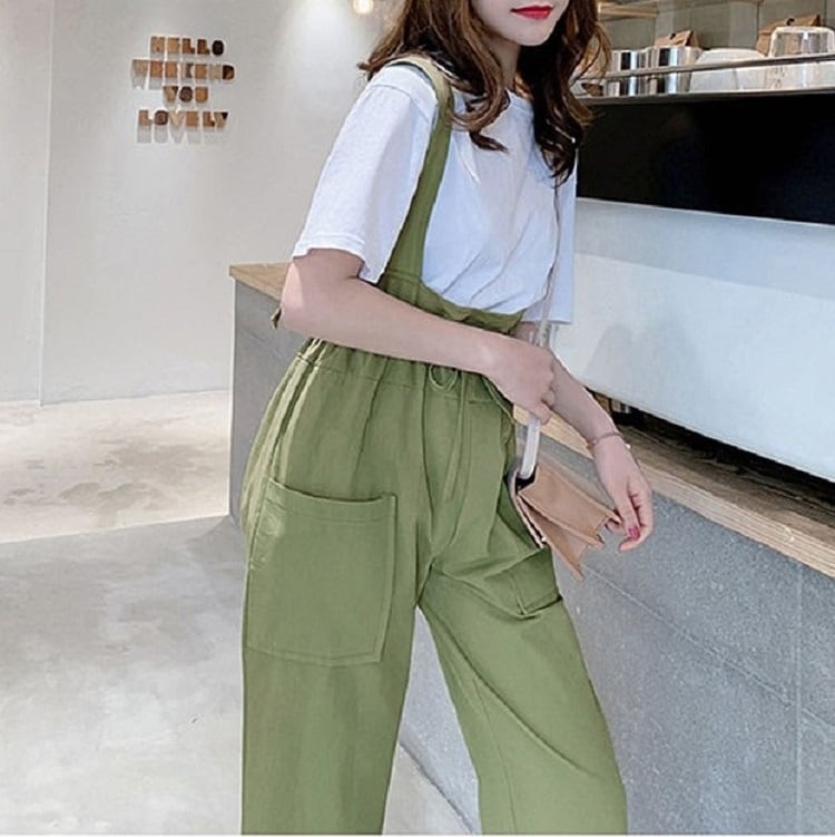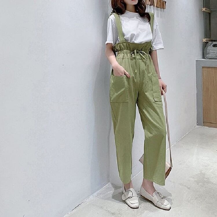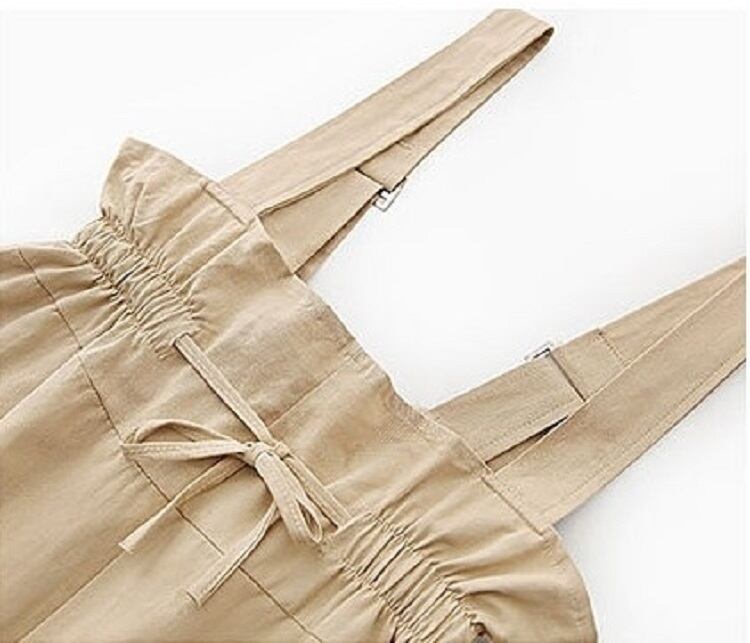 全2色 サスペンダーパンツ ワイドパンツ 九分丈 アンクル丈 ウエストリボン 無地 ゆったり 可愛い ハイウエスト ガーリー カジュアル お出かけ デイリー 普段着 カーキ グリーン