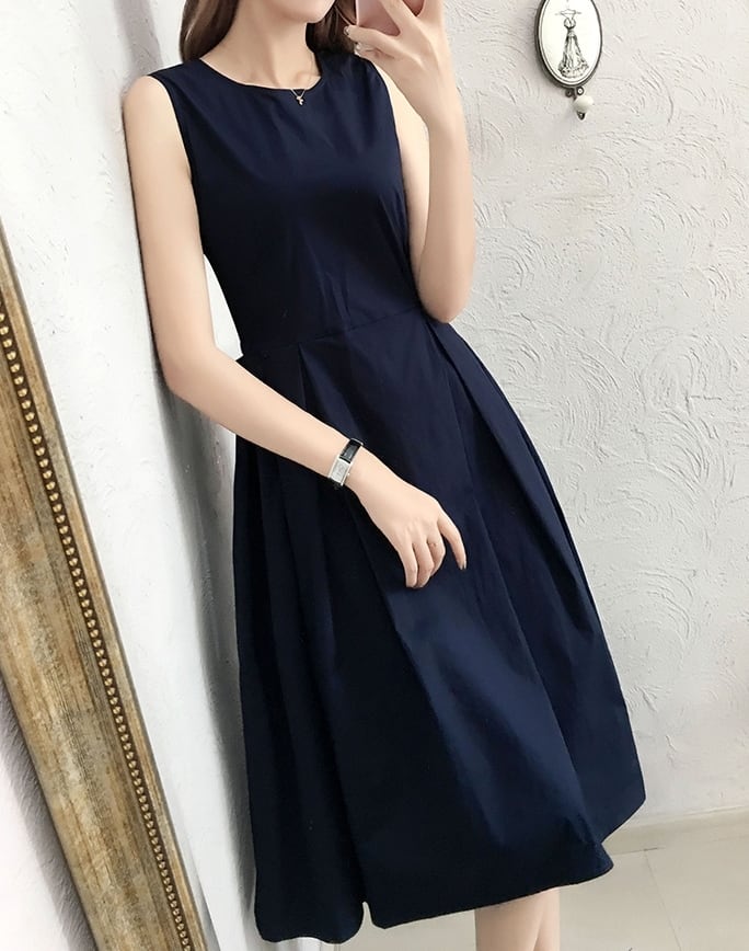 全4色 ワンピース ドレス ミディ丈 ノースリーブ ウエストリボン フレア Aライン クルーネック 大人 きれいめ 上品 エレガント フレンチ レトロ オケージョン お呼ばれ 結婚式 女子会 春 夏