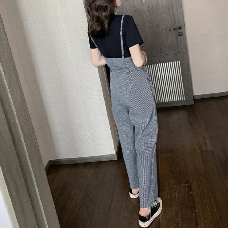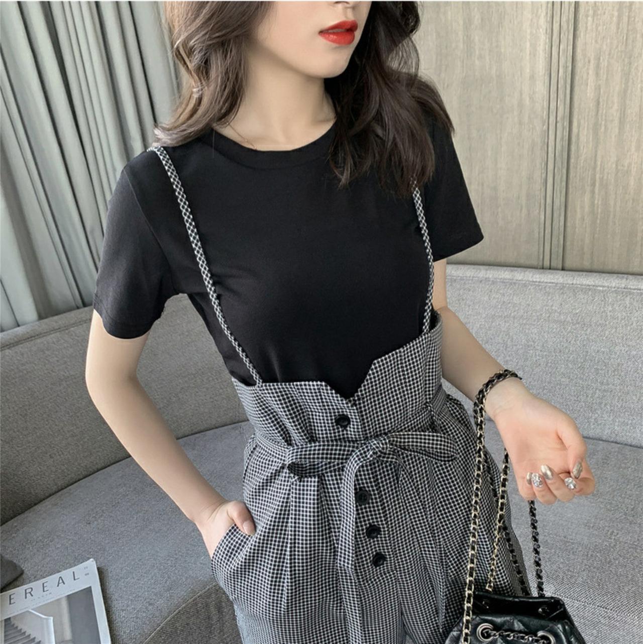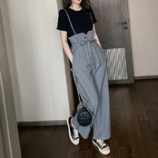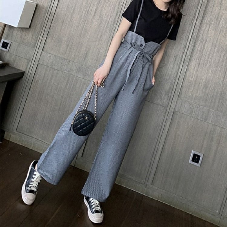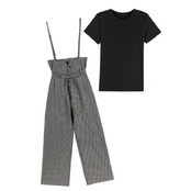 セットアップ 上下セット Tシャツ サスペンダーパンツ ワイドパンツ ストレートパンツ ウエストリボン 千鳥格子 ブラック レトロ ハイウエスト きれいめ カジュアル お出かけ デート 女子会 デイリー 普段着