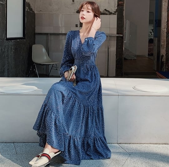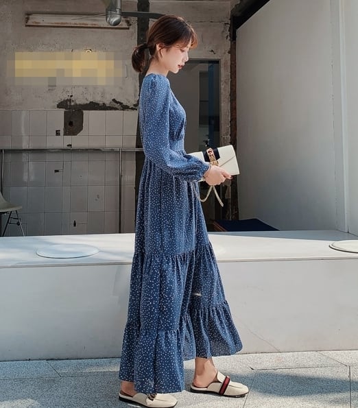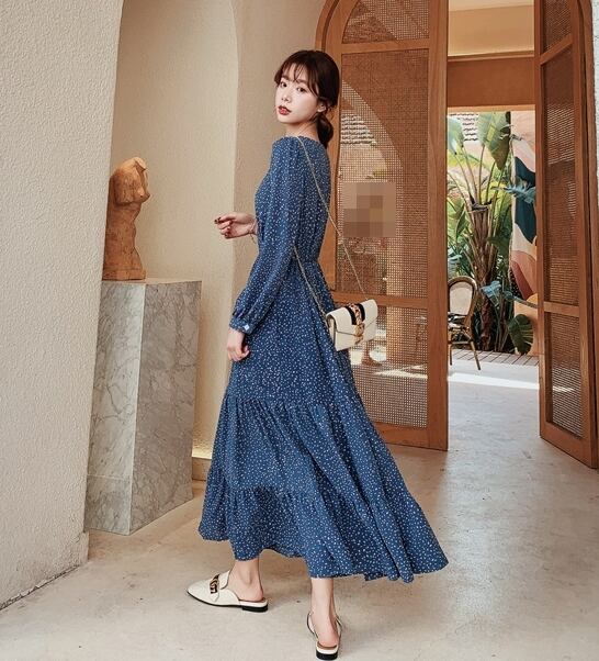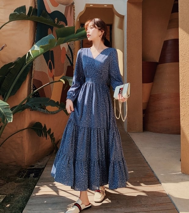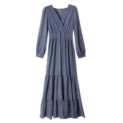 花びら柄 ワンピース ロング丈 ティアード フレア カシュクールネック Vネック 長袖 上品 カジュアル きれいめ デート リゾート 大人可愛い ハイウエスト 春 夏