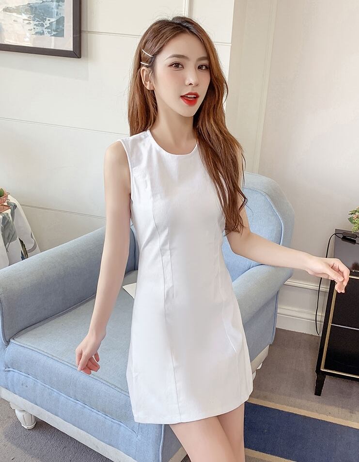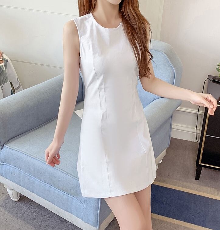 ワンピース ミニ丈 バックシャン バックコンシャス バックボタン クルーネック スリム ノースリーブ 可愛い 上品 カジュアル デート リゾート 春 夏