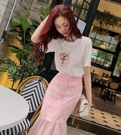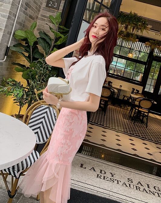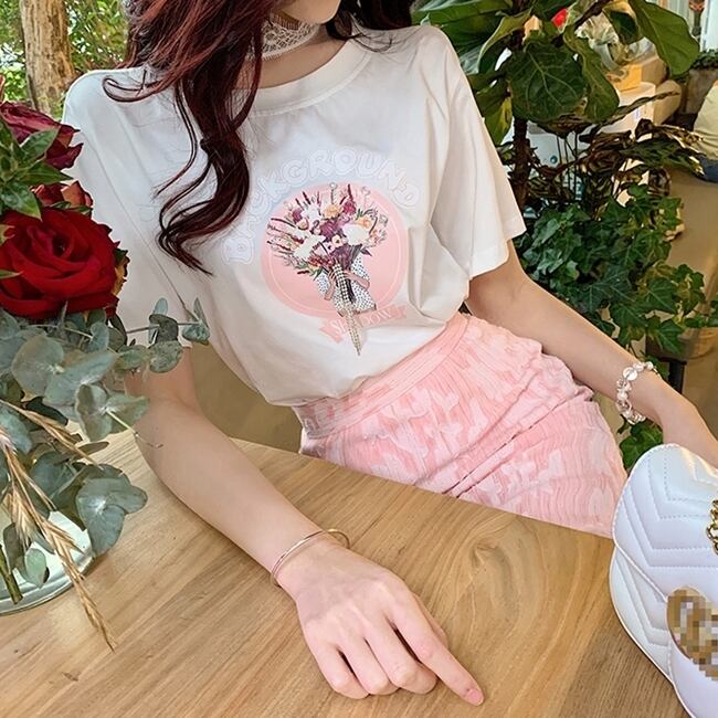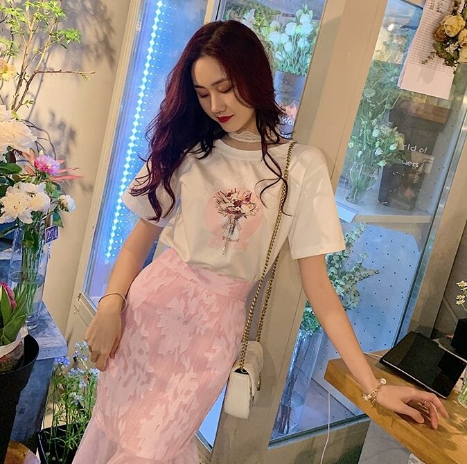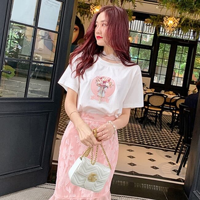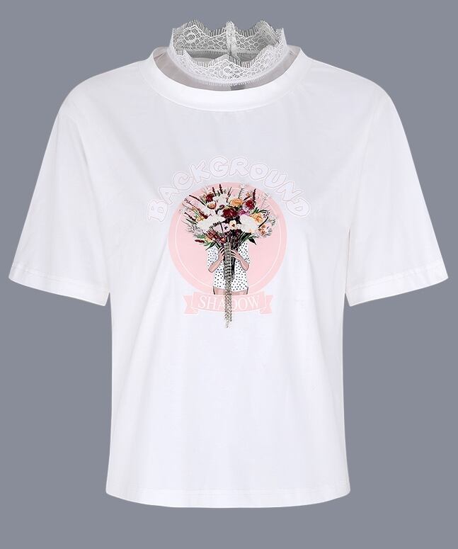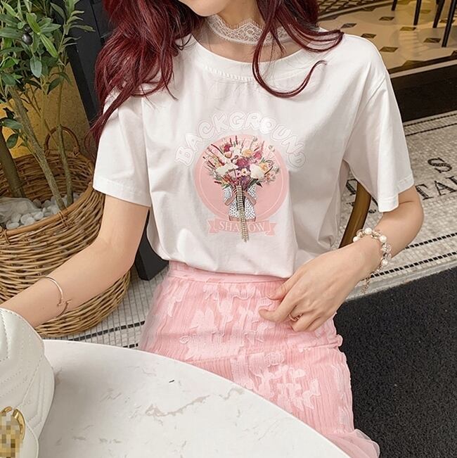 トップス Tシャツ ラウンドネック ロゴ入り 半袖 ガーリー レース ハイネック 可愛い カジュアル デイリー シンプル フェミニン ゆったり 韓国ファッション 春 夏