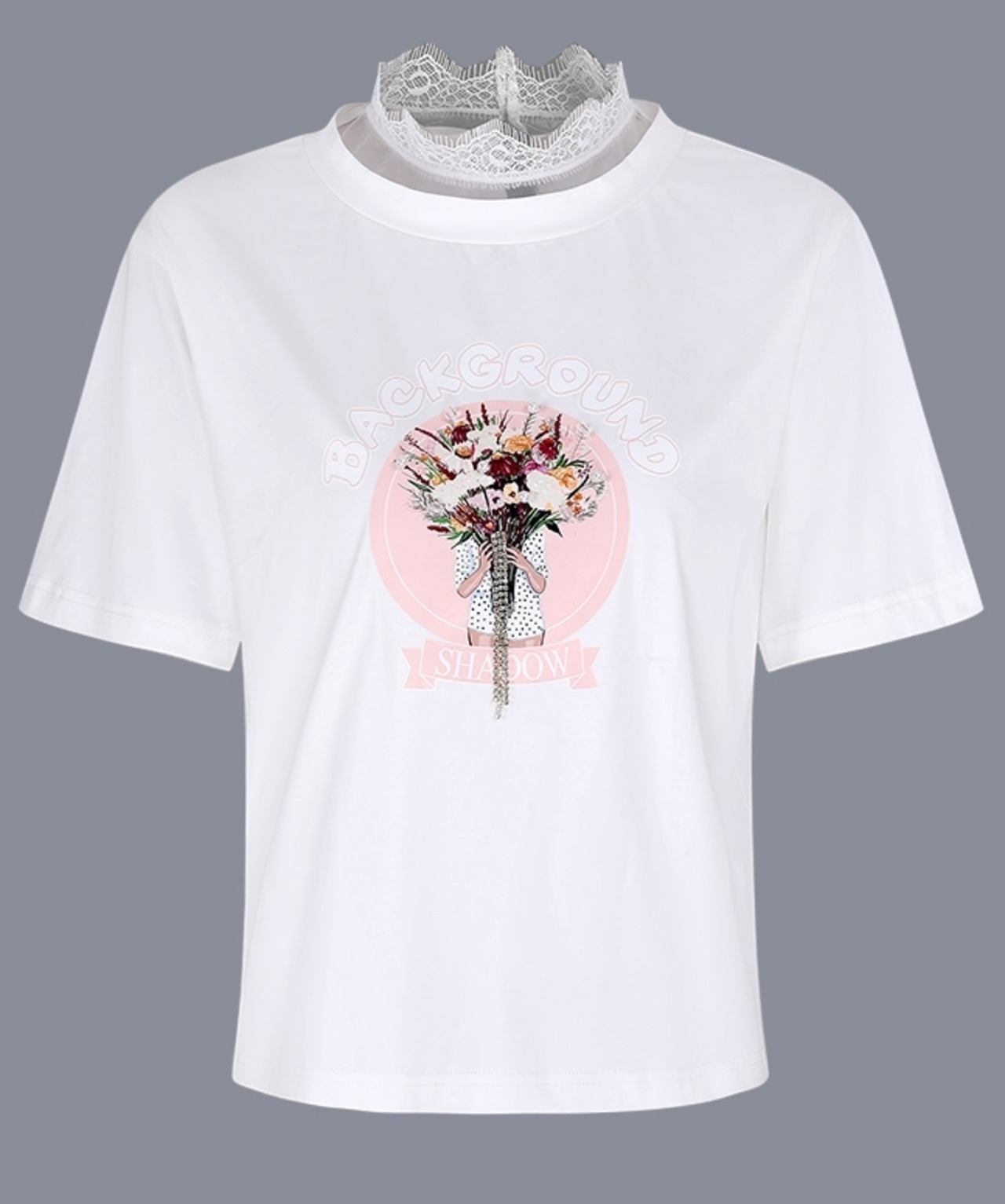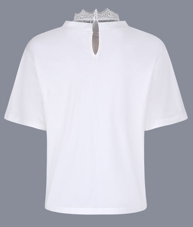 ネックまわりにレースをあしらったデザインが上品なTシャツ。