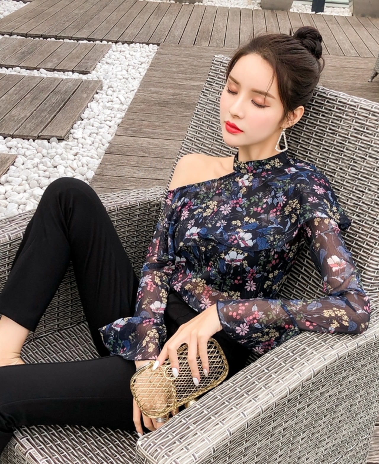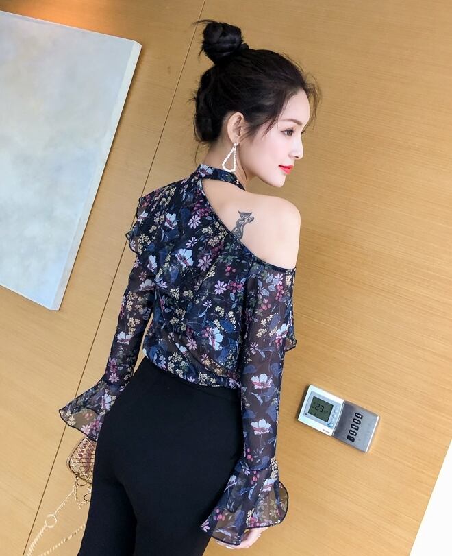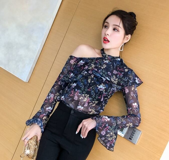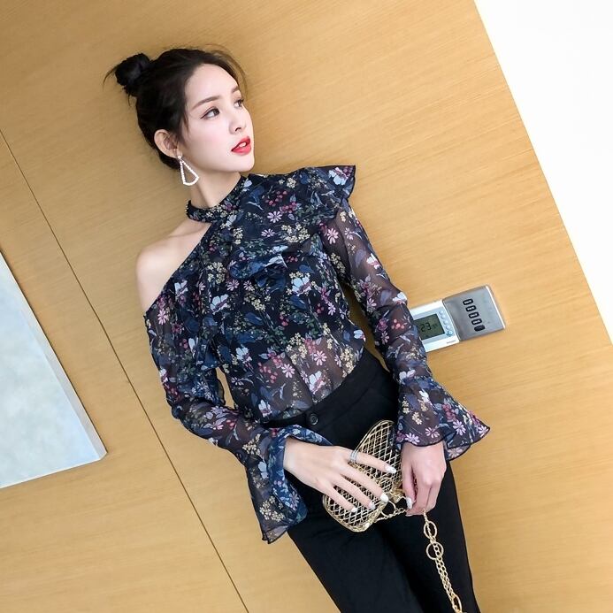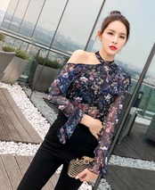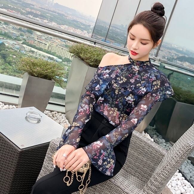 トップス ブラウス 花柄 オープンショルダー フリル ハイネック 長袖 トランペットスリーブ シースルー シフォン カジュアル きれいめ 大人可愛い デート 春 夏