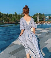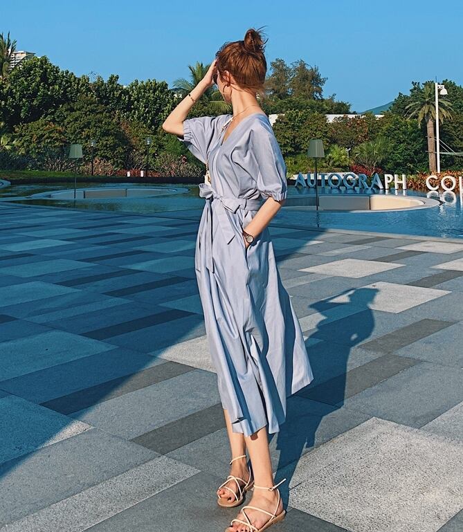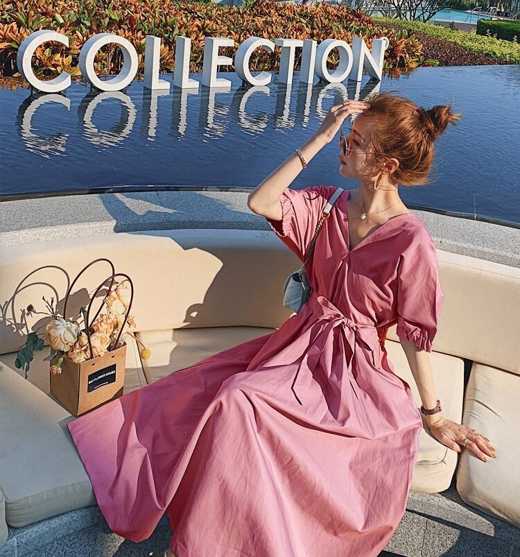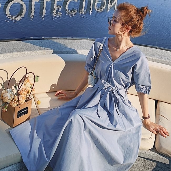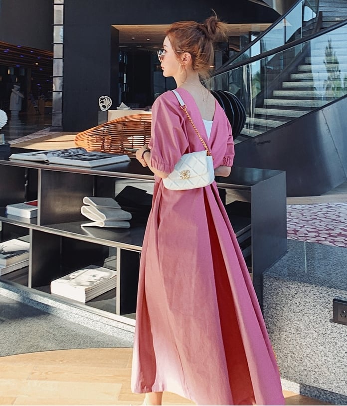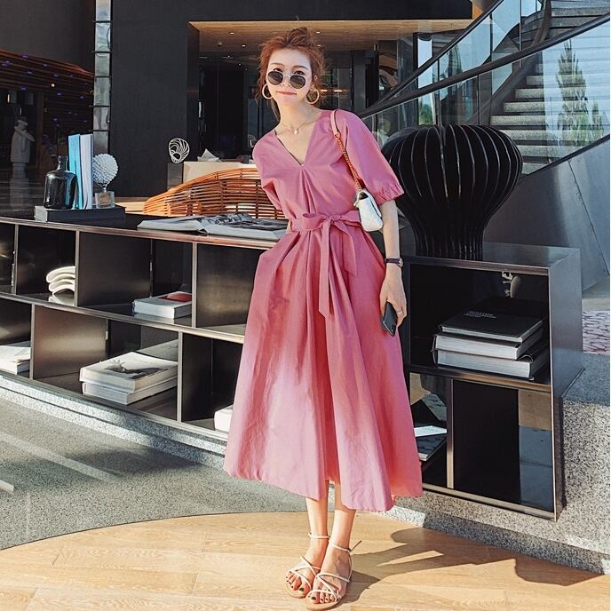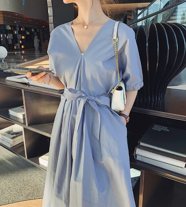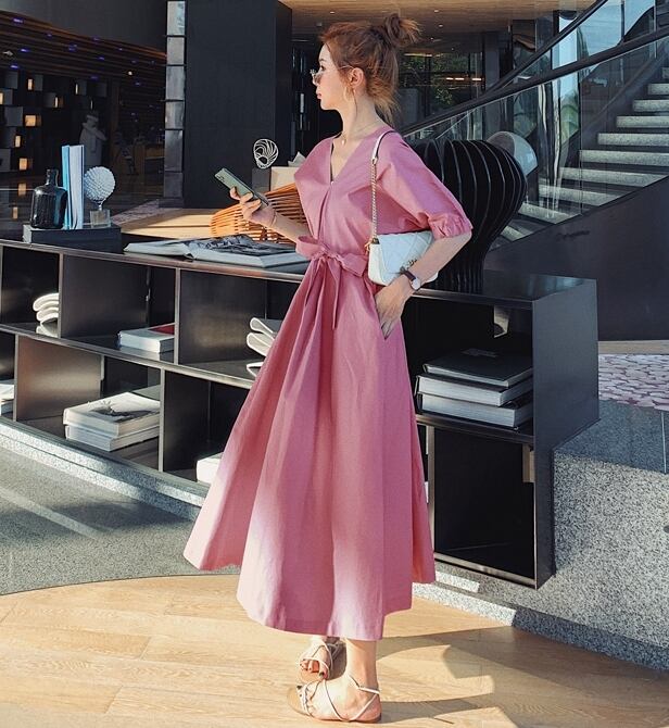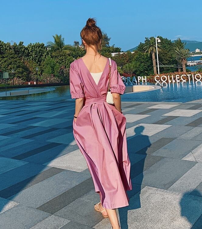 ワンピース サマードレス Vネック ウエストリボン ロング丈 フレア 背中みせ 無地 5分袖 上品 大人可愛い きれいめ Aライン カジュアル リゾート デート レトロ 春 夏