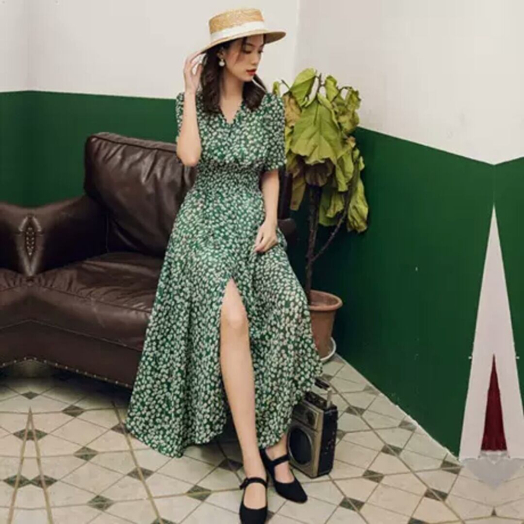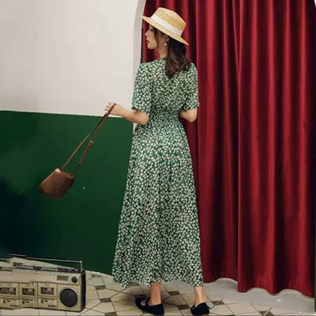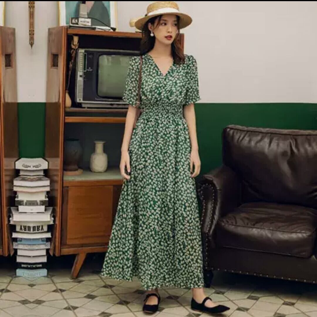 花柄 フローラル Vネック ハイウエスト 半袖 ロング丈 スリット 大人 カジュアル 可愛い キレイめ お出かけ お買い物 デート 女子会 通勤 通学 学生 韓国ファッション 春 夏