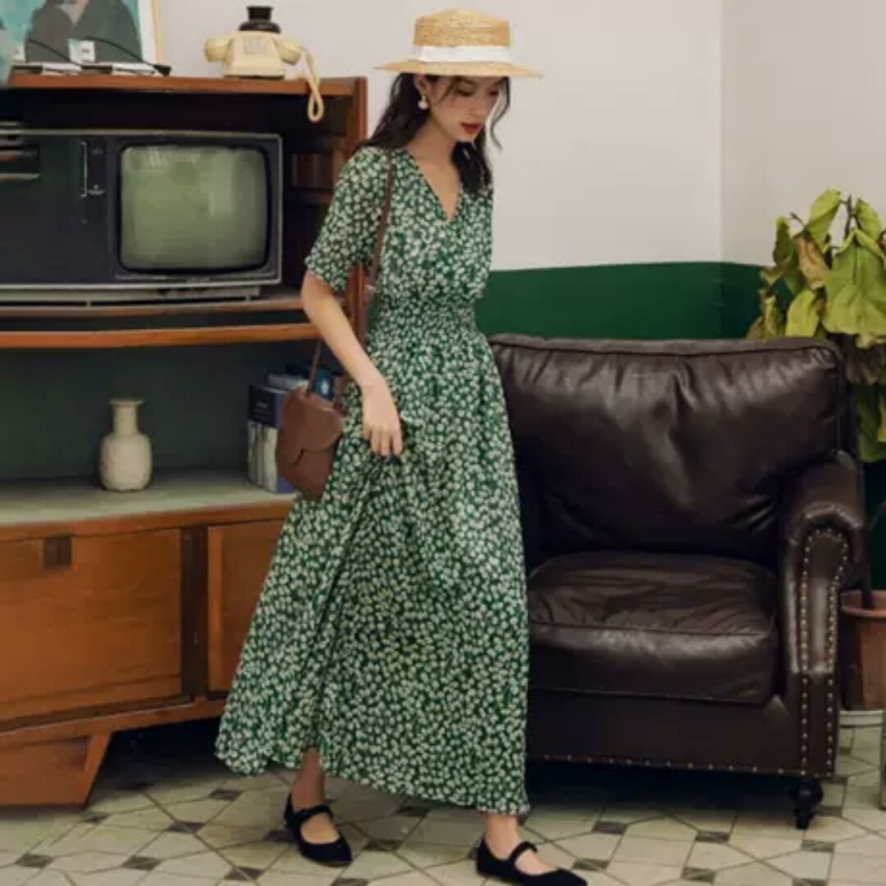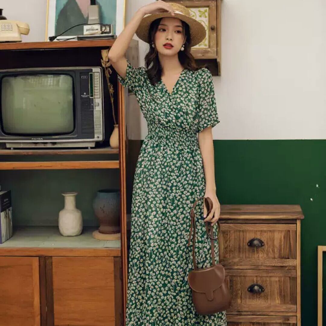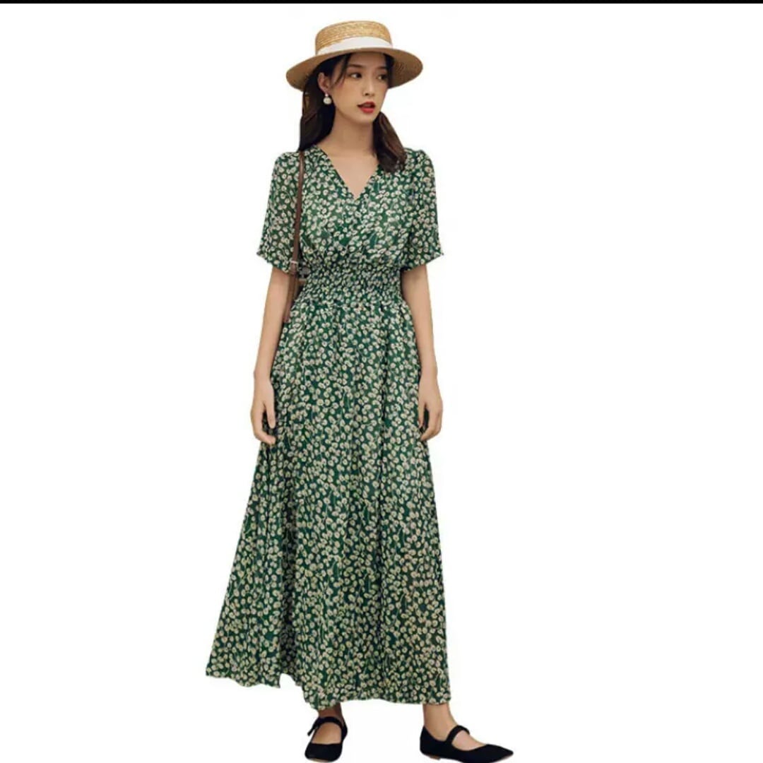 花柄 フローラル Vネック ハイウエスト 半袖 ロング丈 スリット 大人 カジュアル 可愛い キレイめ お出かけ お買い物 デート 女子会 通勤 通学 学生 韓国ファッション 春 夏