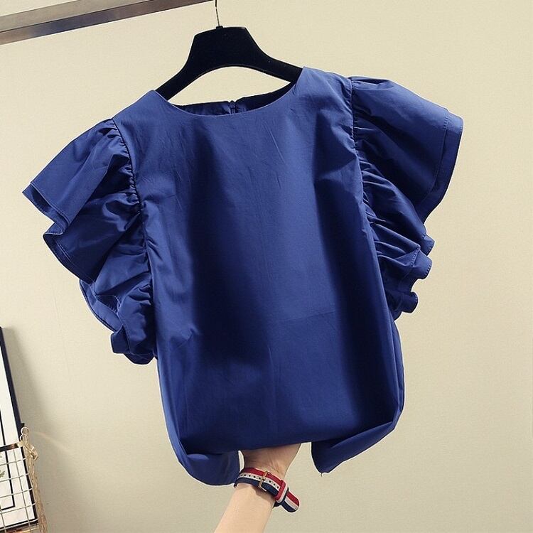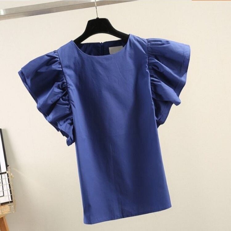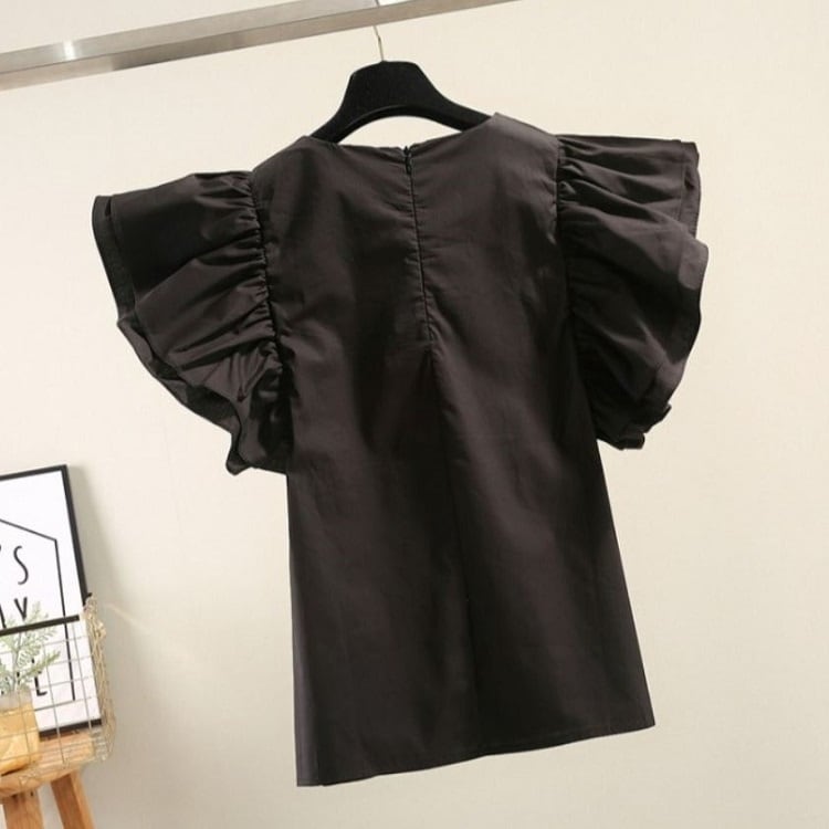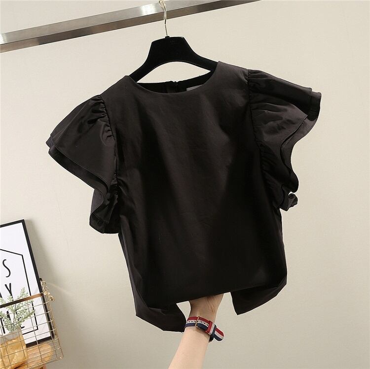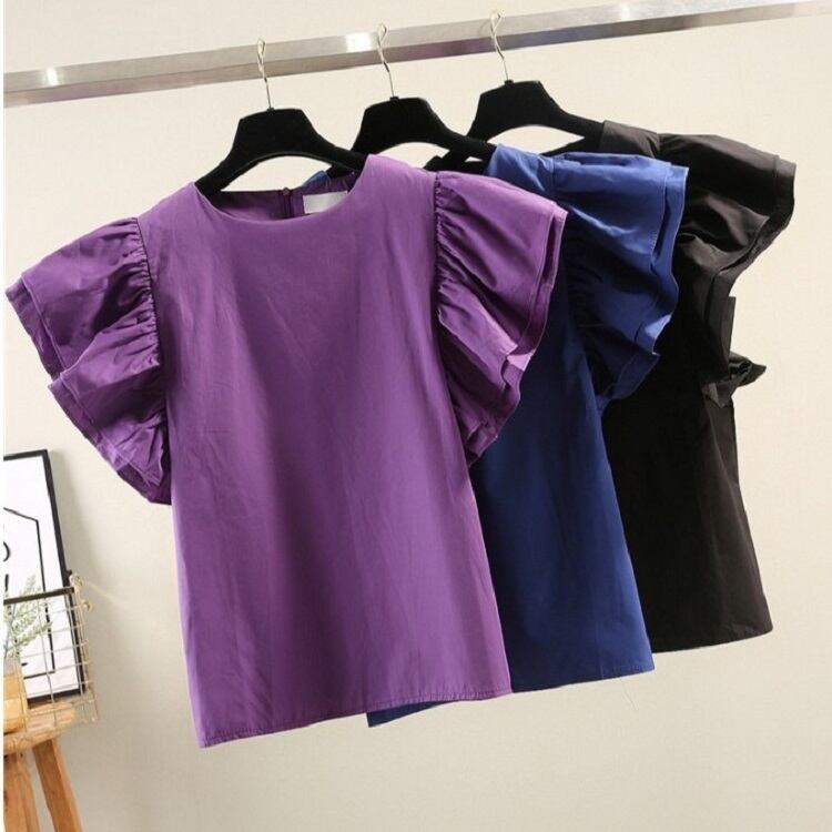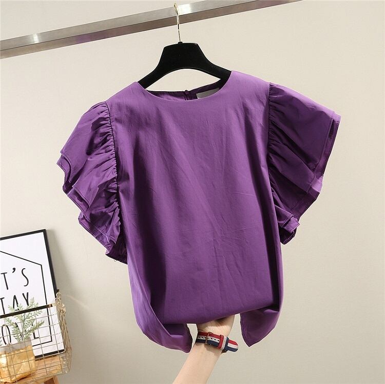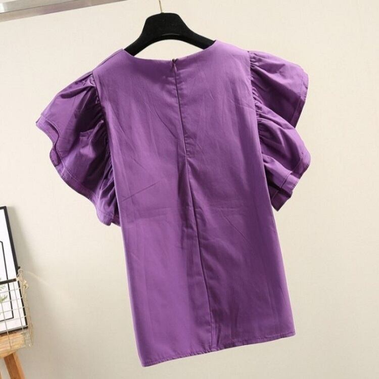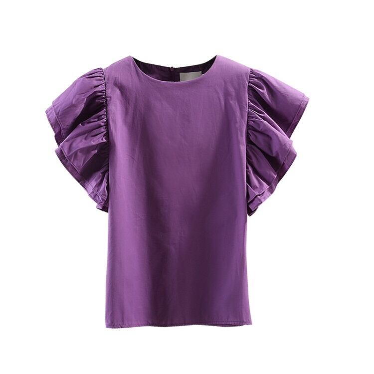 全4色 フリル袖 ブラウス ラウンドネック シンプル 無地 プルオーバー フェミニン レトロ カジュアル お出かけ デート オフィス デイリー 普段着 夏 ブラック ブルー パープル ホワイト