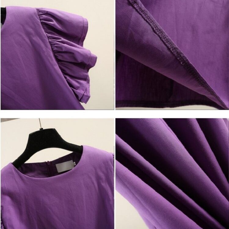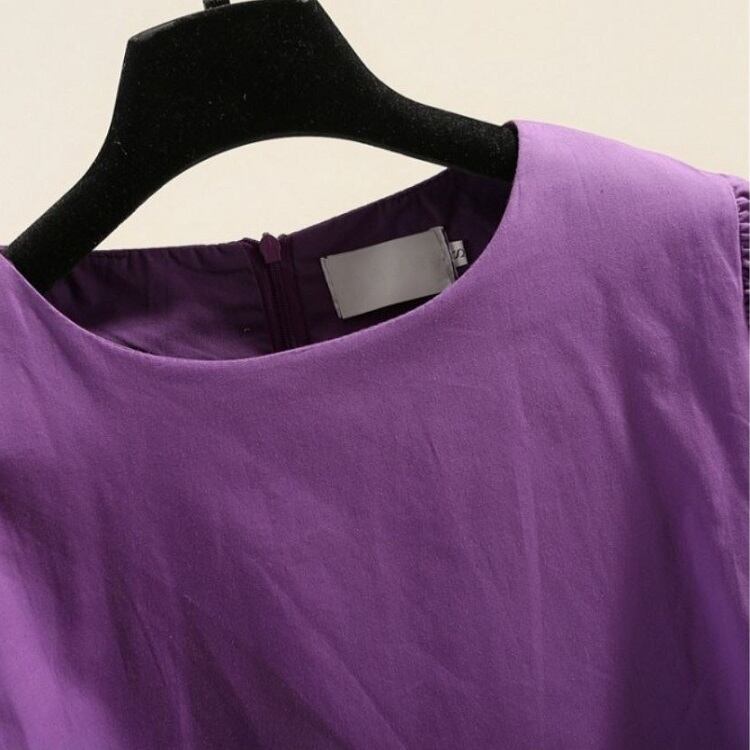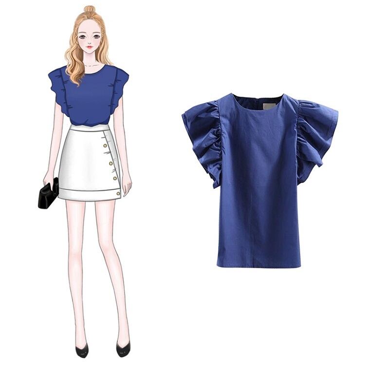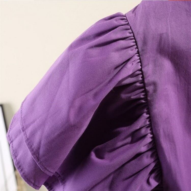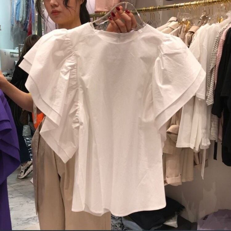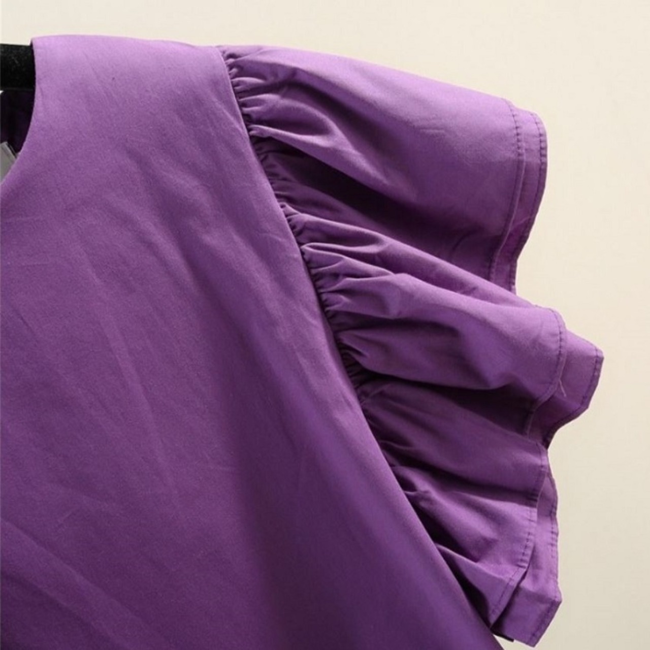 全4色 フリル袖 ブラウス ラウンドネック シンプル 無地 プルオーバー フェミニン レトロ カジュアル お出かけ デート オフィス デイリー 普段着 夏 ブラック ブルー パープル ホワイト