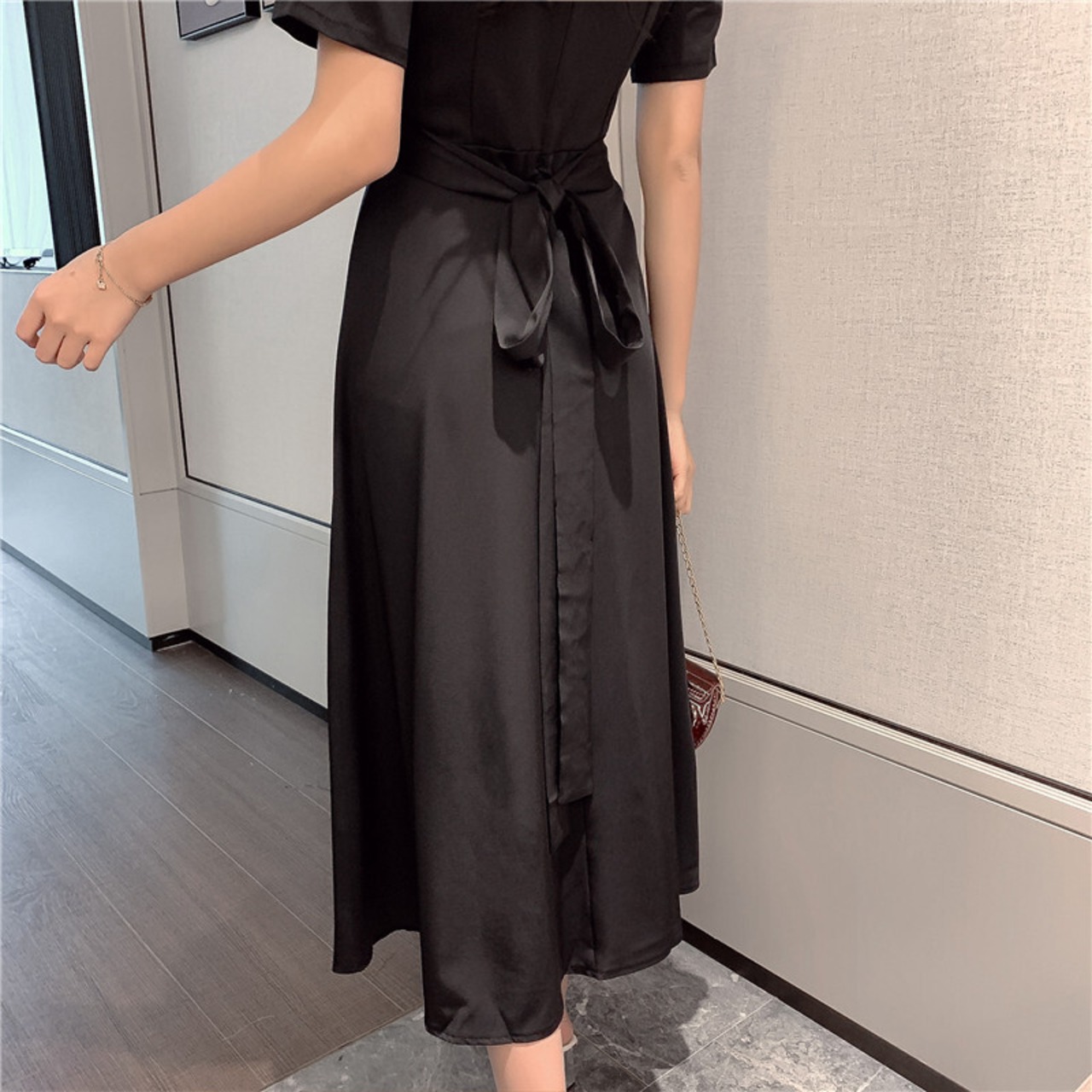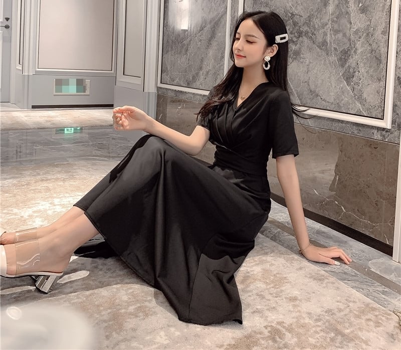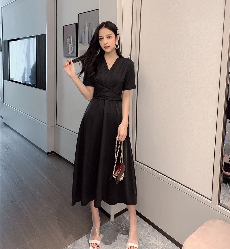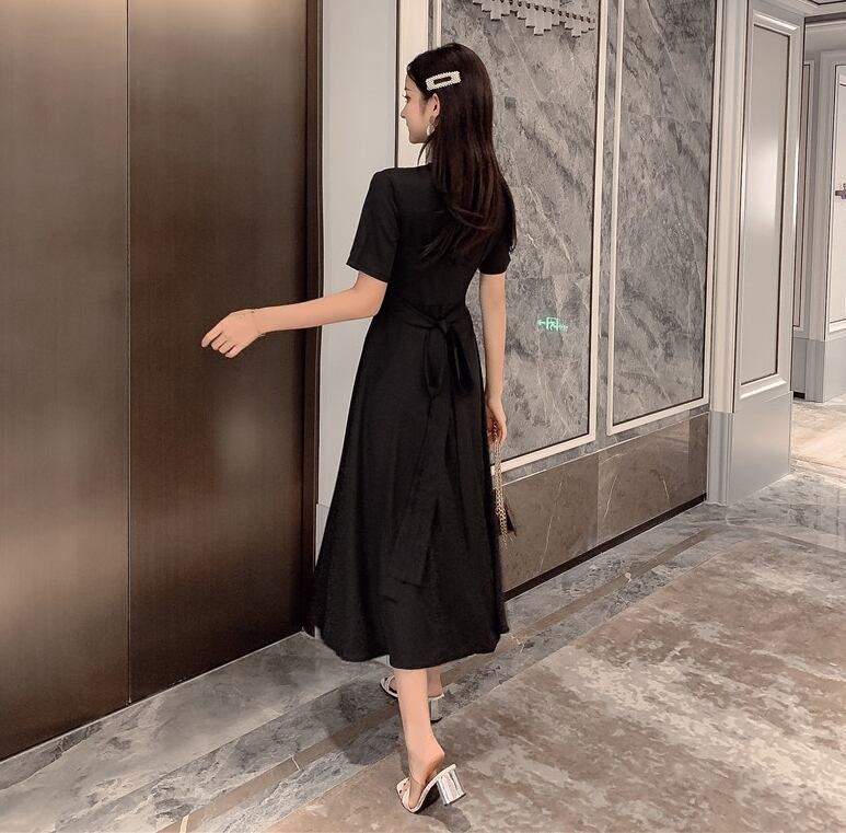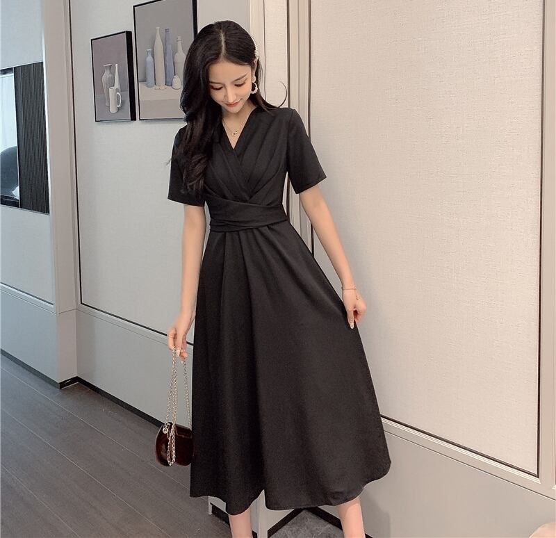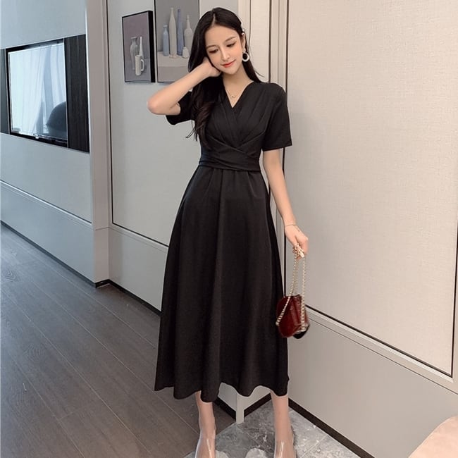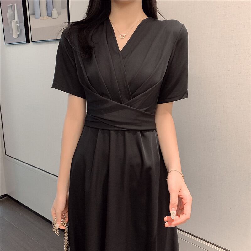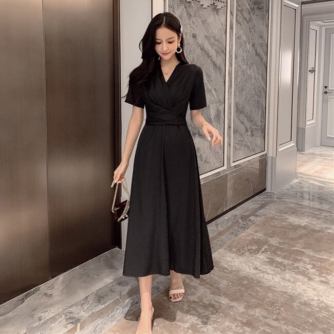 ワンピース ミモレ丈 カシュクールワンピ Vネック フレア ウエストシャーリング ハイウエスト 半袖 バックリボン 無地 カジュアル 大人 きれいめ デート 春 夏
