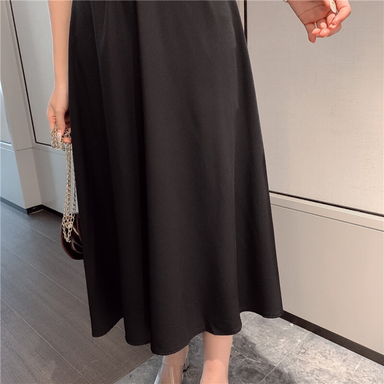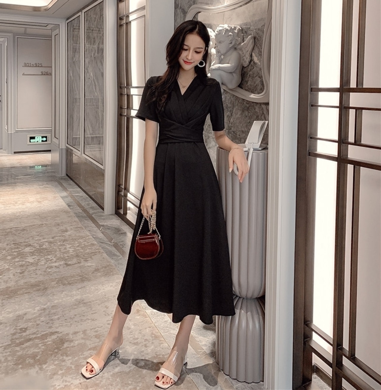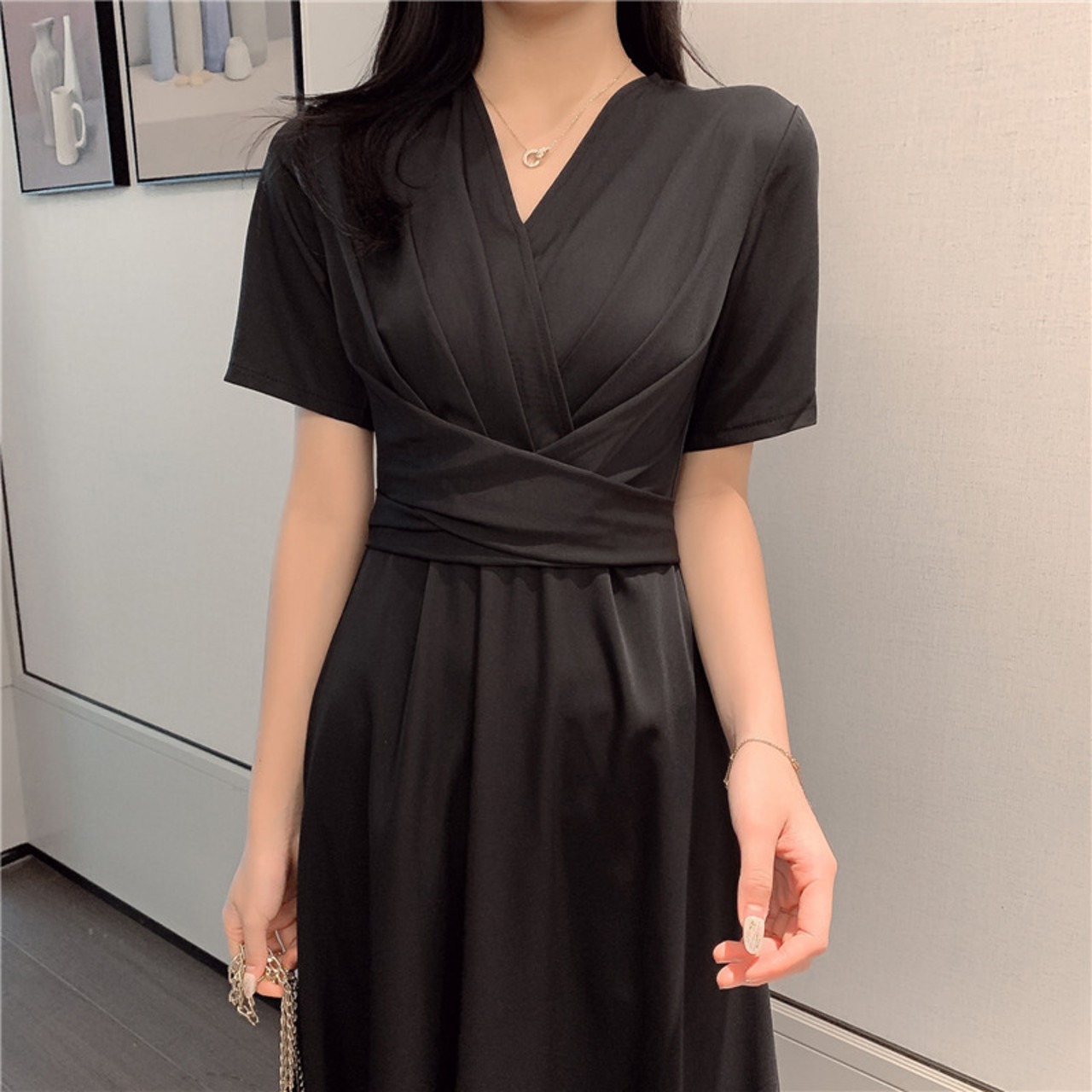 カシュクールネックが上品なミモレ丈ワンピース。