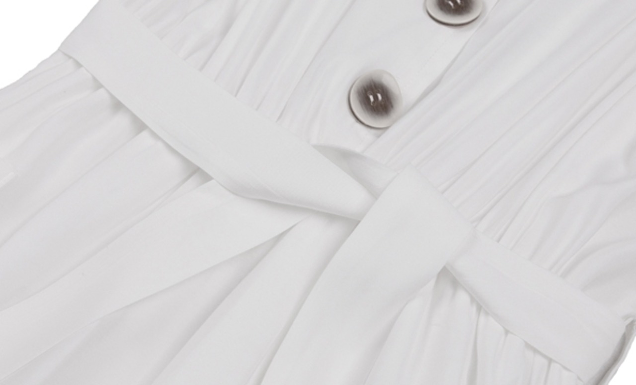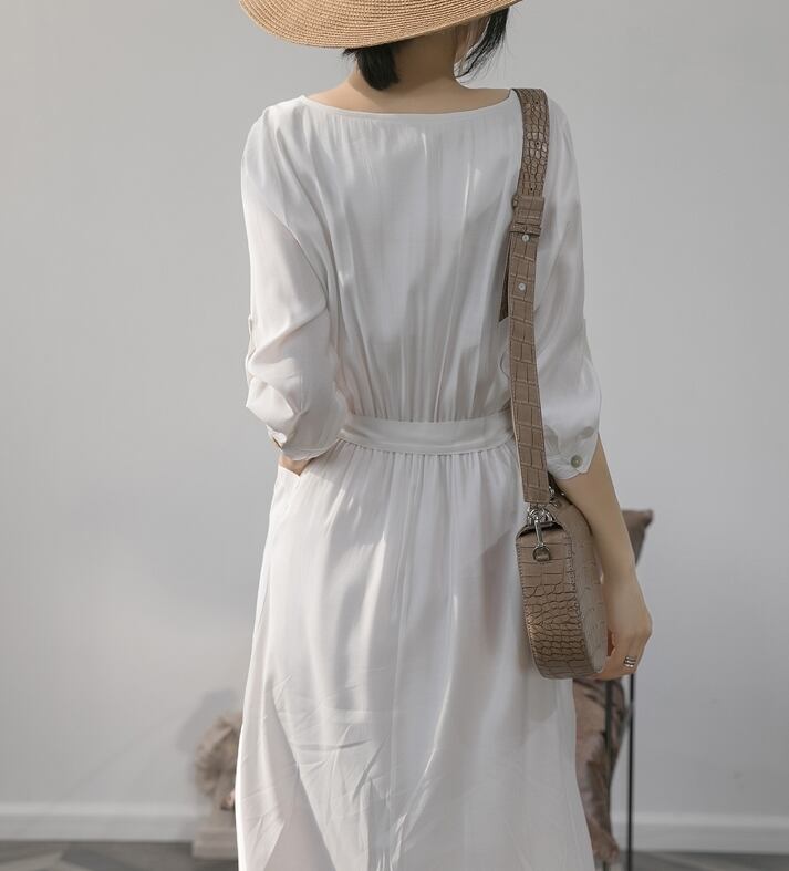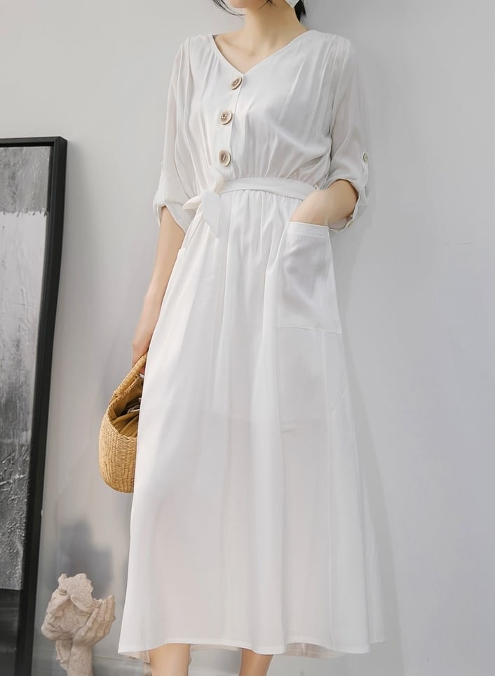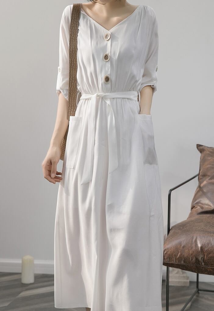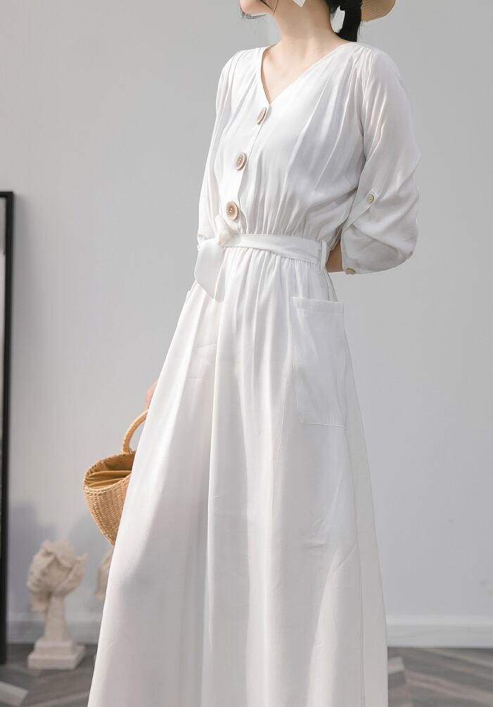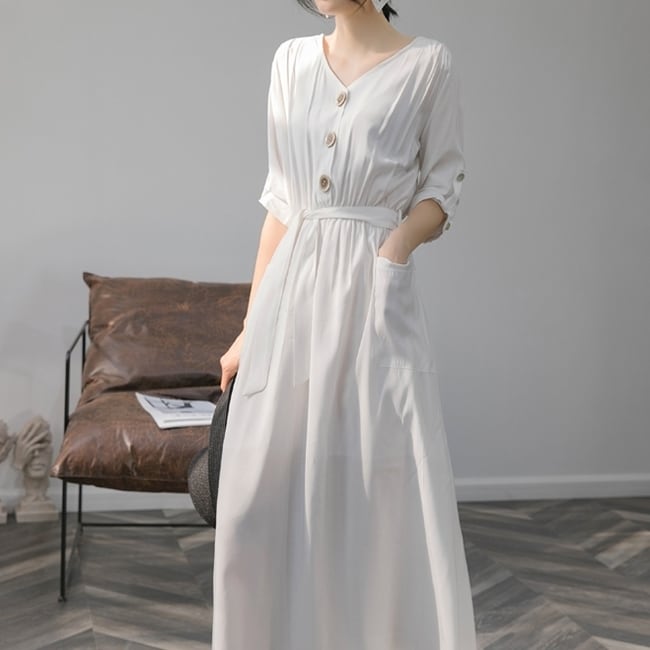 全2色 ワンピース ロング丈 サマードレス フレア ボタン ハイウエスト Vネック ロールアップ袖 ウエストリボン 7分袖 カジュアル 大人 デート リゾート きれいめ 無地 春 夏