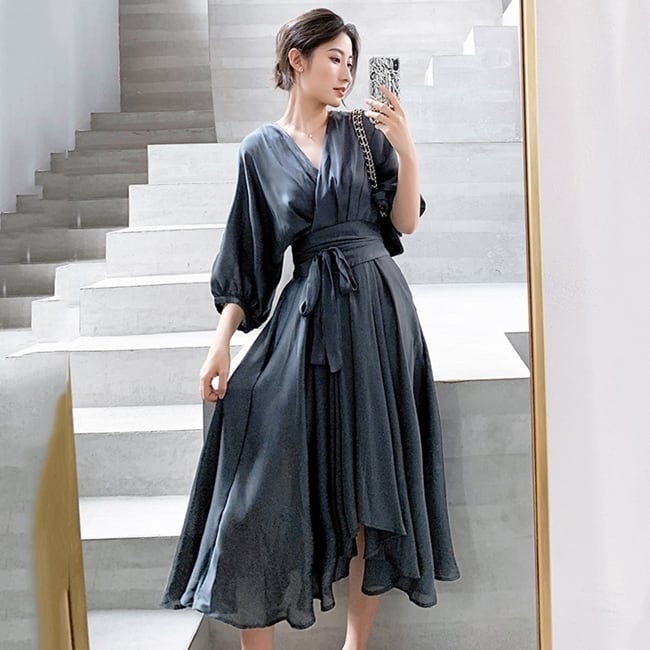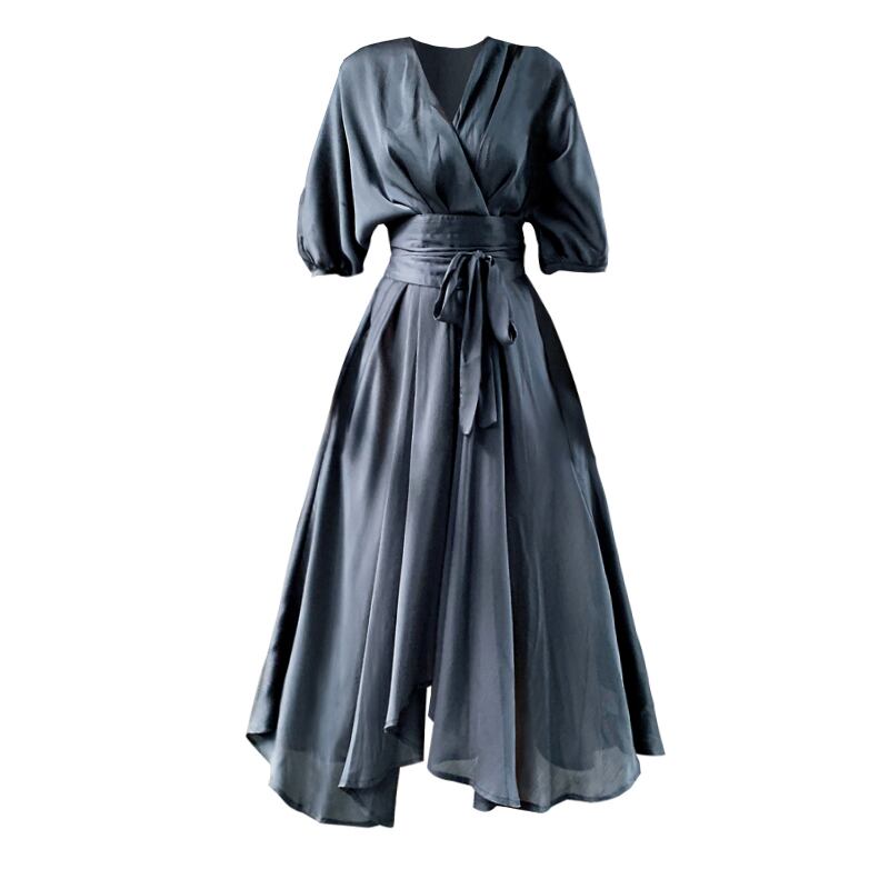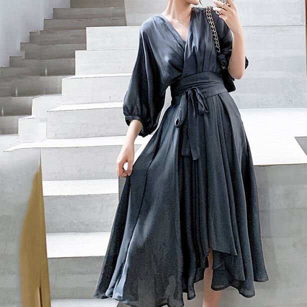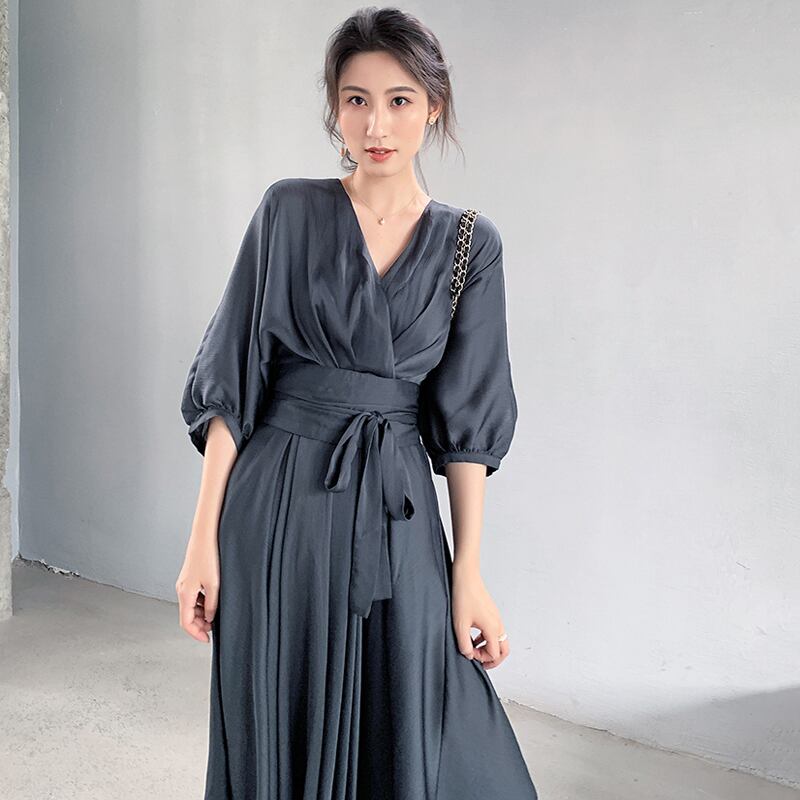 ワンピース ドレス アシンメトリー カシュクールワンピ ウエストリボン フレア Vネック 7分袖 ハイウエスト とろみ素材 上品 レトロ カジュアル きれいめ デート 女子会 春 夏