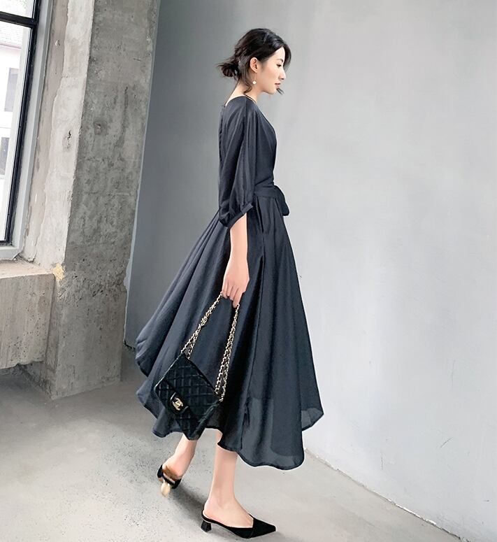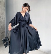 アシンメトリーデザインがおしゃれなで大人っぽい印象のワンピースドレス。