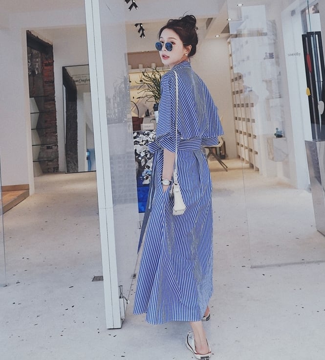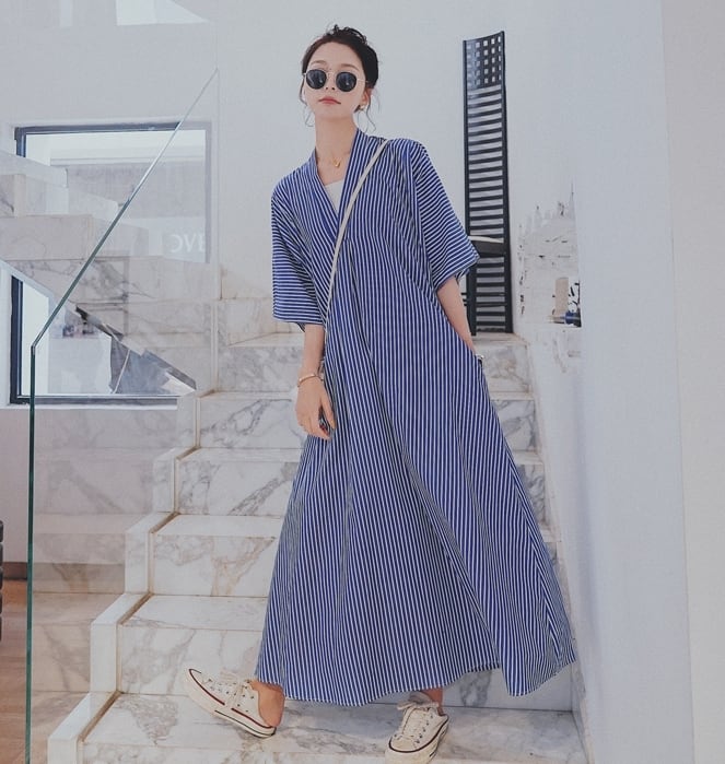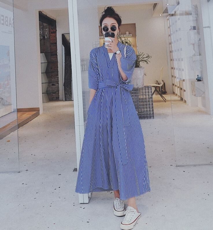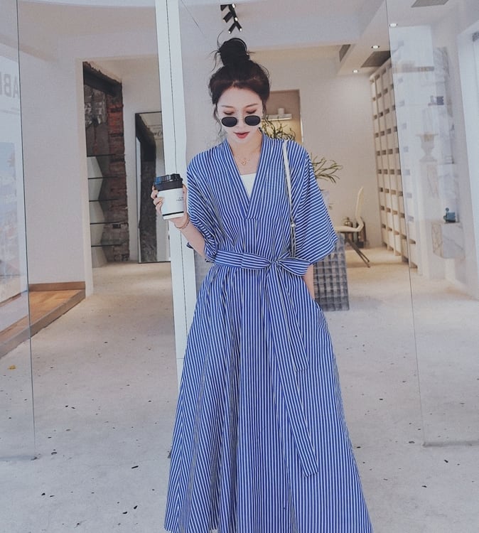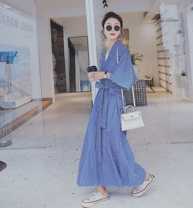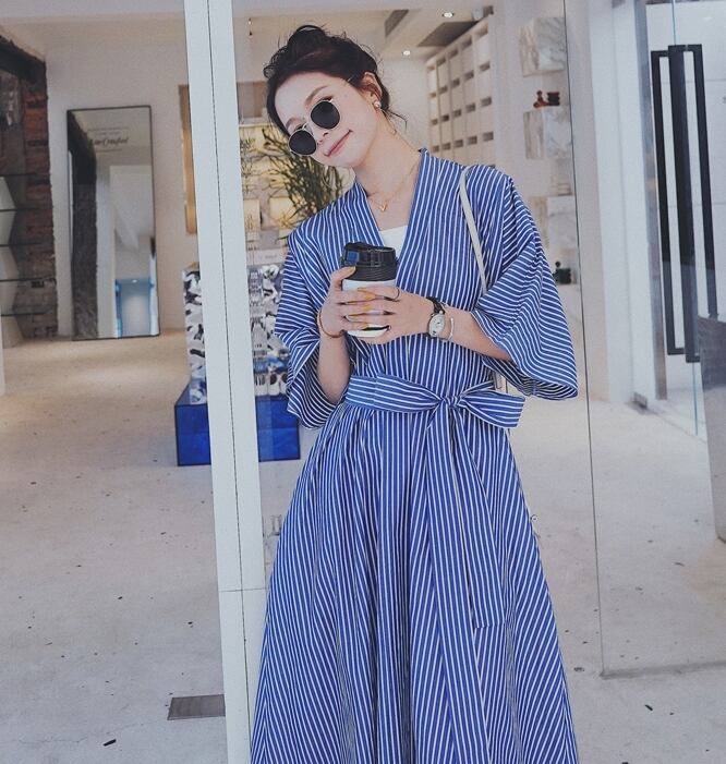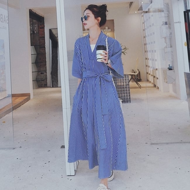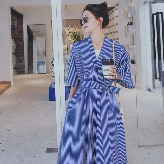 ワンピース ロング丈 カシュクールワンピ ストライプ Vネック フレア ゆったり オーバーサイズ 7分袖 ウエストリボン カジュアル デイリー 体型カバー お出かけ 春 夏