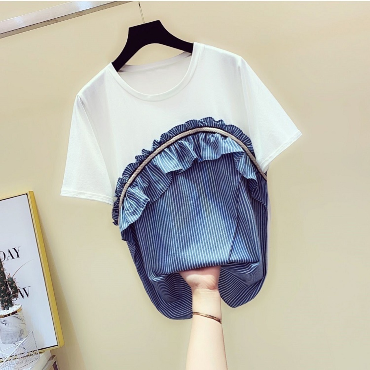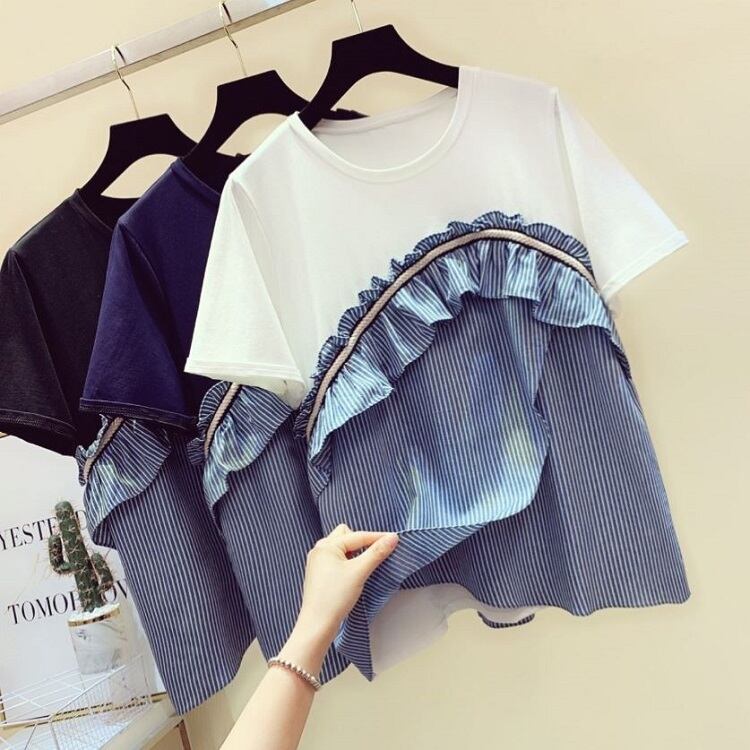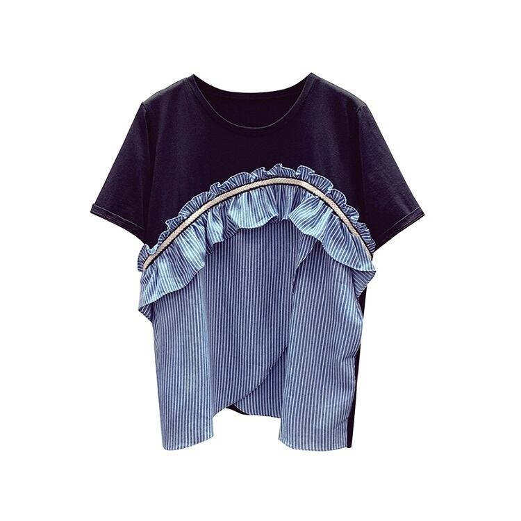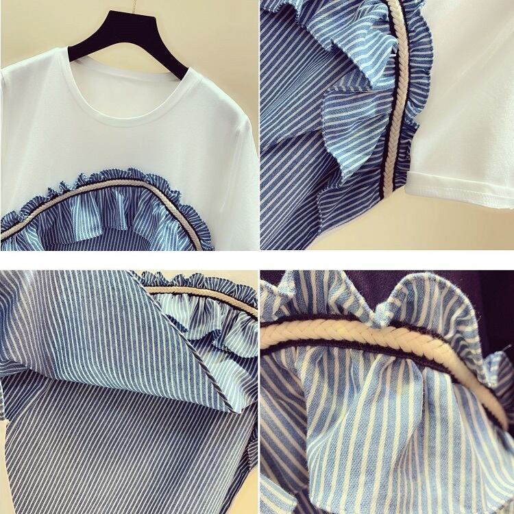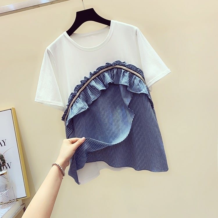 全3色 Tシャツ トップス ドッキングTシャツ ストライプ フリル ラウンドネック 半袖 プルオーバー かわいい レトロ カジュアル お出かけ デイリー 普段着 夏 ホワイト ブルー ブラック