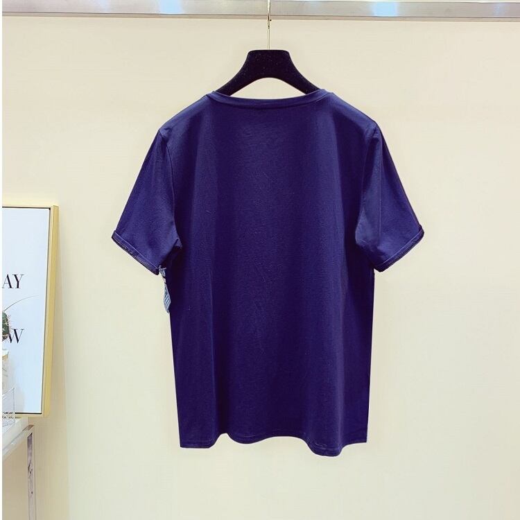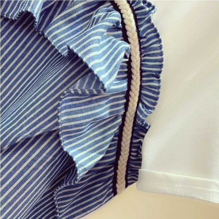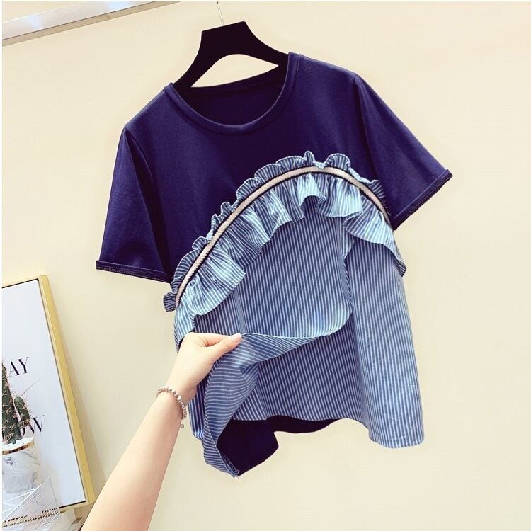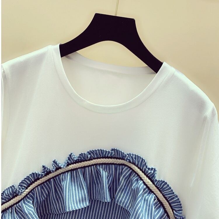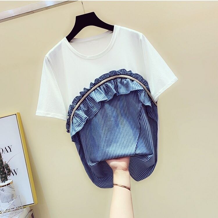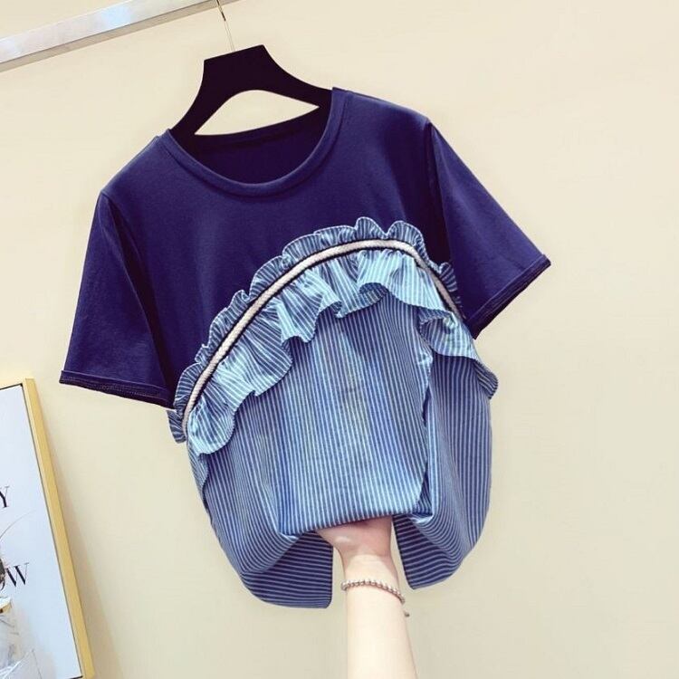 全3色 Tシャツ トップス ドッキングTシャツ ストライプ フリル ラウンドネック 半袖 プルオーバー かわいい レトロ カジュアル お出かけ デイリー 普段着 夏 ホワイト ブルー ブラック