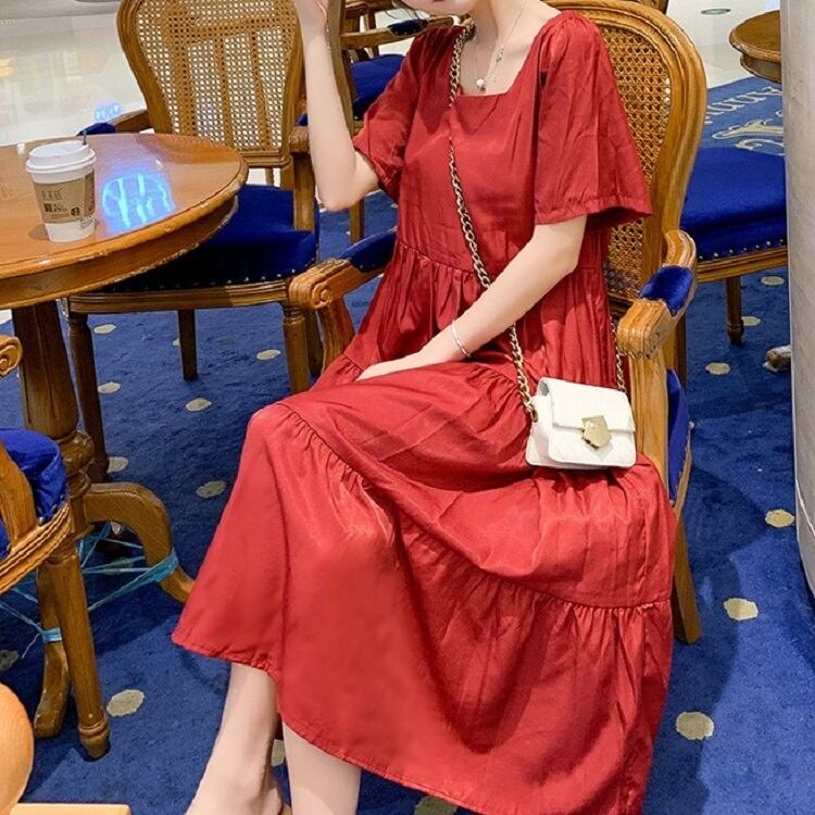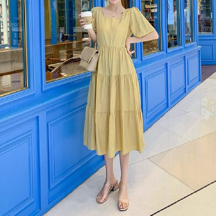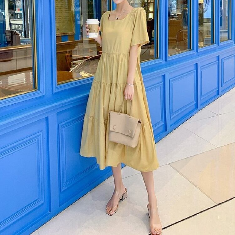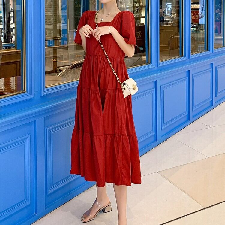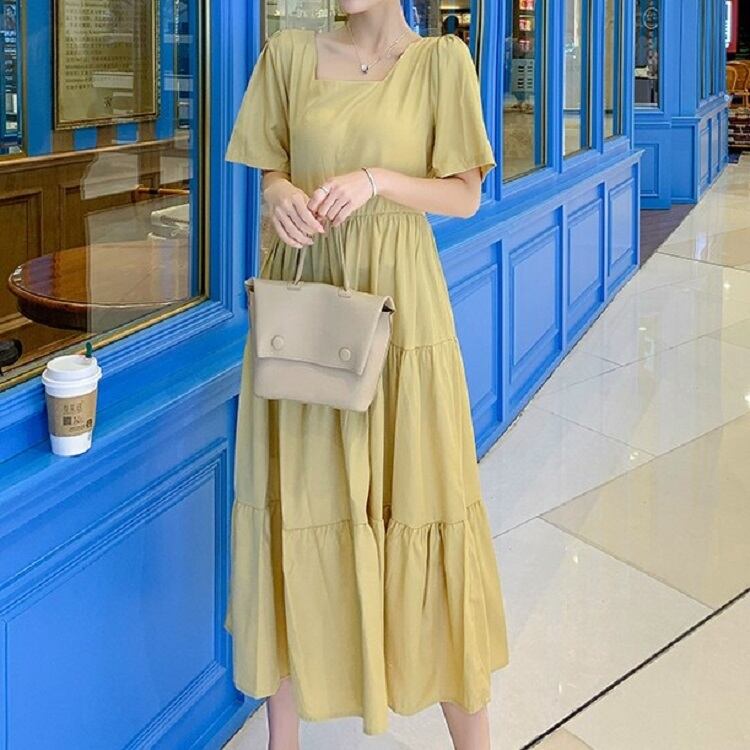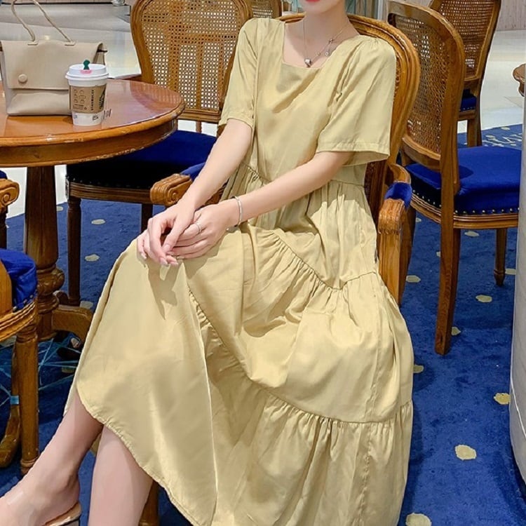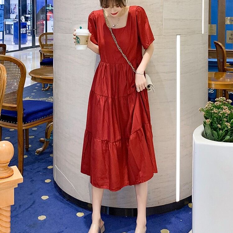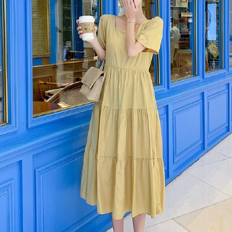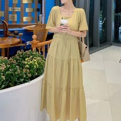 全2色 ワンピース ティアードスカート 半袖 ロング丈 スクエアカラー 無地 デート フェミニン きれいめ かわいい マタニティ レトロ カジュアル お出かけ デイリー 夏 ワインレッド イエロー