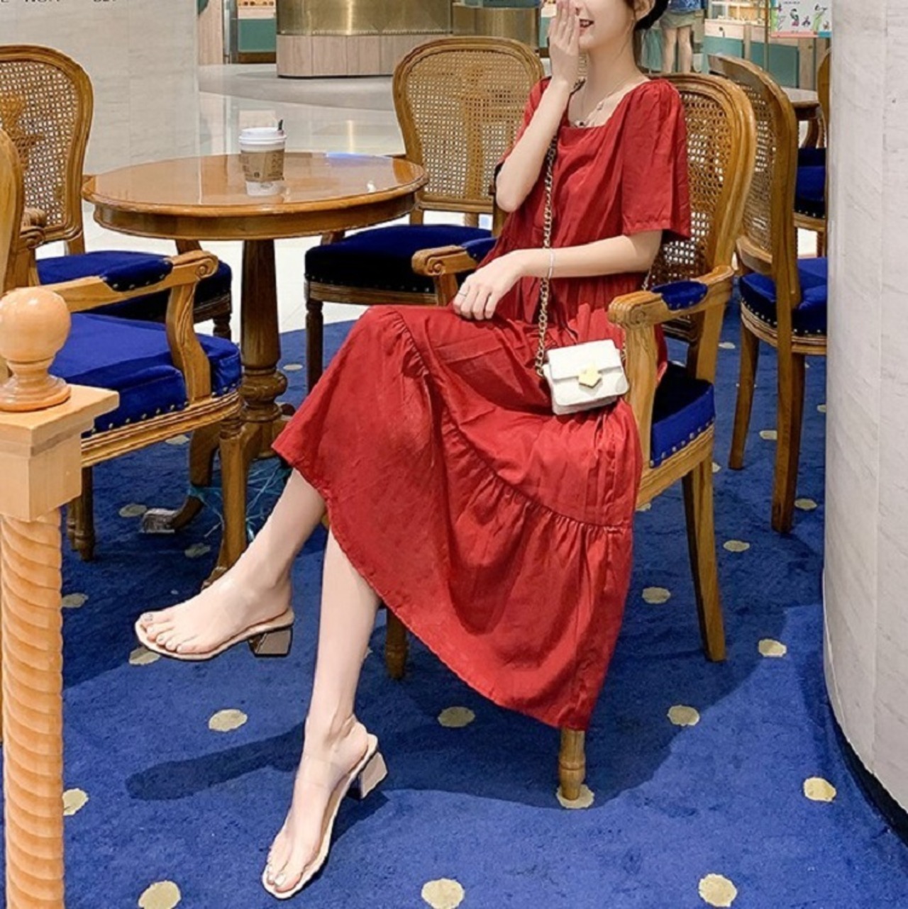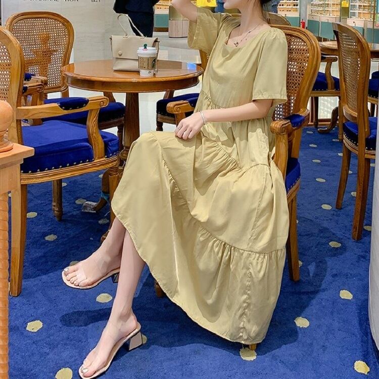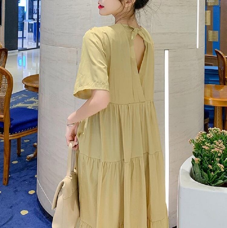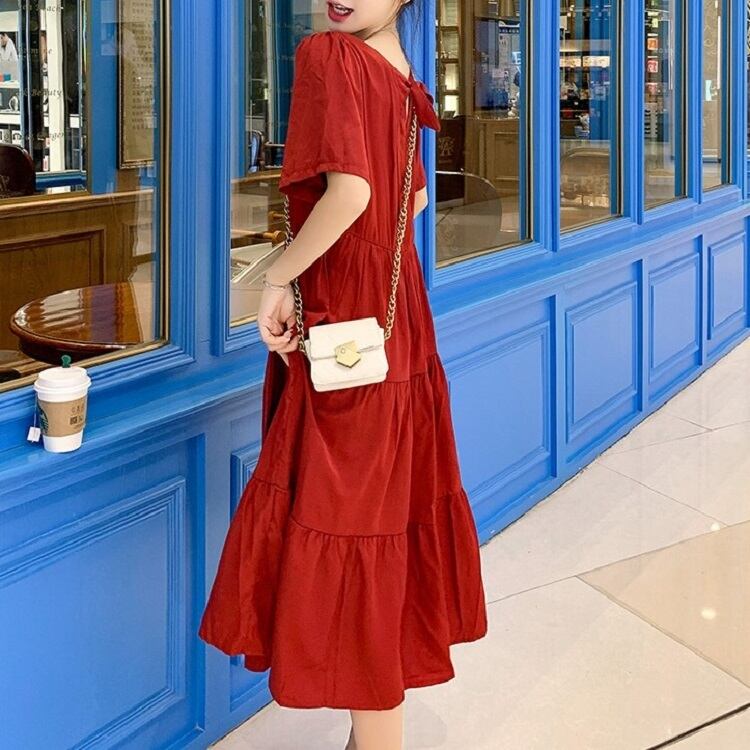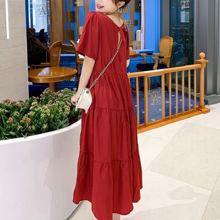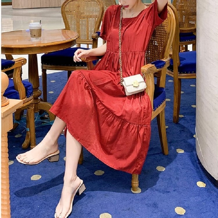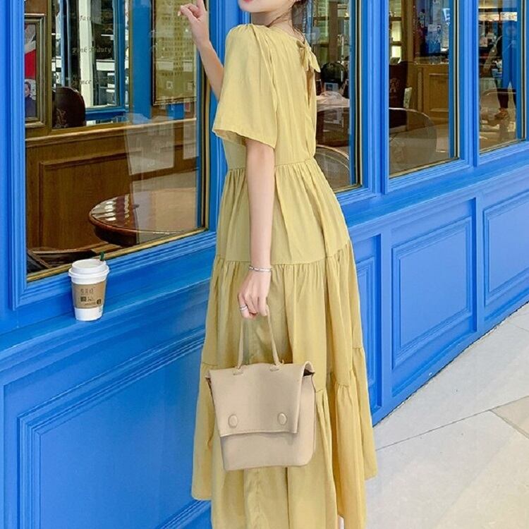 全2色 ワンピース ティアードスカート 半袖 ロング丈 スクエアカラー 無地 デート フェミニン きれいめ かわいい マタニティ レトロ カジュアル お出かけ デイリー 夏 ワインレッド イエロー