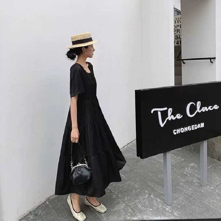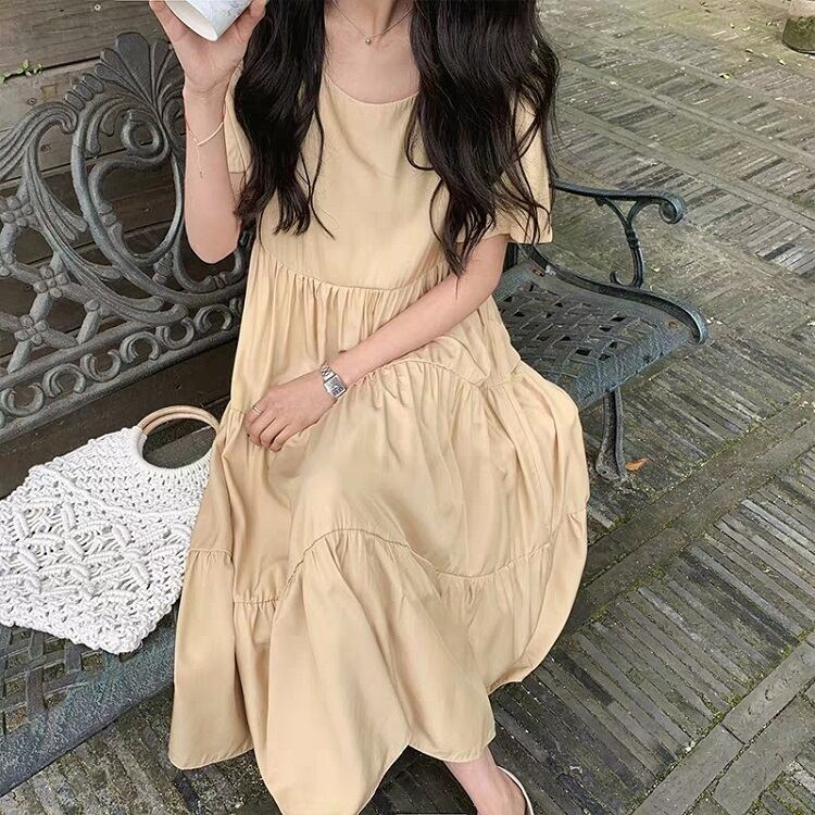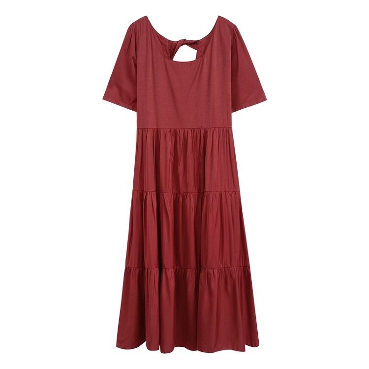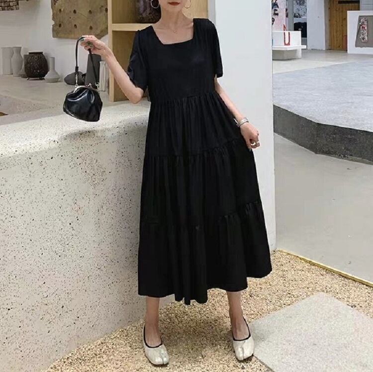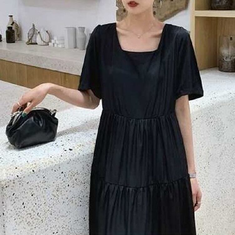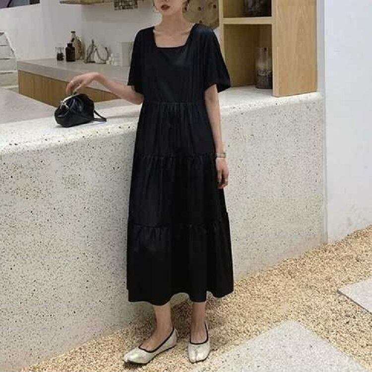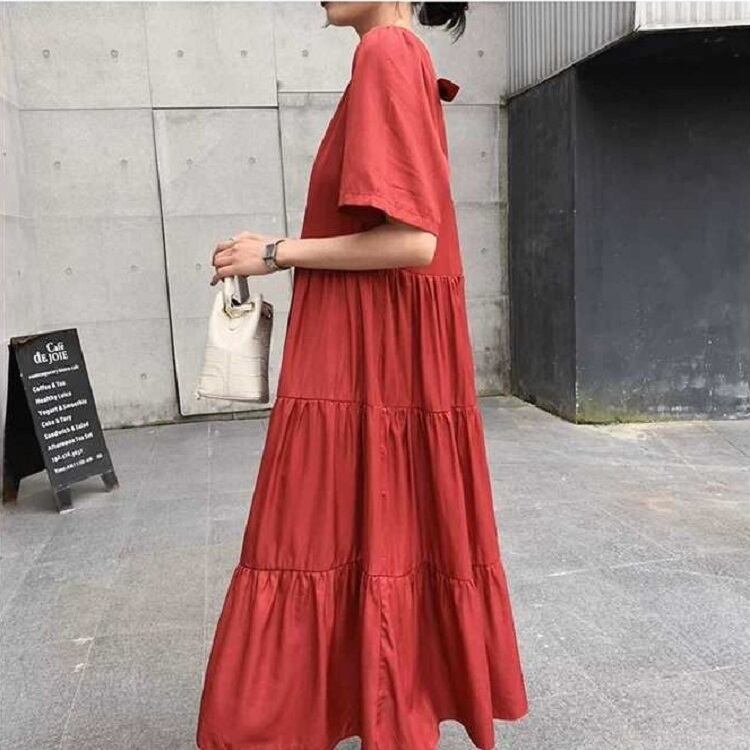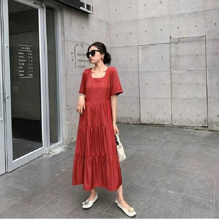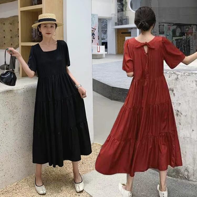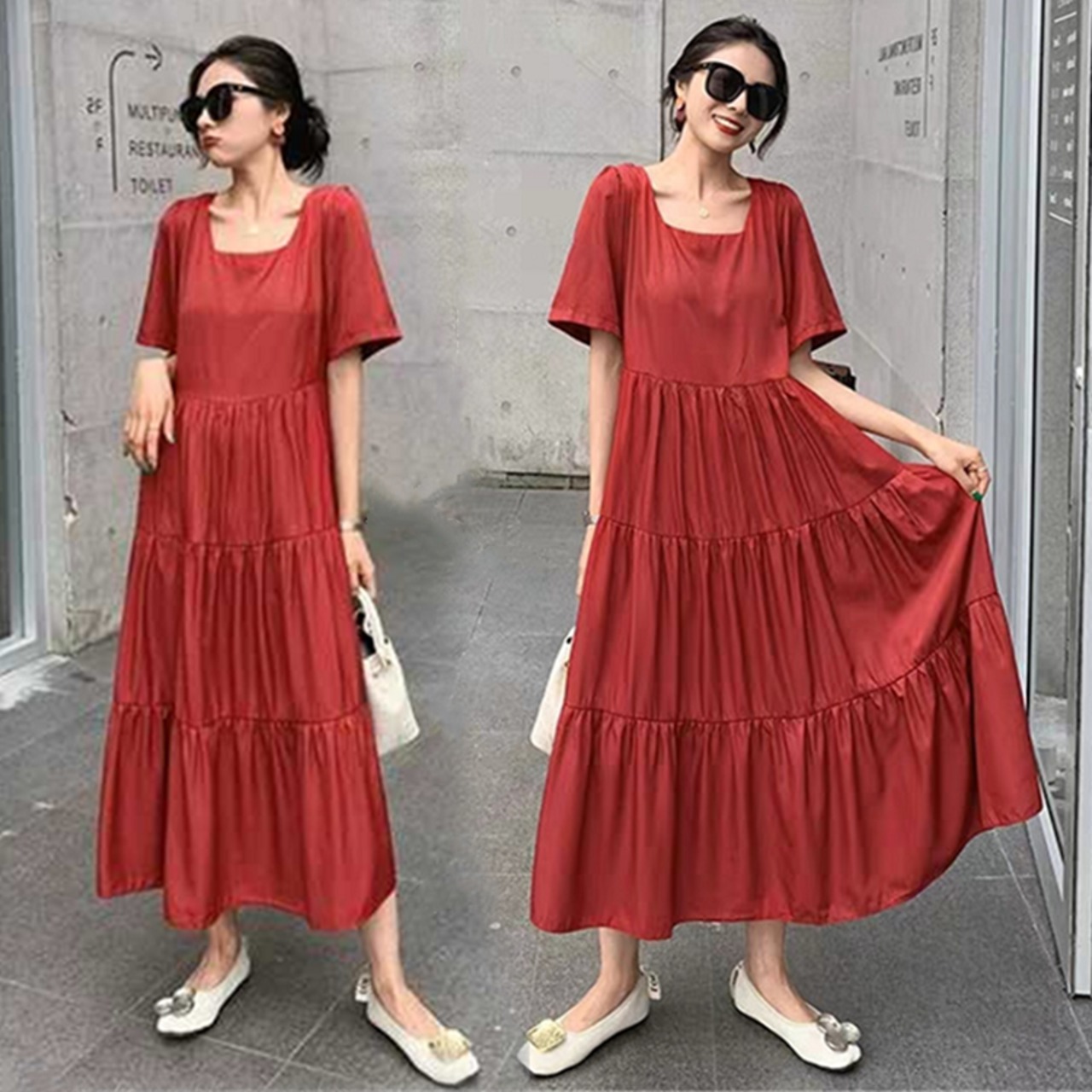 全3色 大きいサイズ ワンピース ティアードスカート 半袖 ロング丈 スクエアカラー 無地 デート フェミニン きれいめ かわいい マタニティ レトロ カジュアル お出かけ デイリー 夏 2XL 3XL 4XL レッド イエロー ブラック