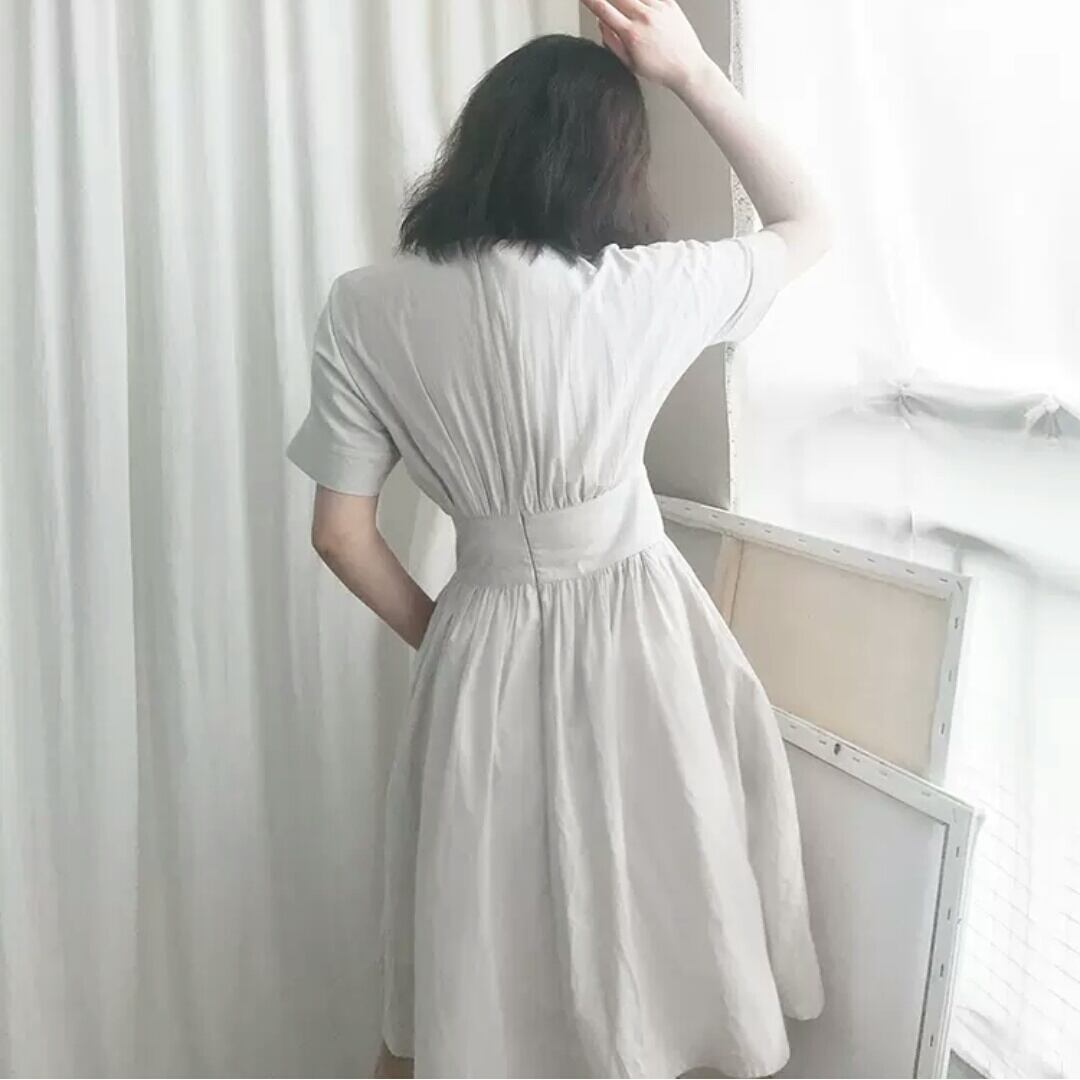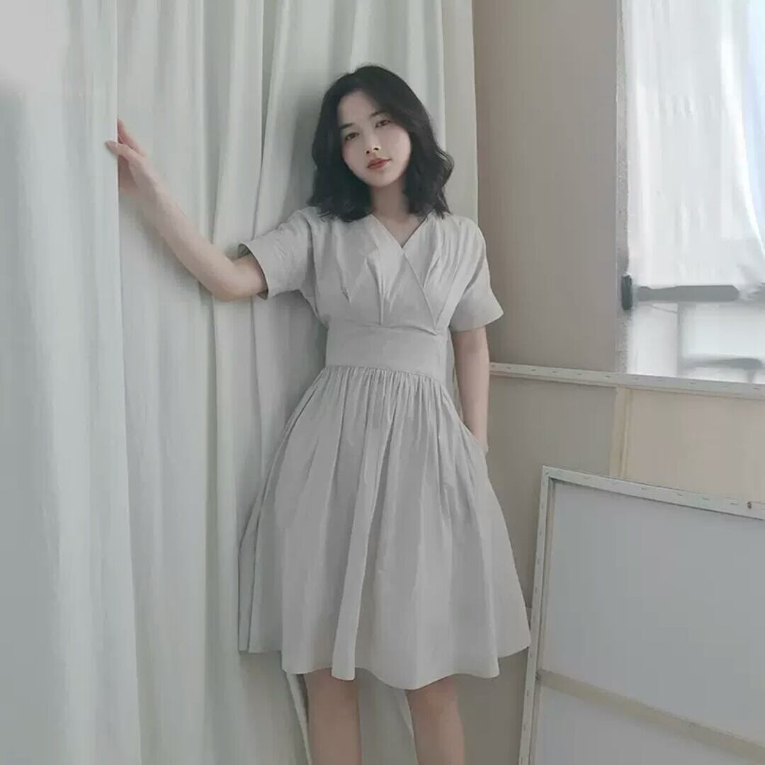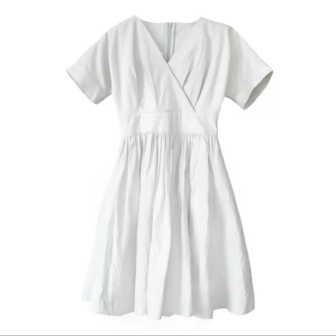 Vネック 半袖 コットン 無地 シンプル ワンピース ショート丈 プリーツ 大人 カジュアル 可愛い キレイめ お出かけ お買い物 デート 女子会 通勤 通学 学生 韓国ファッション 春 夏