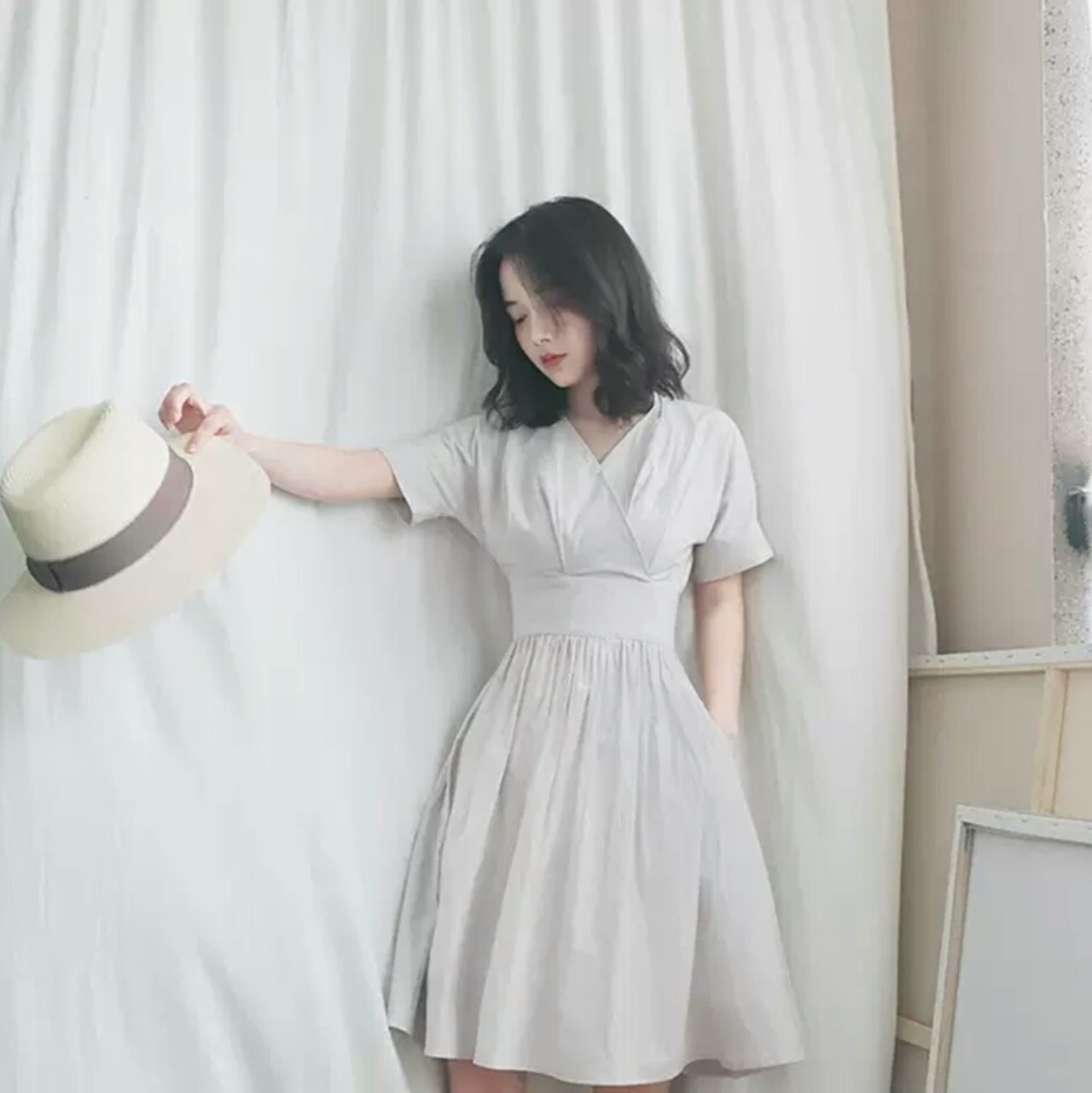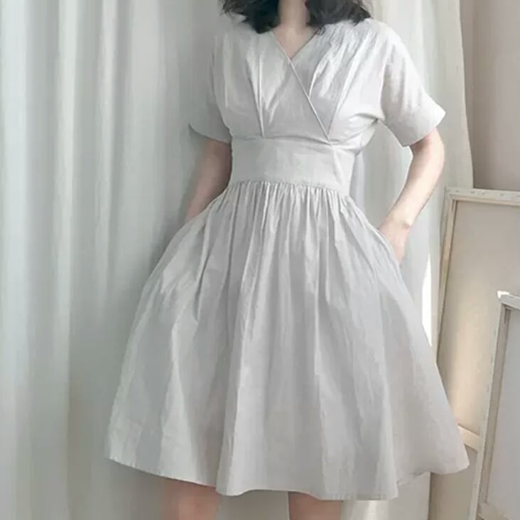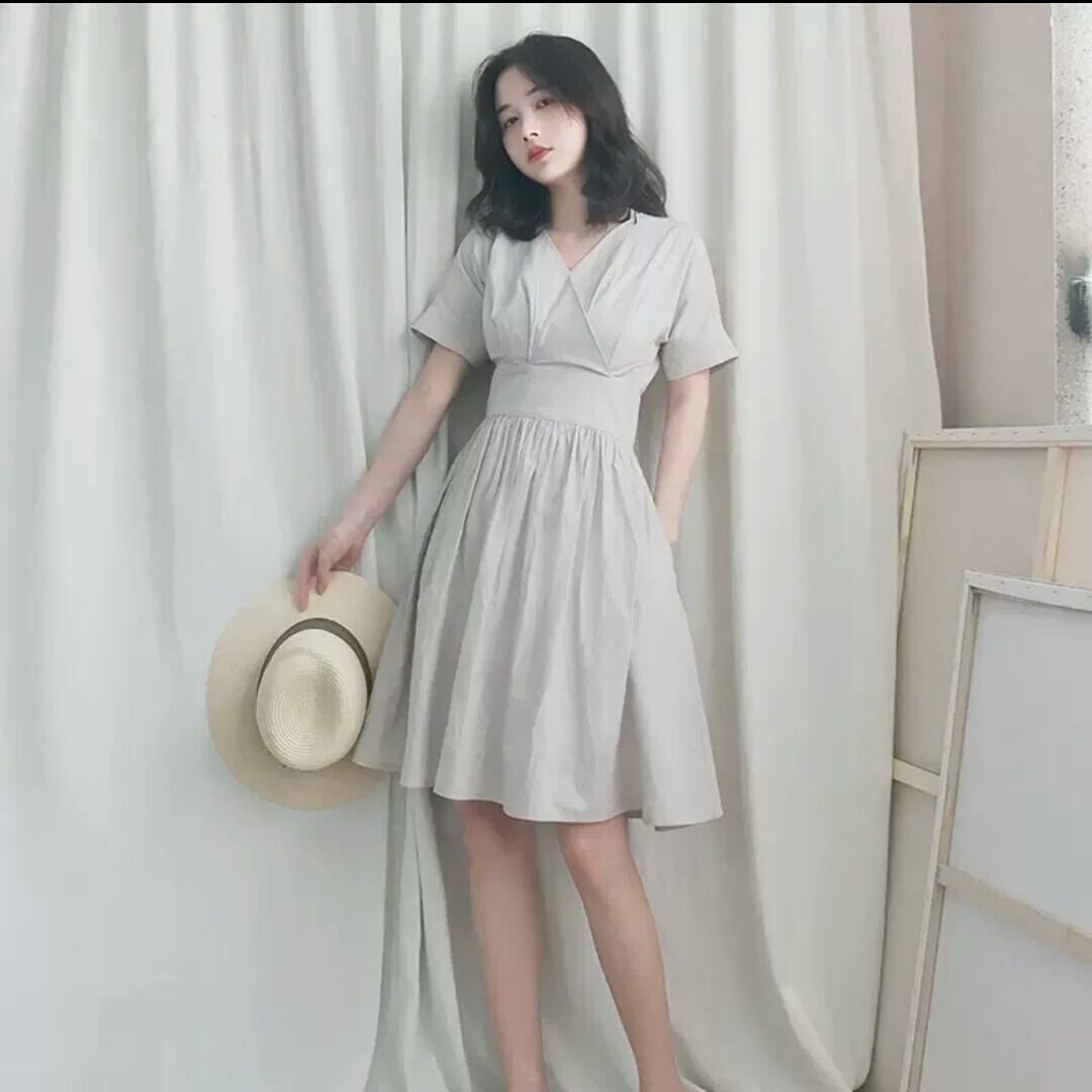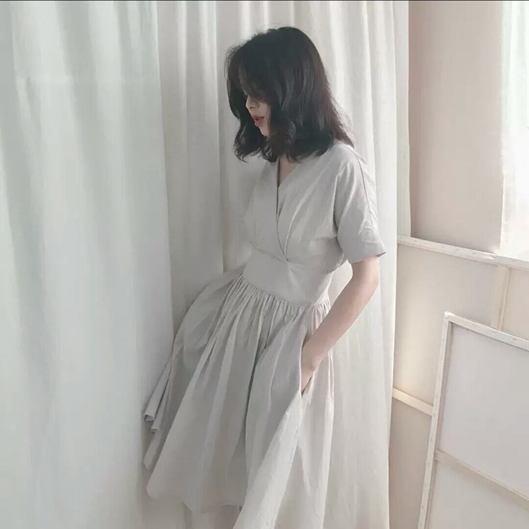 Vネック 半袖 コットン 無地 シンプル ワンピース ショート丈 プリーツ 大人 カジュアル 可愛い キレイめ お出かけ お買い物 デート 女子会 通勤 通学 学生 韓国ファッション 春 夏