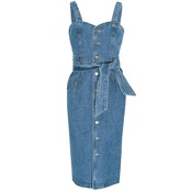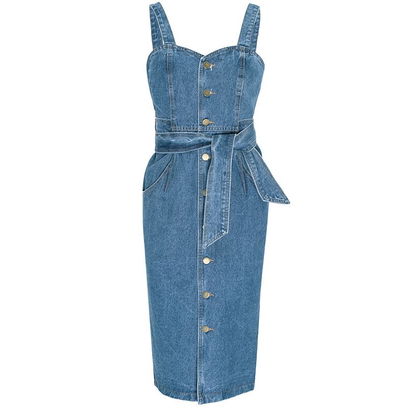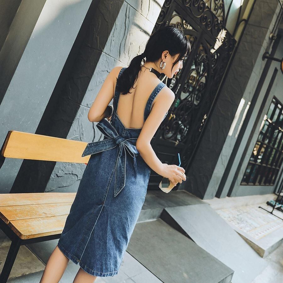 ワンピース サロペットスカート ジャンパースカート デニム バックコンシャス バックシャン 背中見せ ウエストリボン スリム タイト フロントボタン ミディ丈 カジュアル きれいめ 大人可愛い デート 春 夏