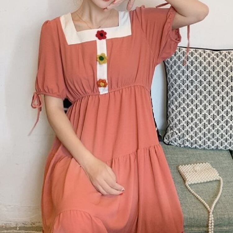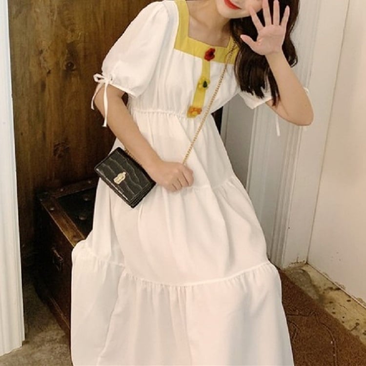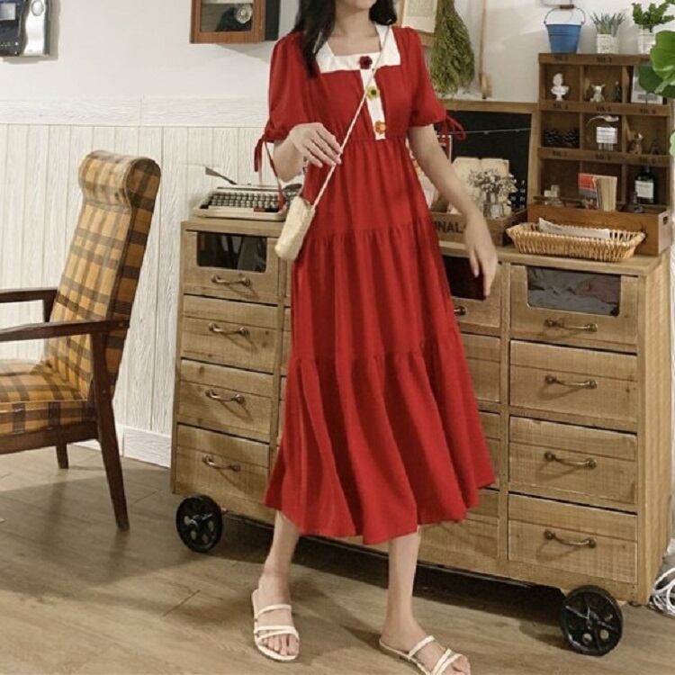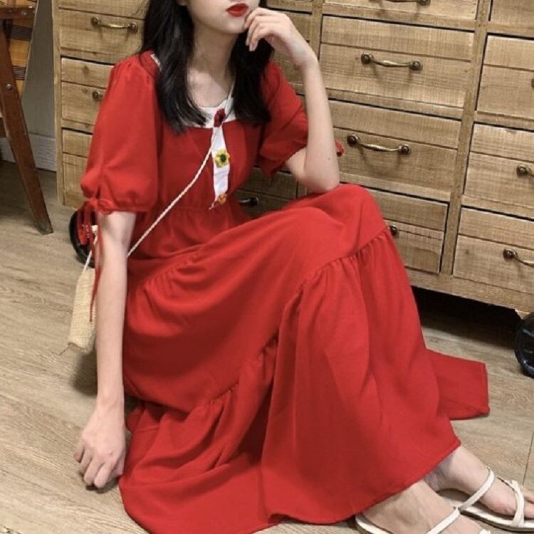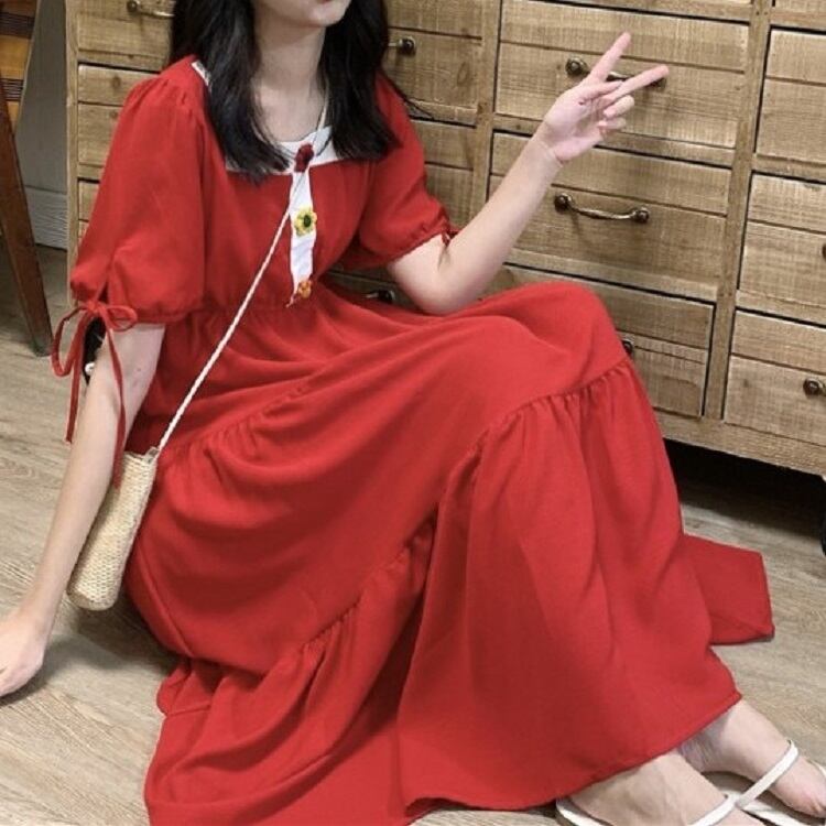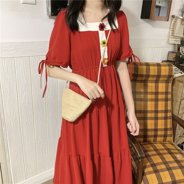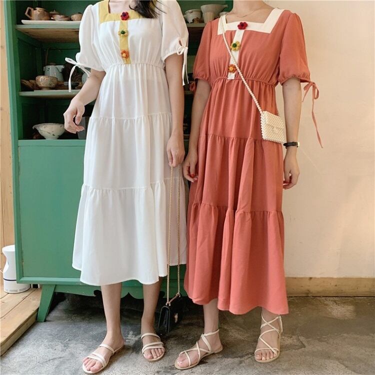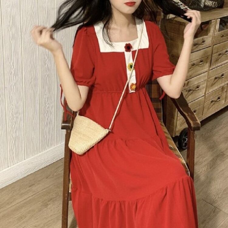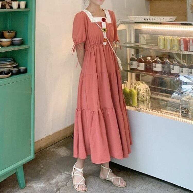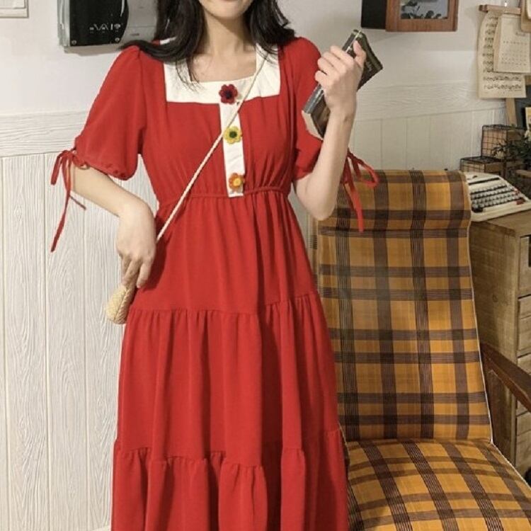 全3色 ワンピース ティアードスカート 半袖 ロング丈 スクエアネック パフスリーブ 無地 デート カジュアル ガーリー きれいめ かわいい レトロ お出かけ 夏 ピンク ホワイト レッド