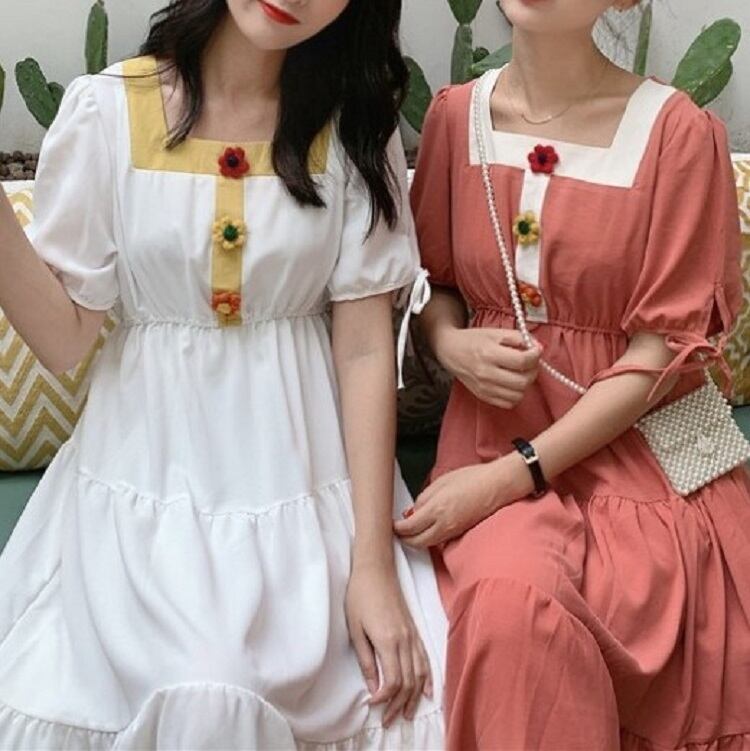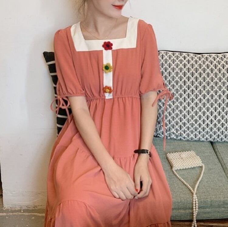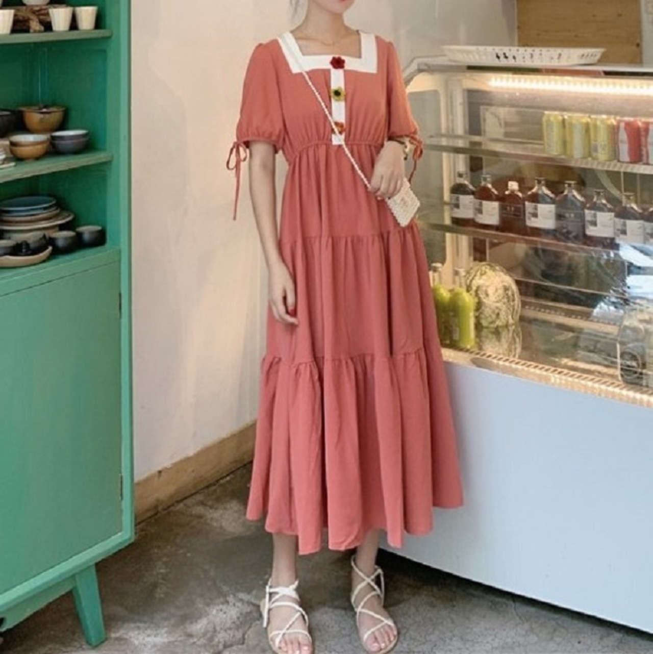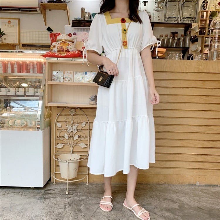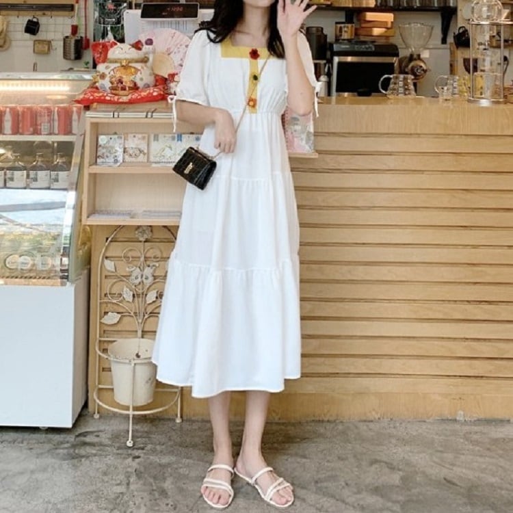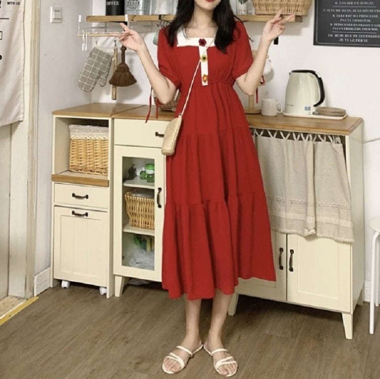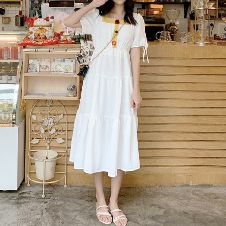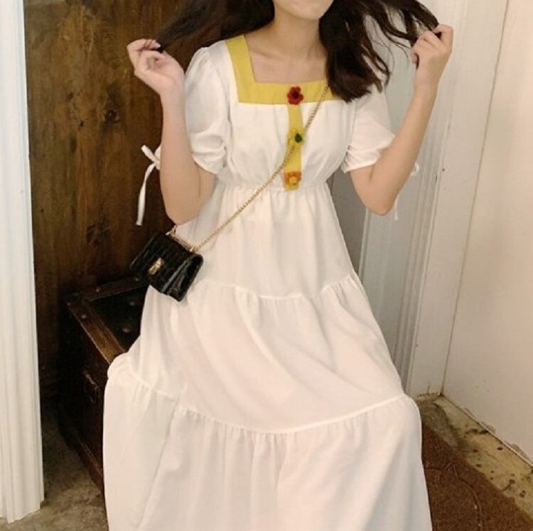 全3色 ワンピース ティアードスカート 半袖 ロング丈 スクエアネック パフスリーブ 無地 デート カジュアル ガーリー きれいめ かわいい レトロ お出かけ 夏 ピンク ホワイト レッド