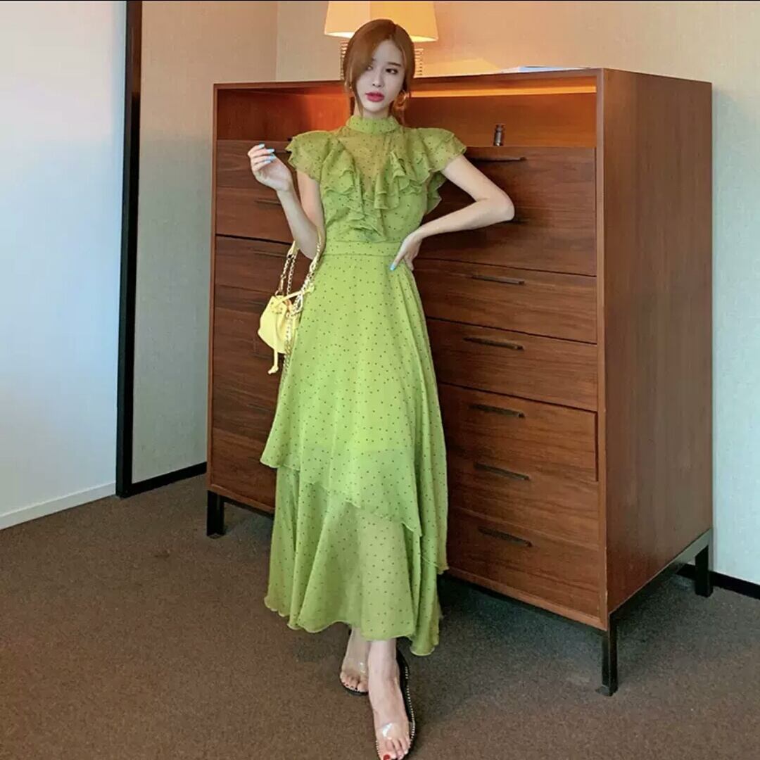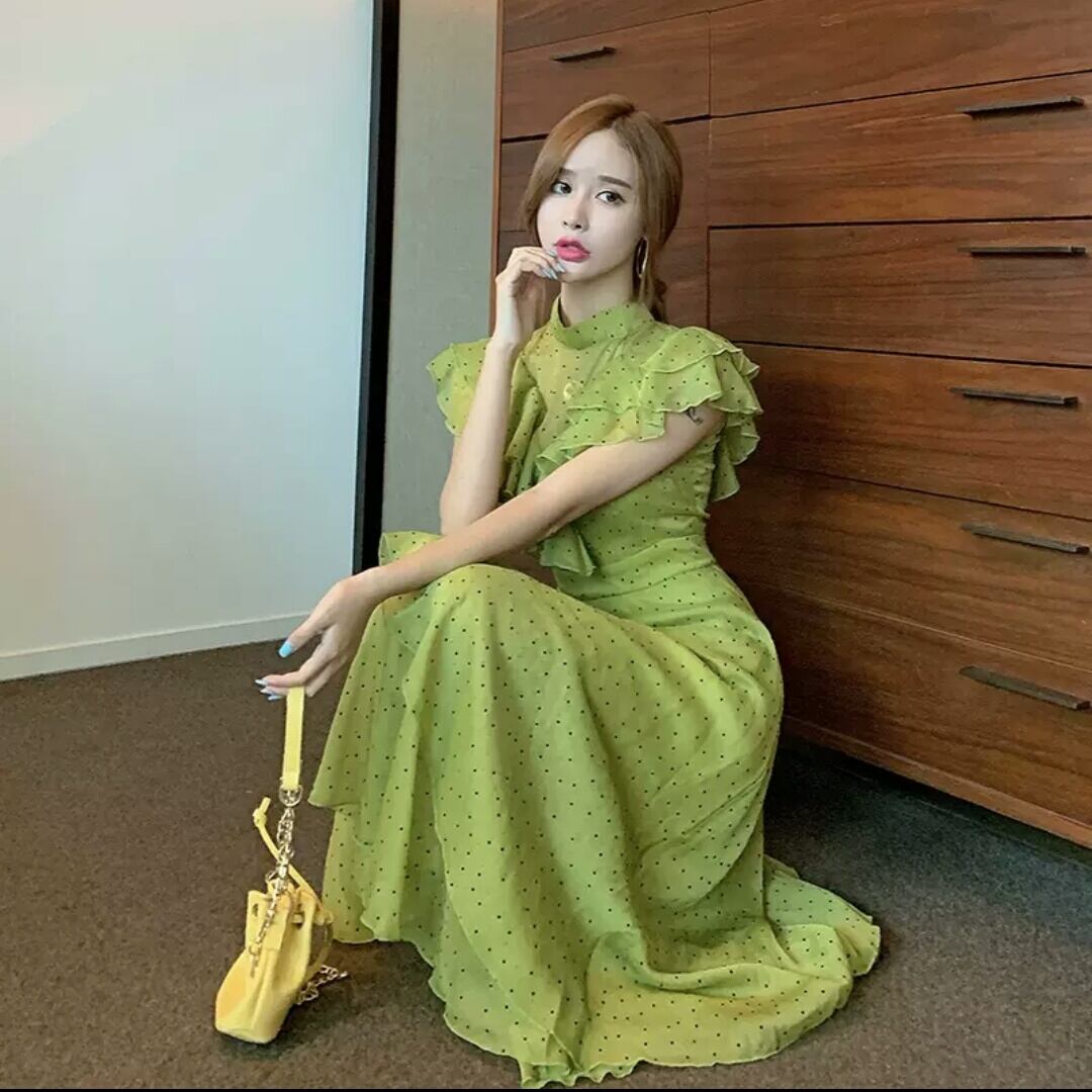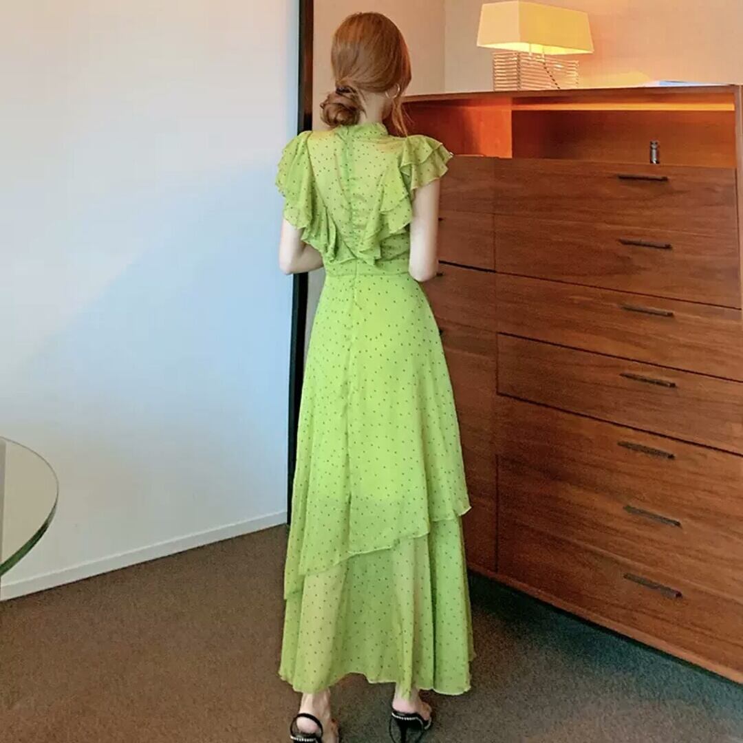 ドット柄 水玉 フリル ロング丈 ワンピース 大人 カジュアル 可愛い キレイめ 上品 お出かけ お買い物 デート 女子会 通勤 通学 学生 韓国ファッション 春 夏