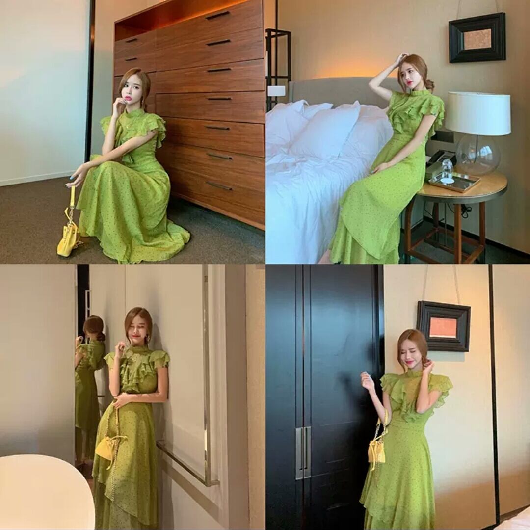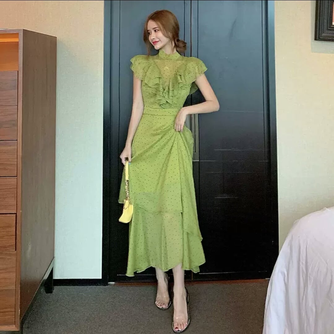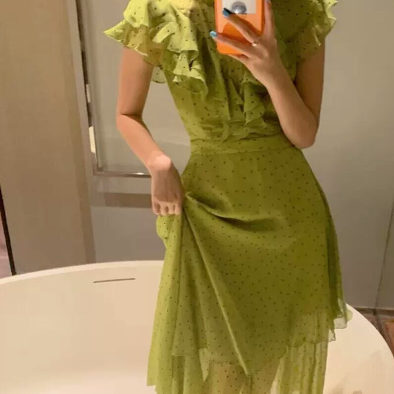 ドット柄 水玉 フリル ロング丈 ワンピース 大人 カジュアル 可愛い キレイめ 上品 お出かけ お買い物 デート 女子会 通勤 通学 学生 韓国ファッション 春 夏