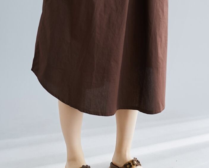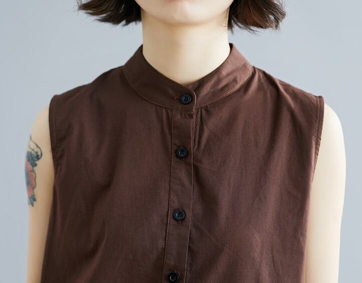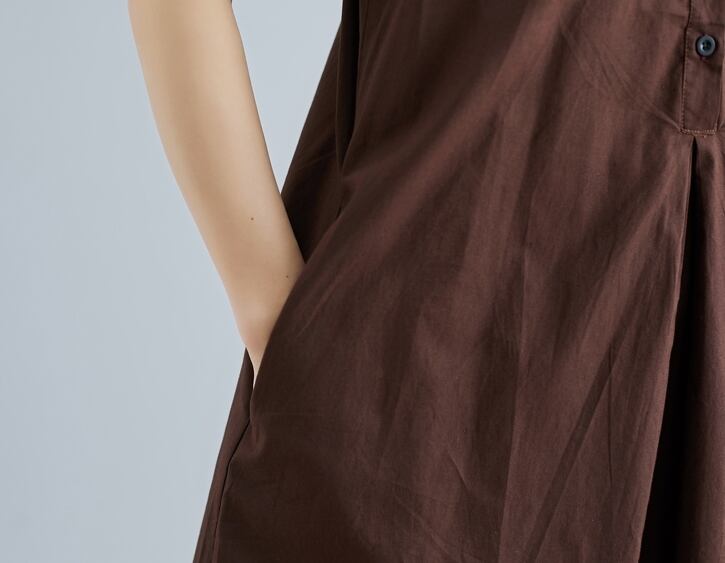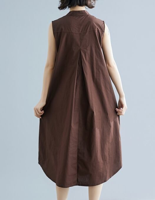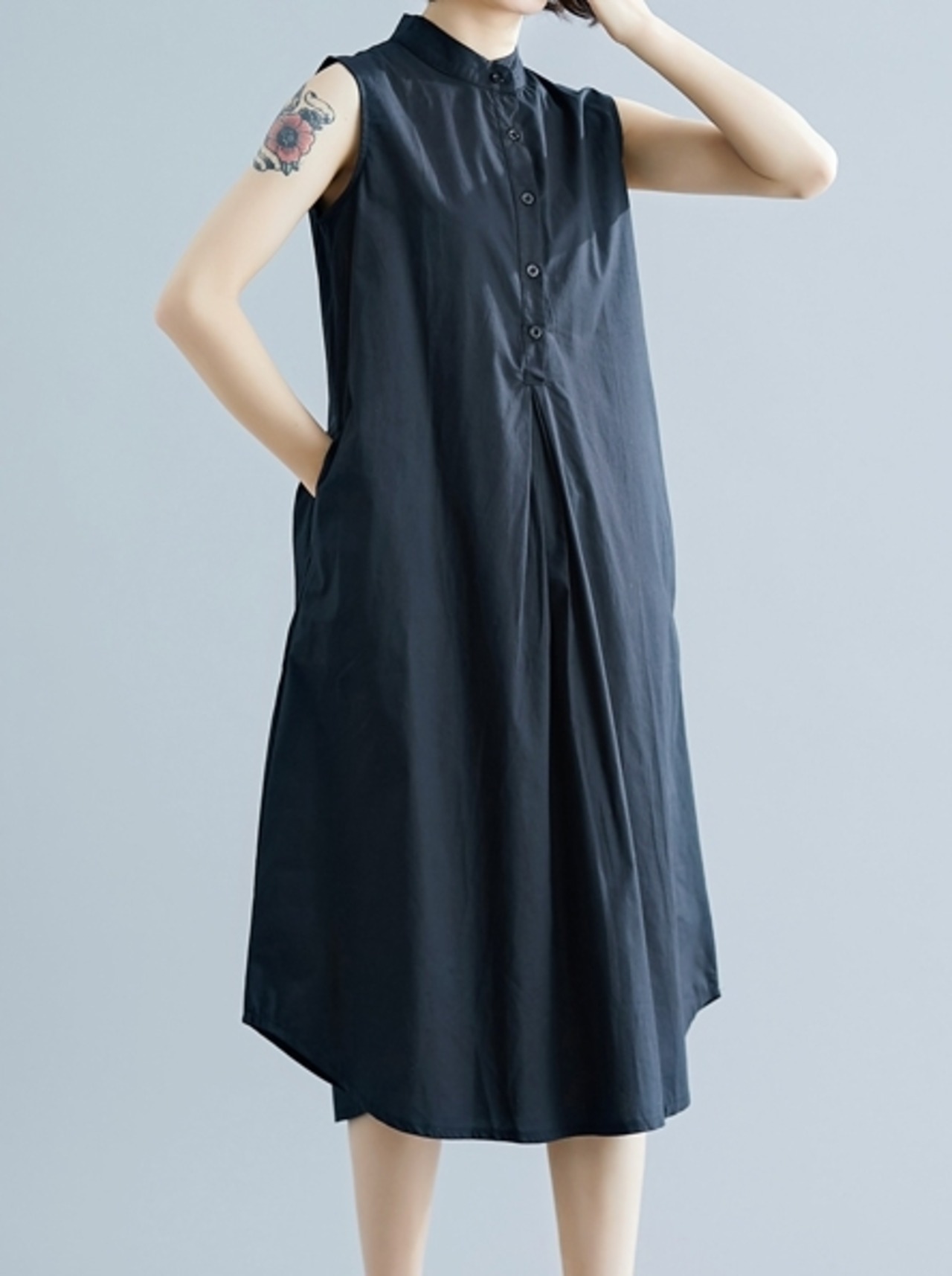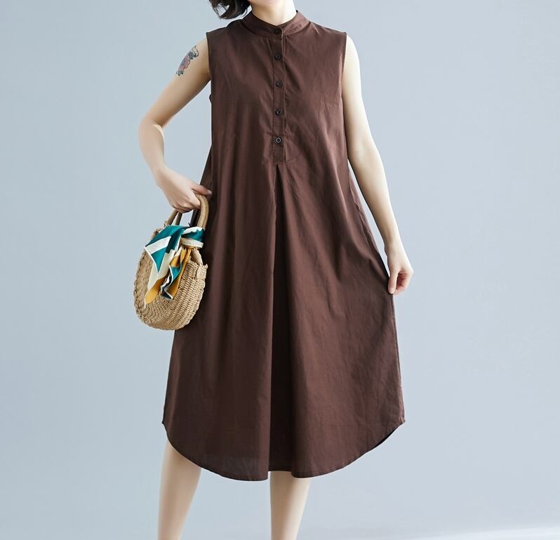 全2色 ワンピース ミモレ丈 ネックボタン スタンドカラー ゆったり シンプル タック入り カジュアル ノースリーブ 大人 デイリー 無地 お出かけ 春 夏